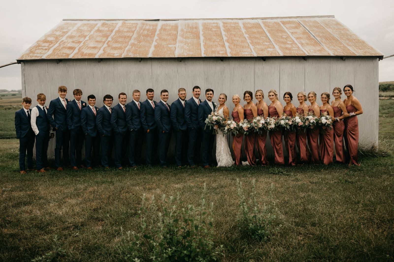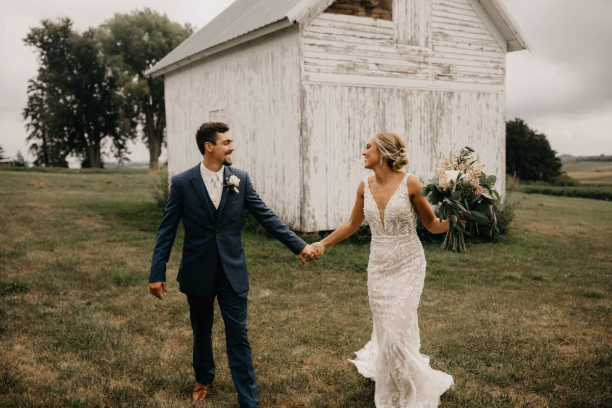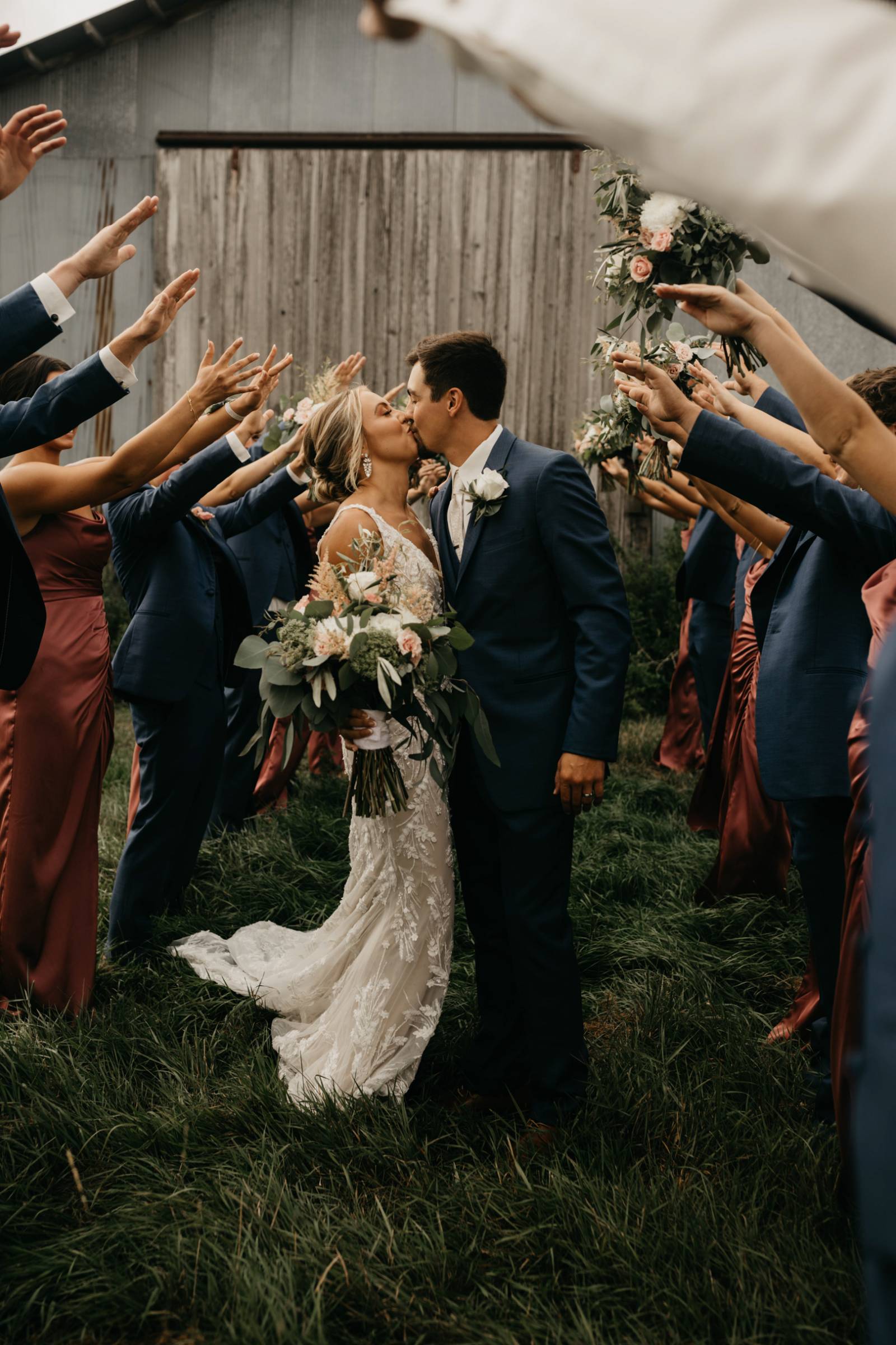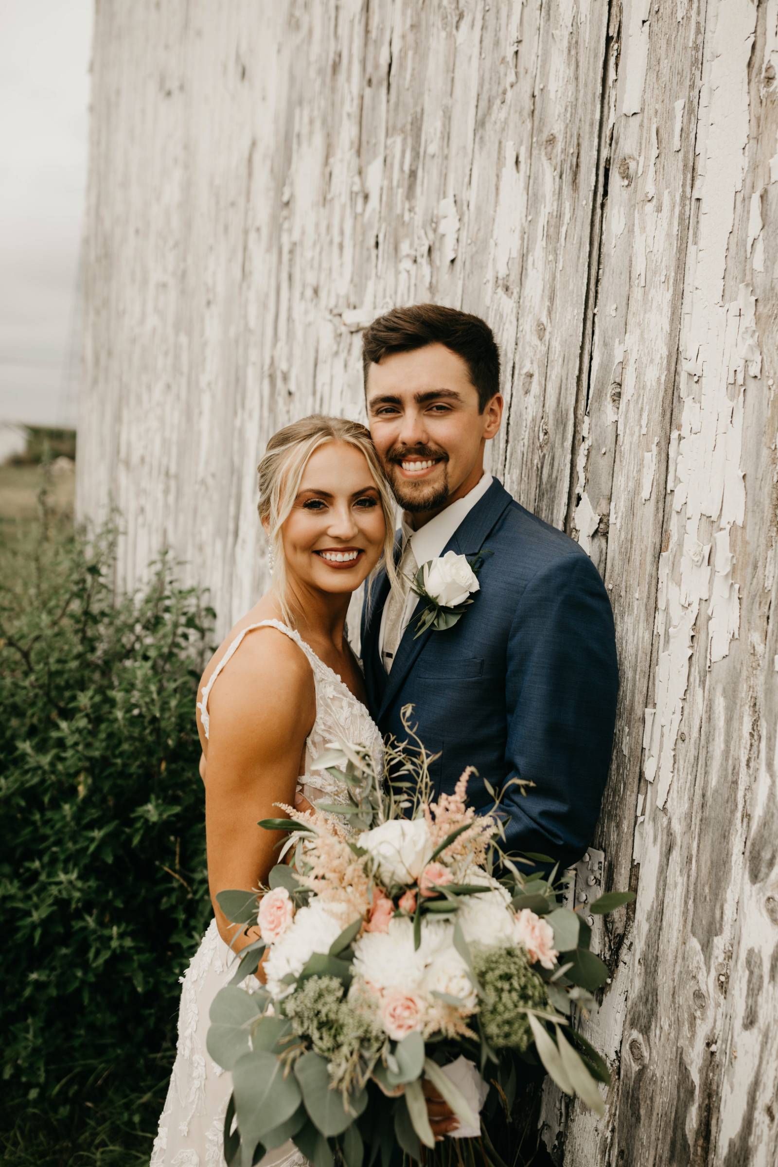 The couple chose Cresco Expo Center, a rustic venue, for the reception space of their small-town chic wedding, and a color palette of navy, mauve, blush, and white.