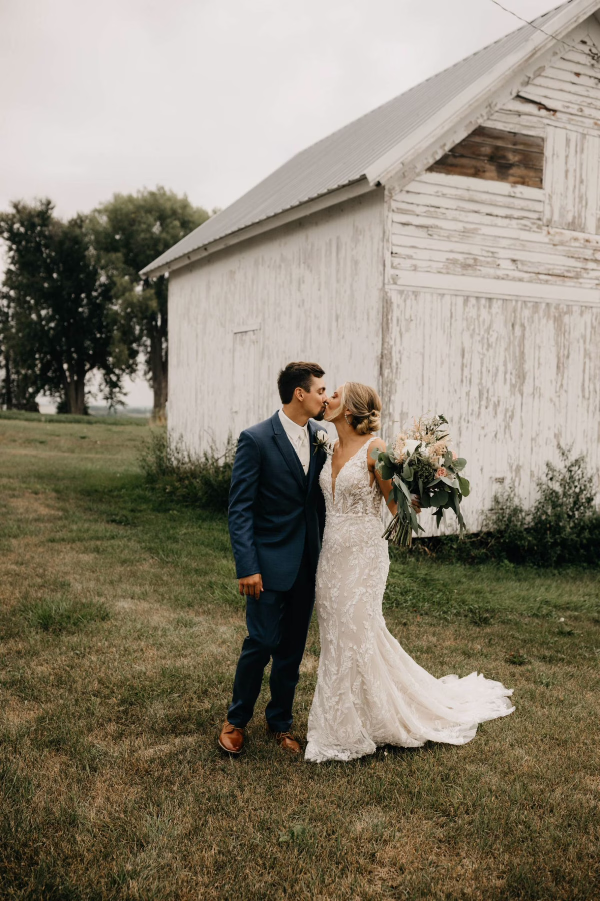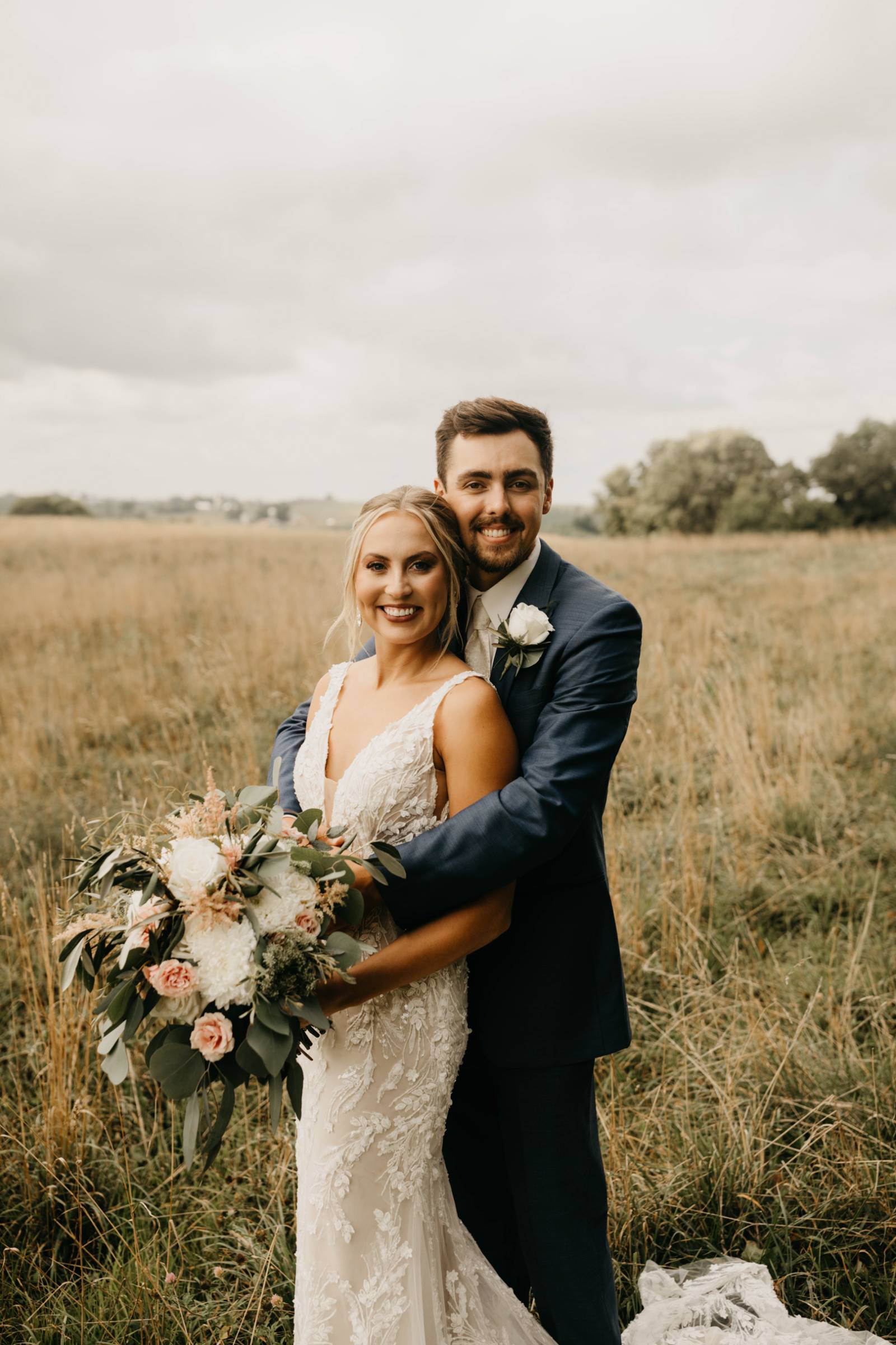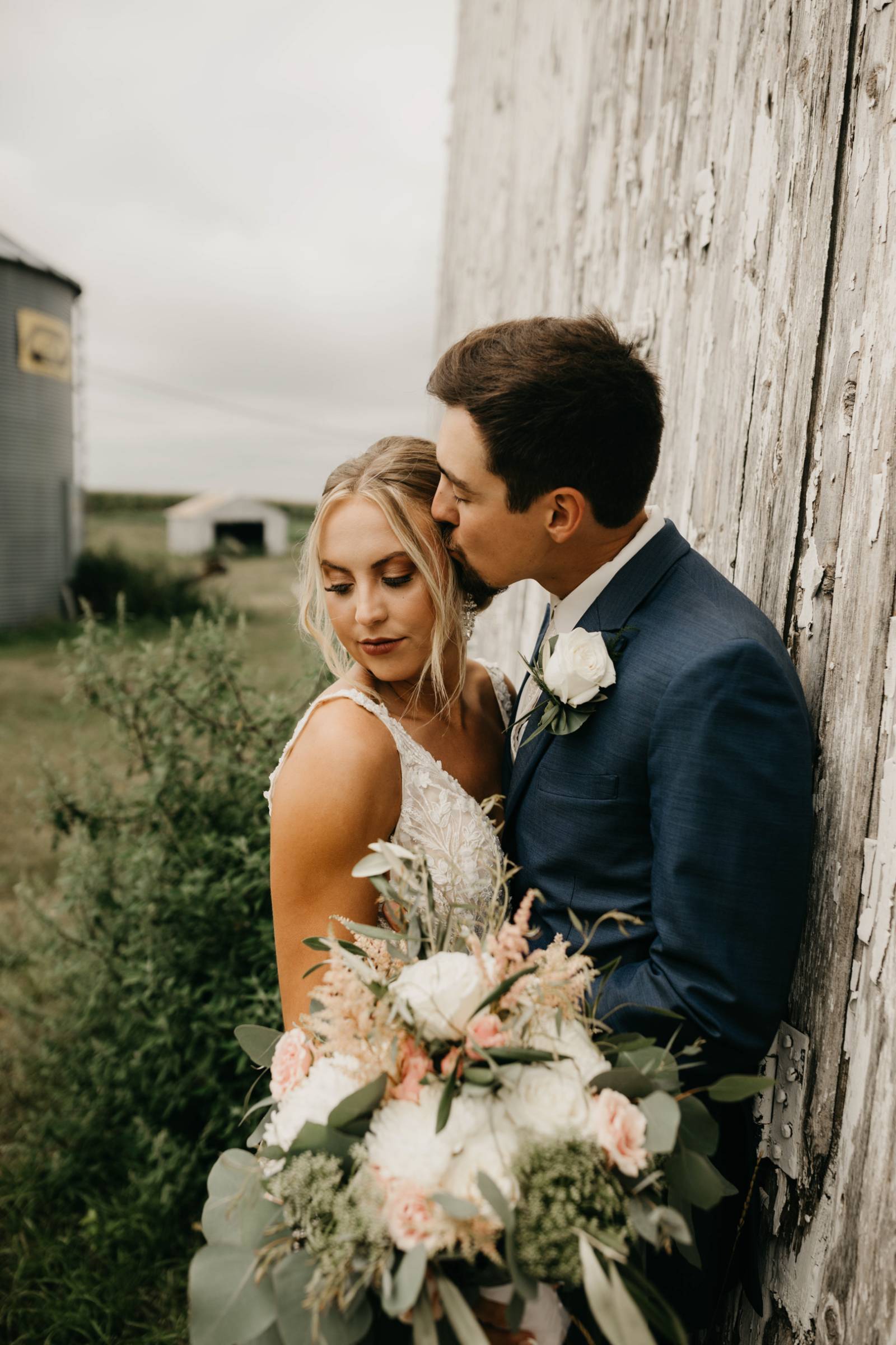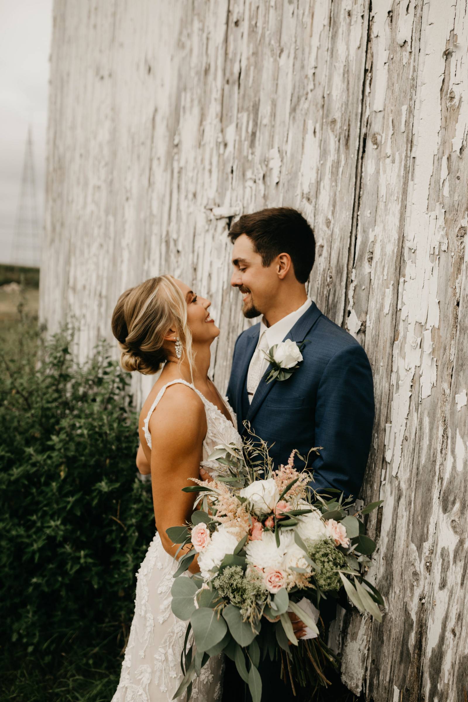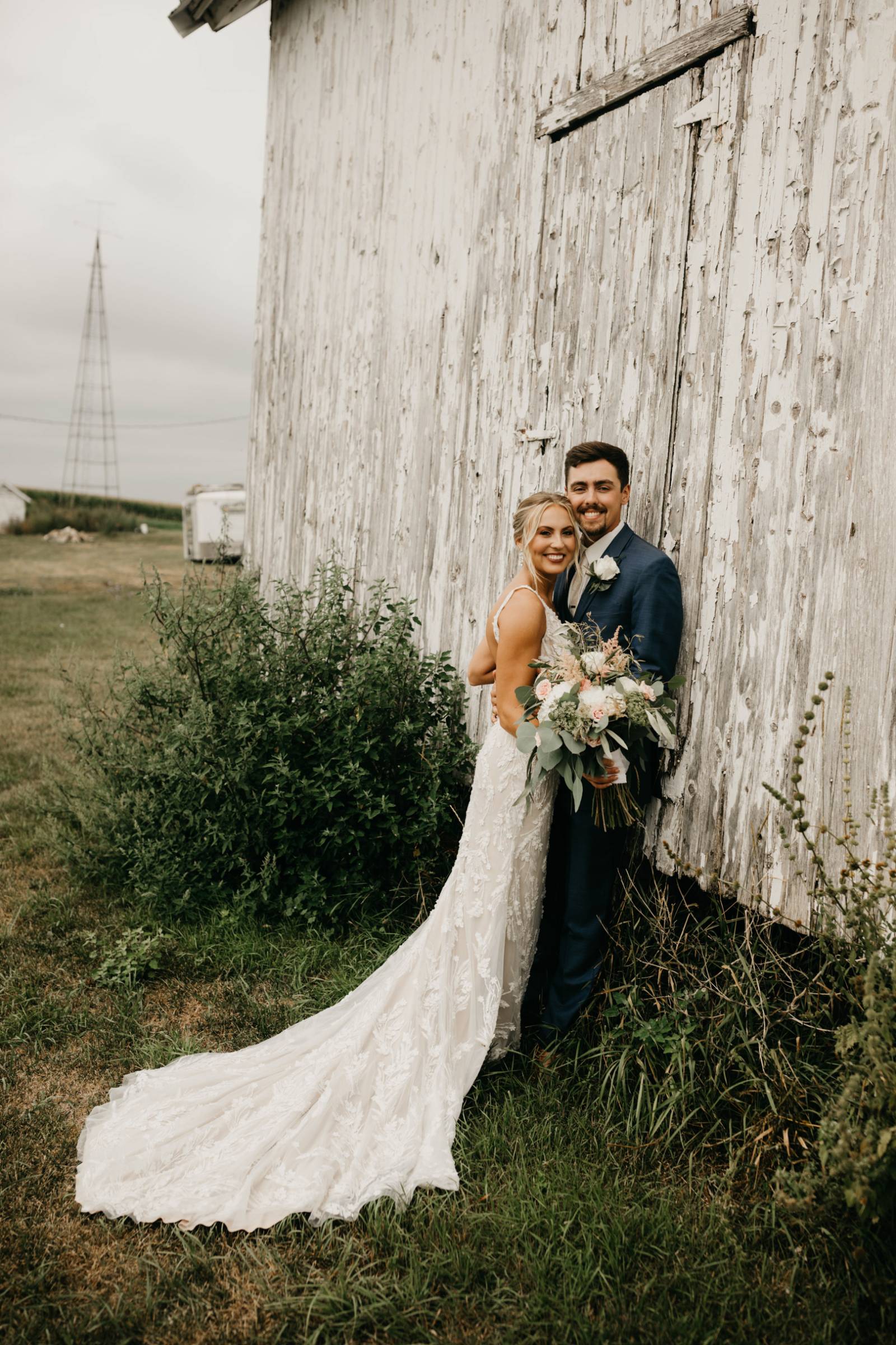 The couple chose Cresco Expo Center, a rustic venue, for the reception space of their small-town chic wedding, and a color palette of navy, mauve, blush, and white.
