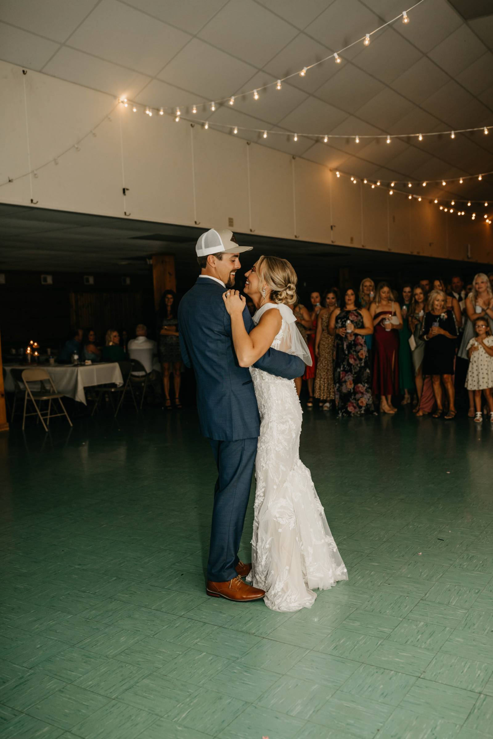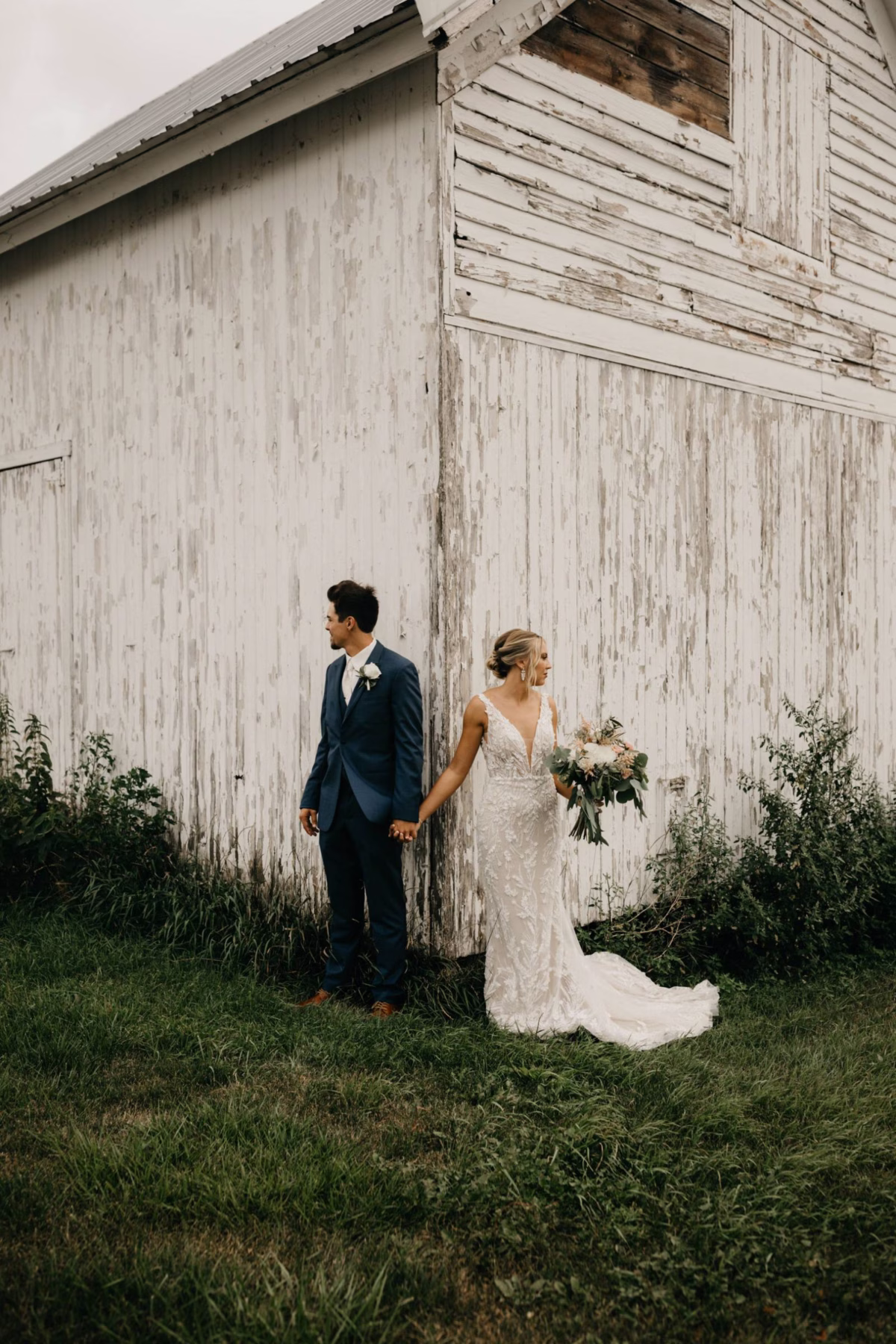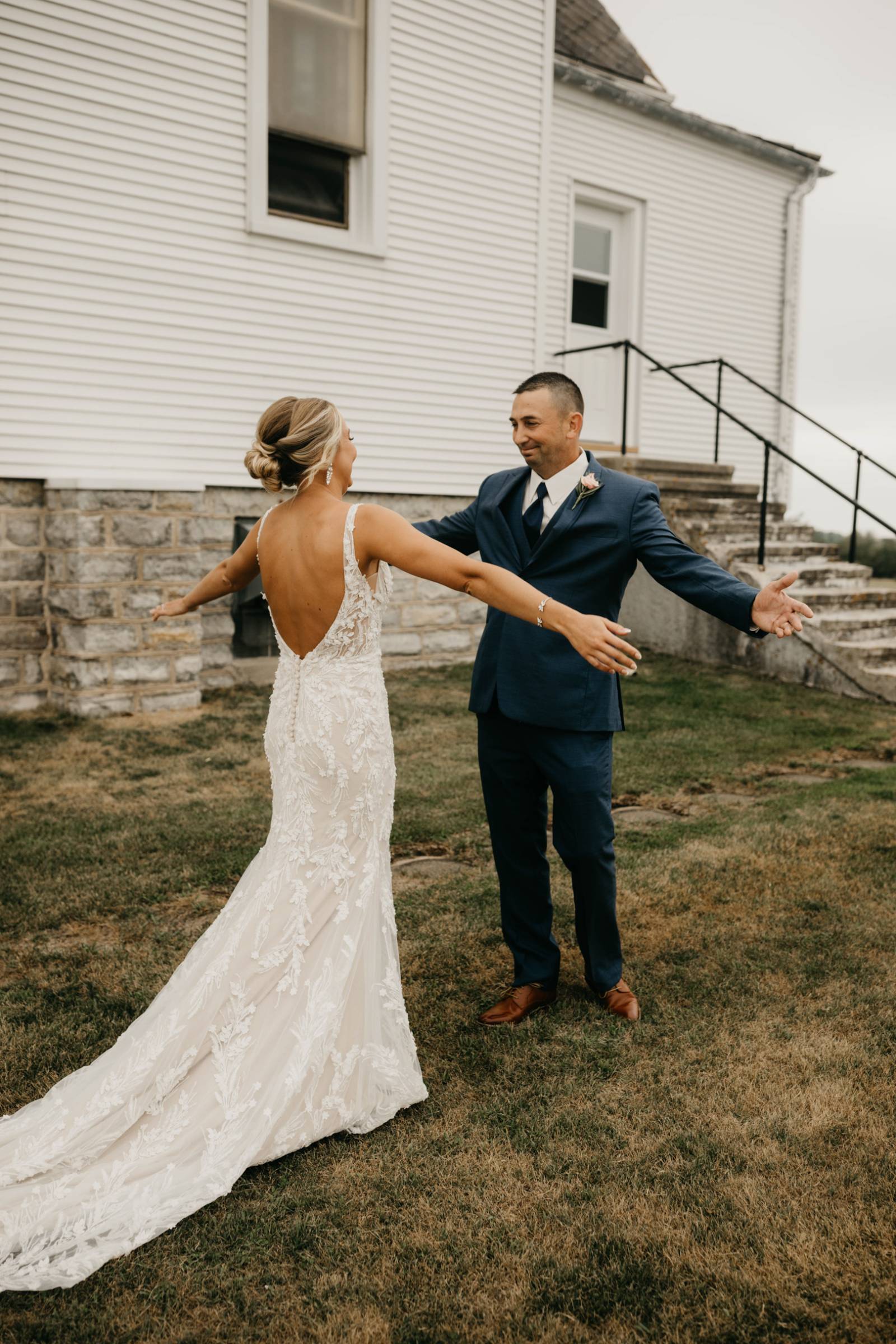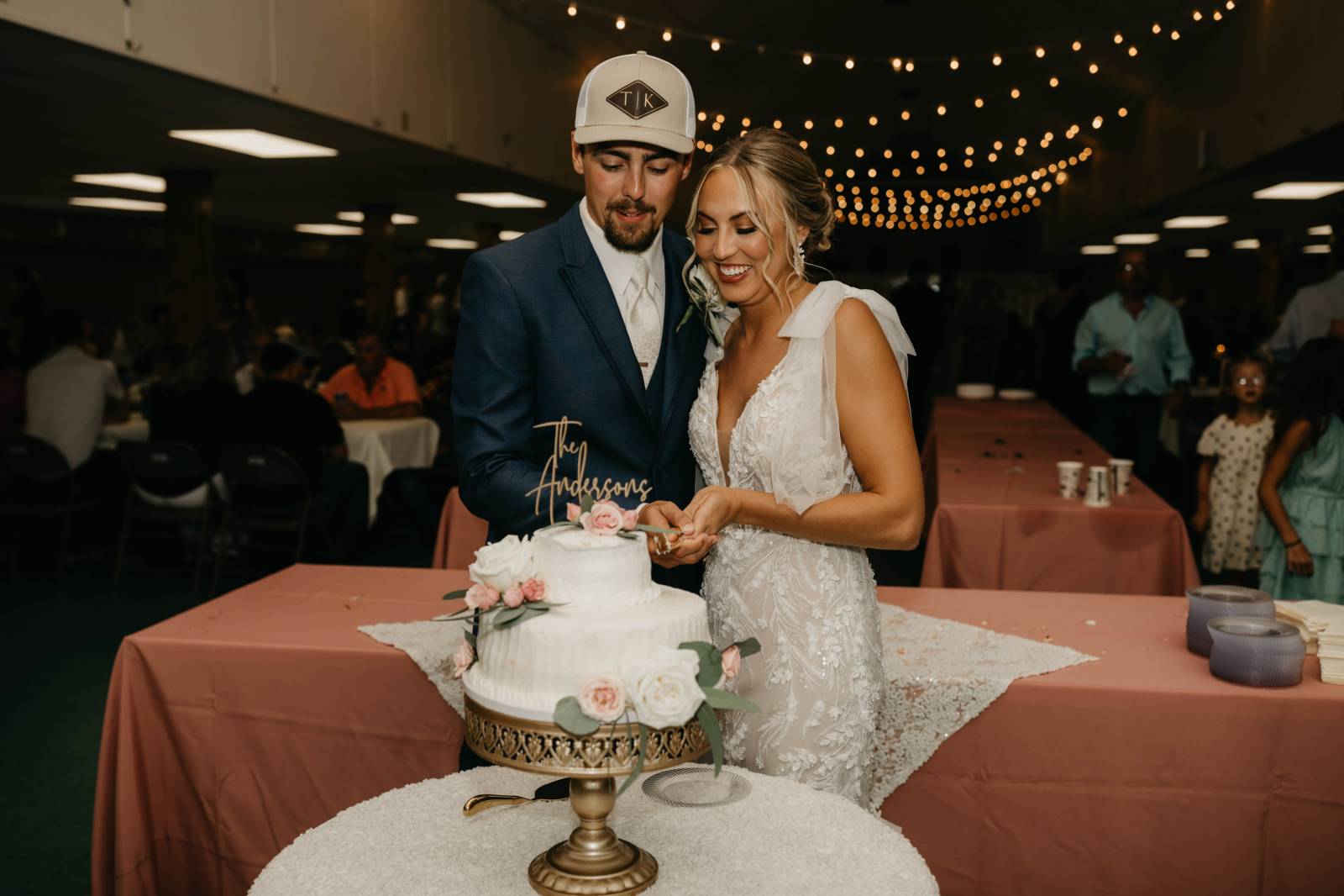 The couple chose Cresco Expo Center, a rustic venue, for the reception space of their small-town chic wedding, and a color palette of navy, mauve, blush, and white.