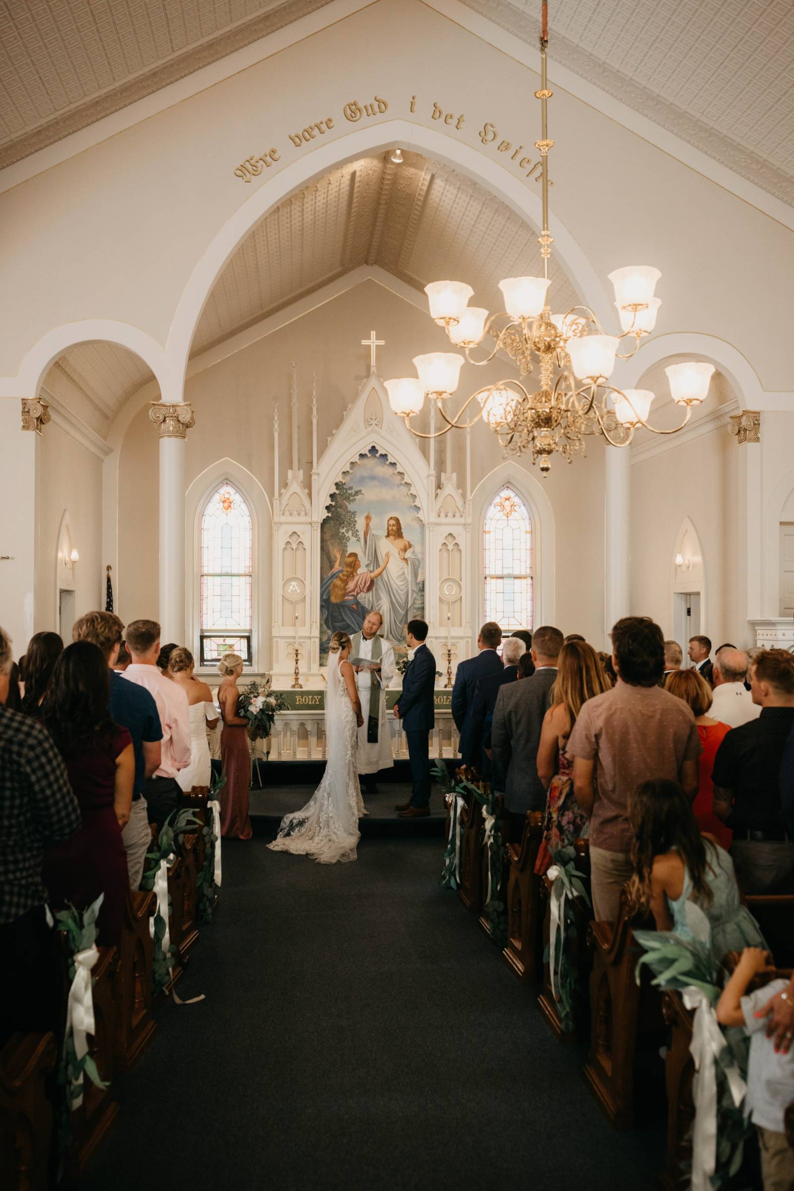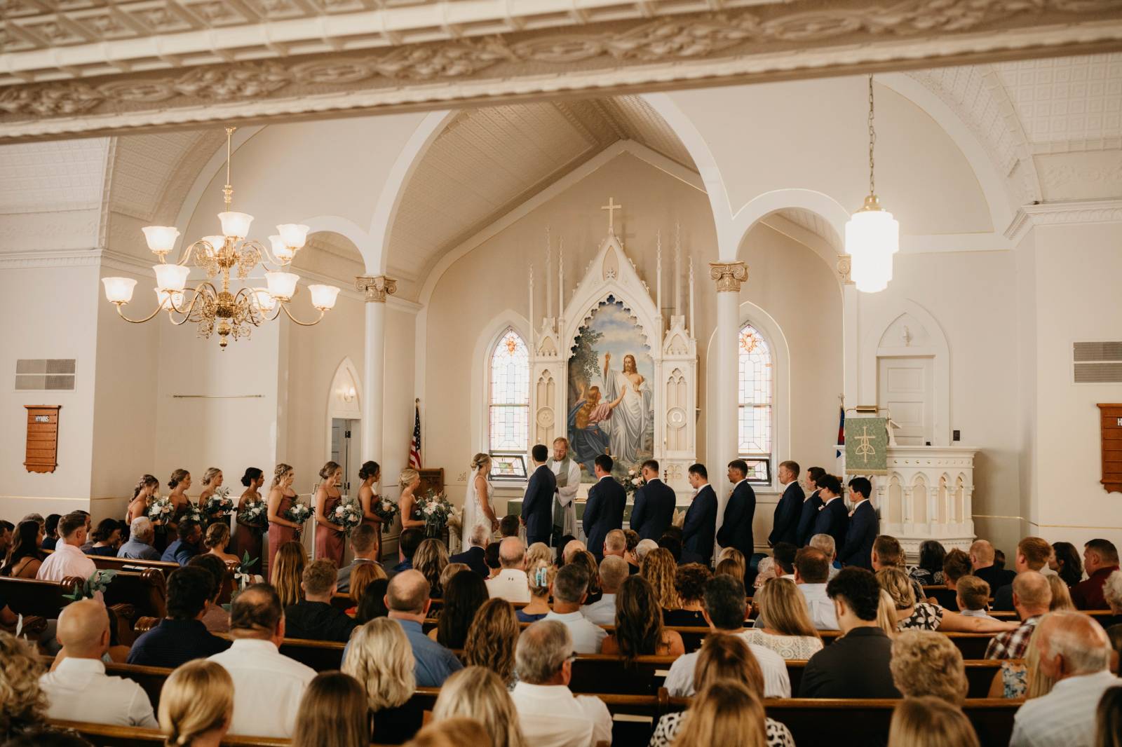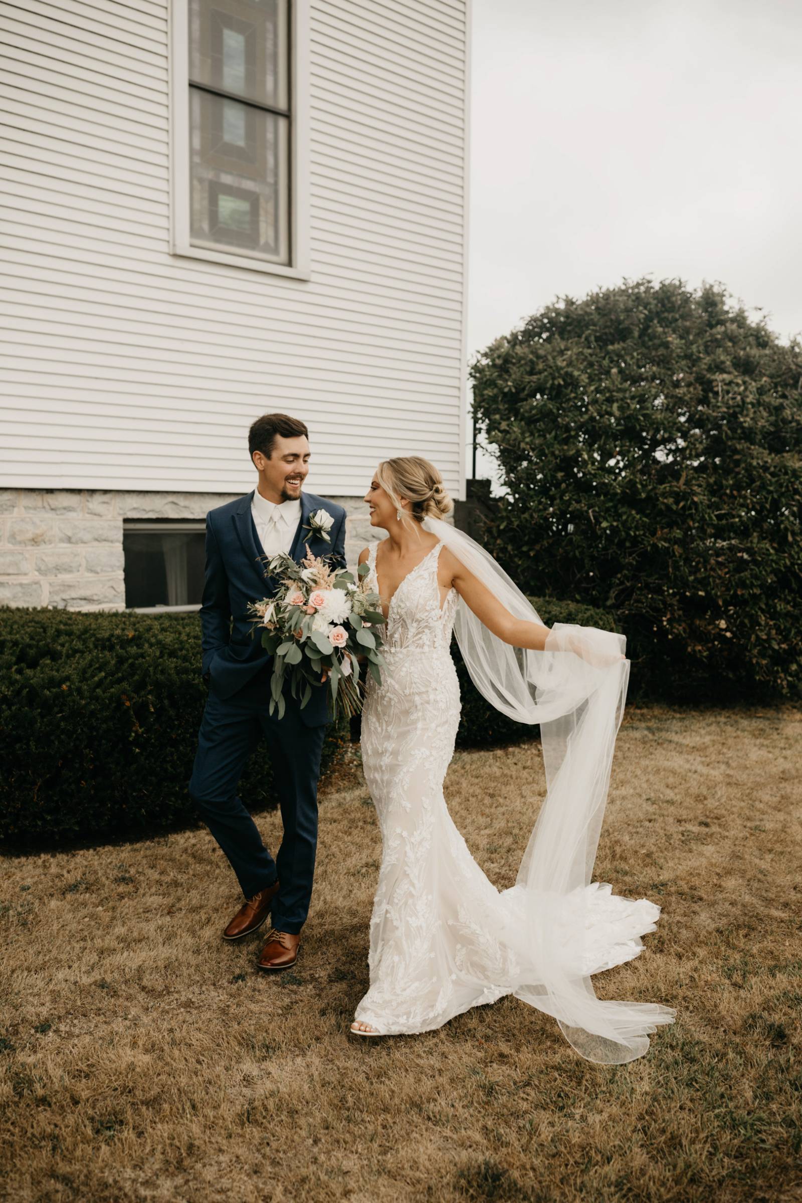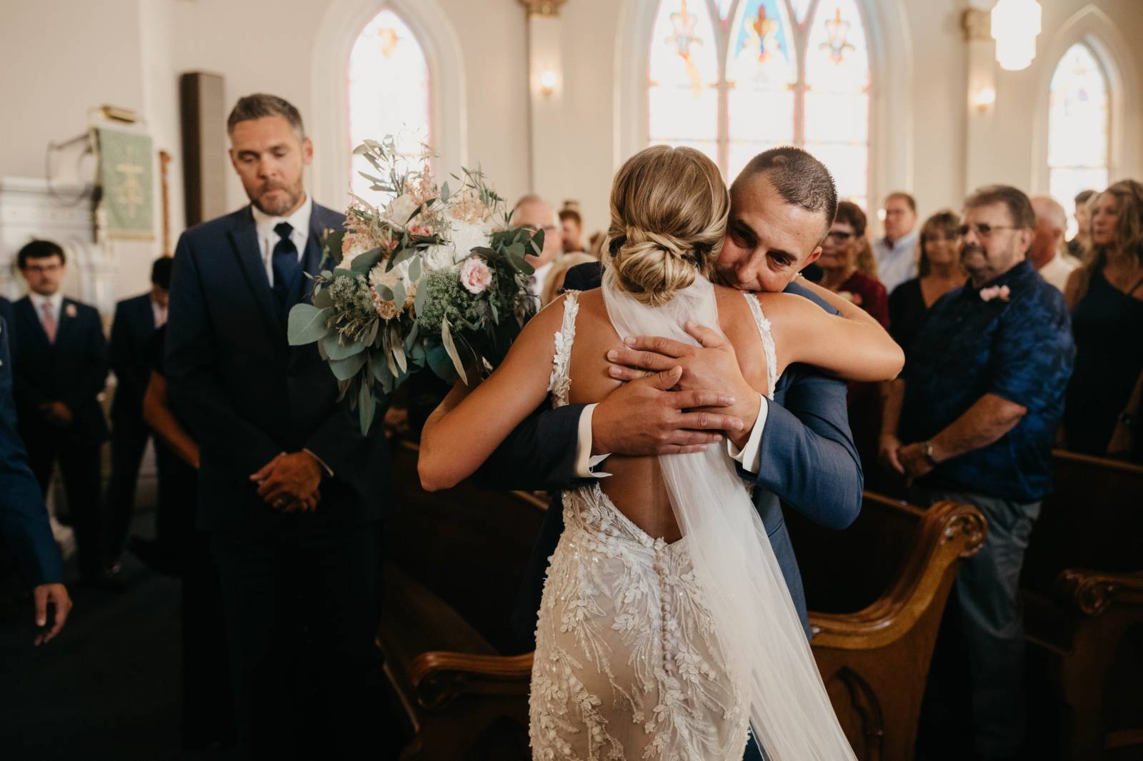 The couple chose Cresco Expo Center, a rustic venue, for the reception space of their small-town chic wedding, and a color palette of navy, mauve, blush, and white.