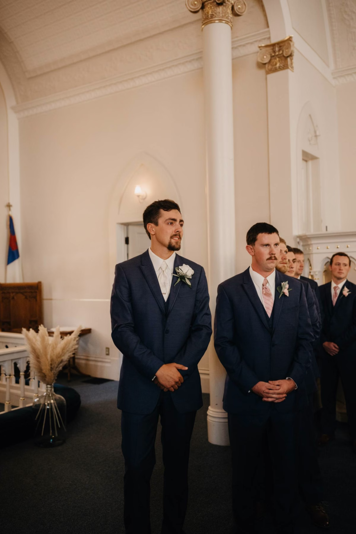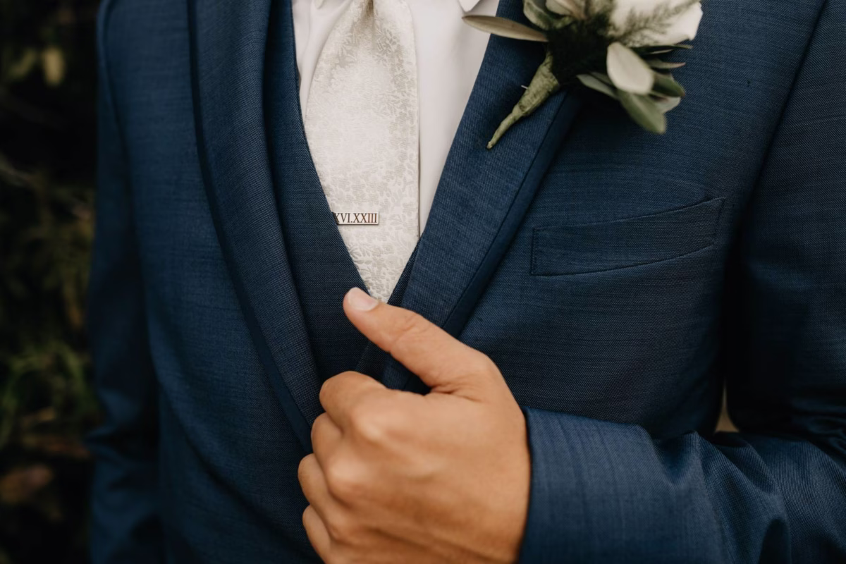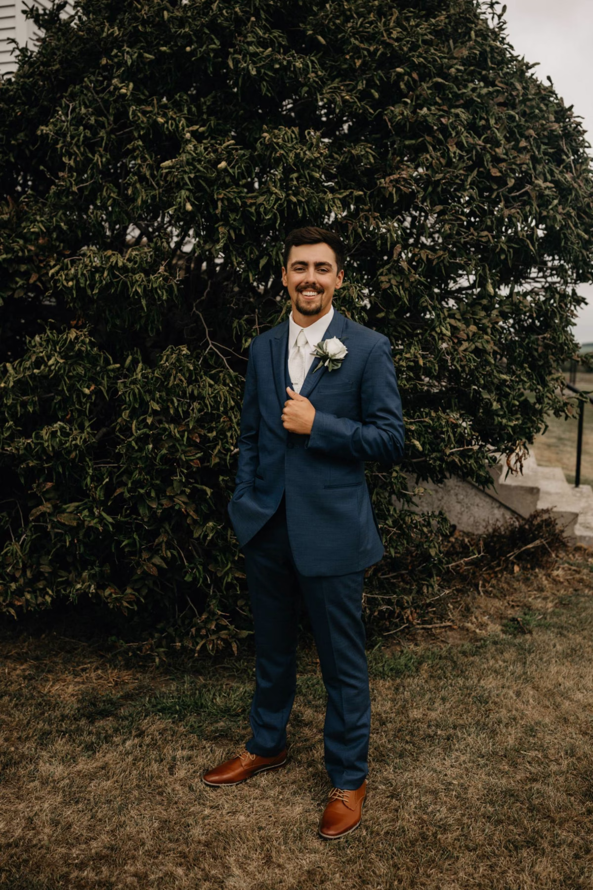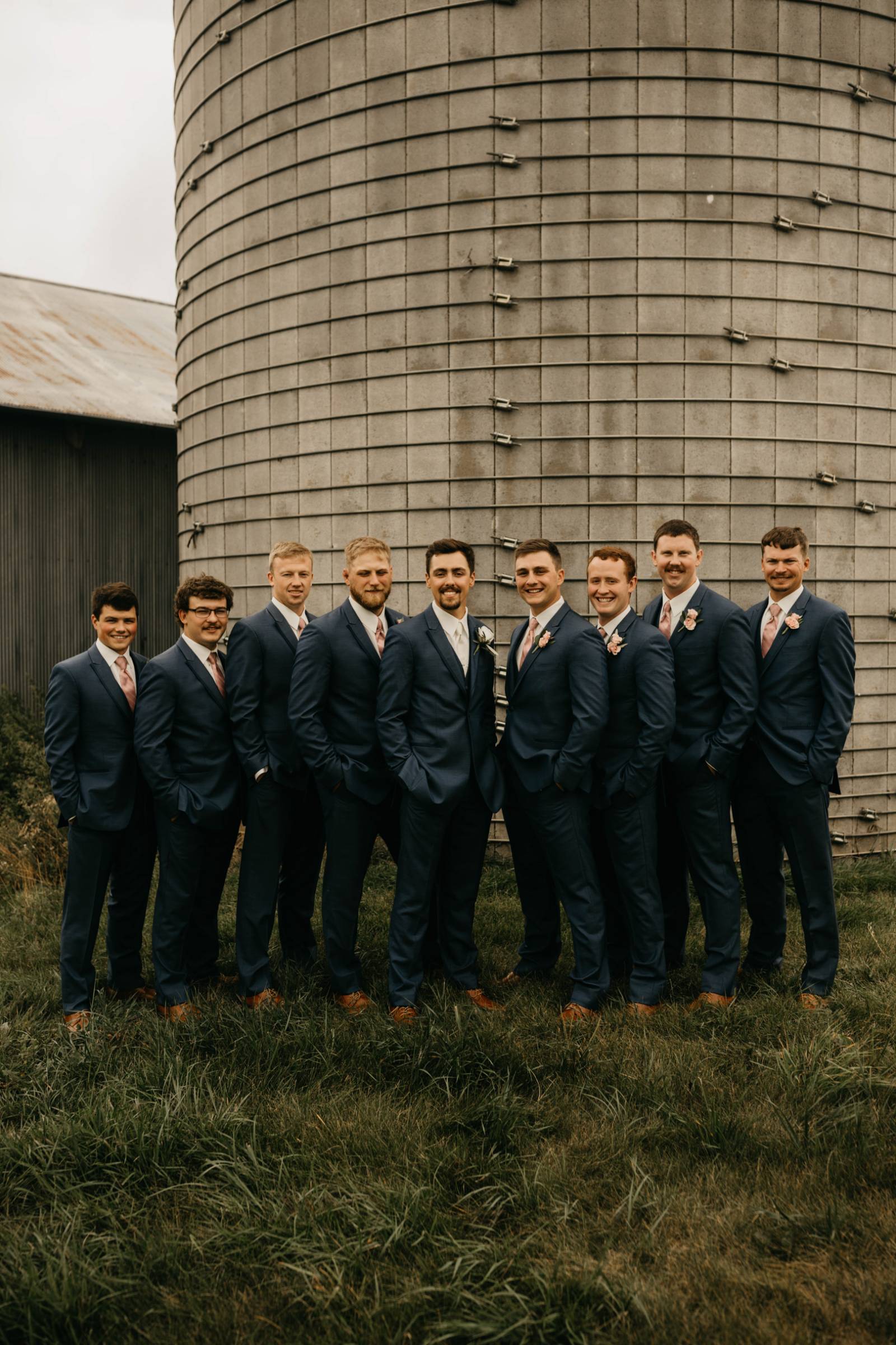 For himself and his groomsmen, Tye selected navy suits from Leuthold Clothing Store. The whole look also included navy vests, white undershirts, brown shoes, and ties. Tye wore a white tie and boutonniere, while his groomsmen accessorized with matching blush ties and smaller blush boutonnieres.