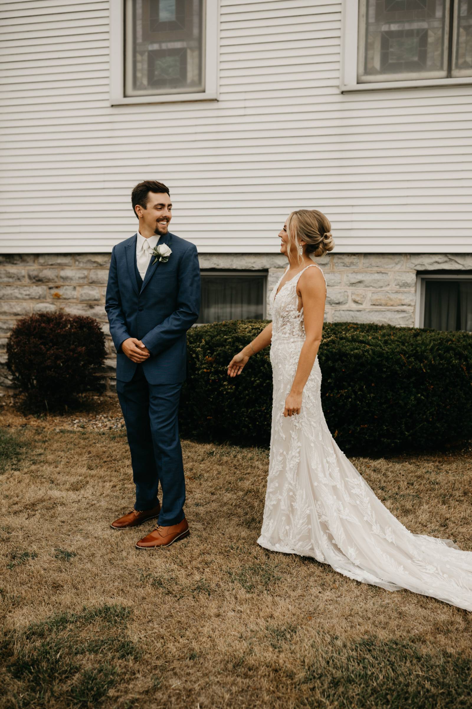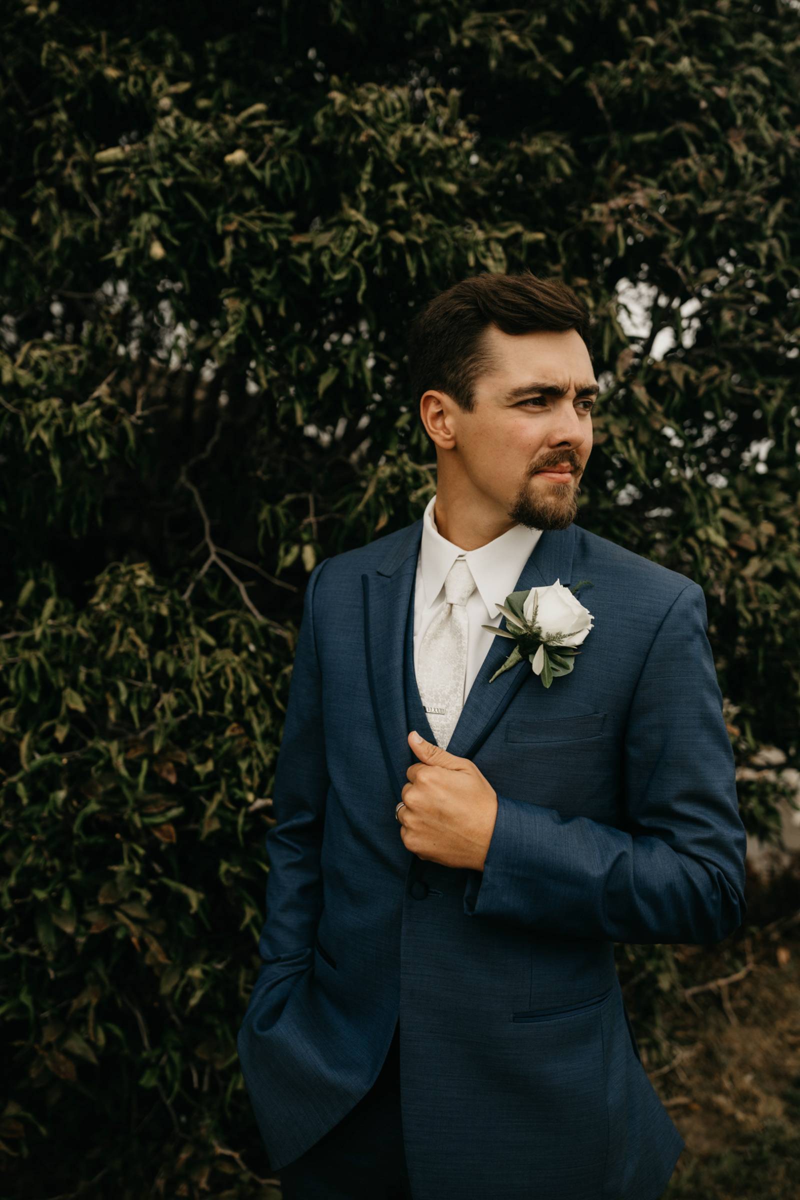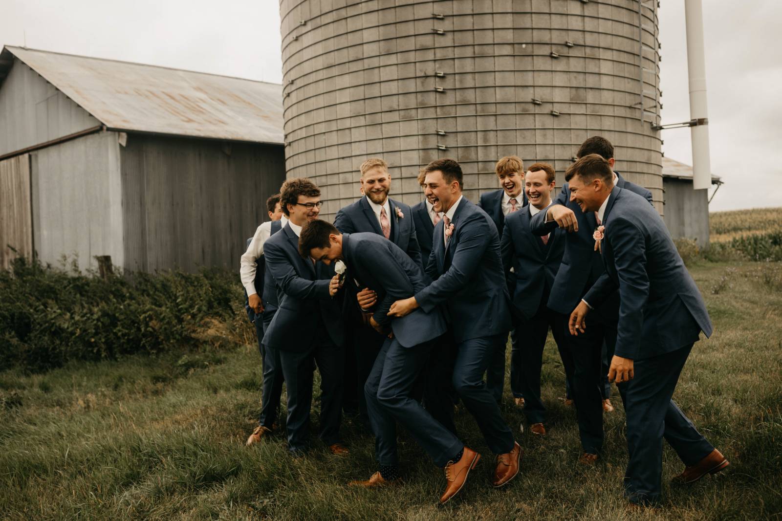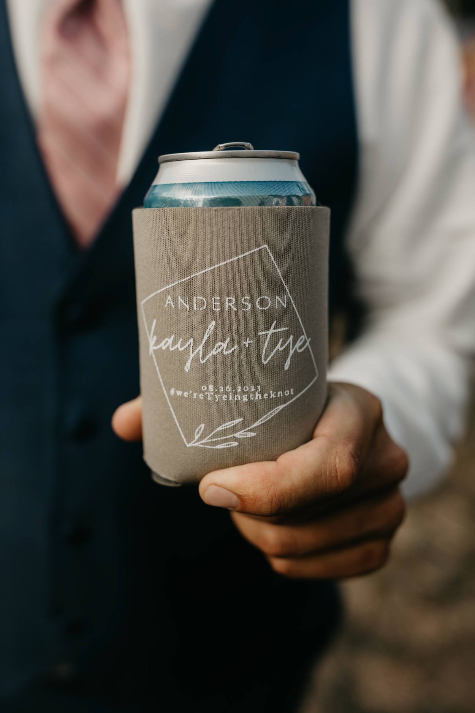 For himself and his groomsmen, Tye selected navy suits from Leuthold Clothing Store. The whole look also included navy vests, white undershirts, brown shoes, and ties. Tye wore a white tie and boutonniere, while his groomsmen accessorized with matching blush ties and smaller blush boutonnieres.