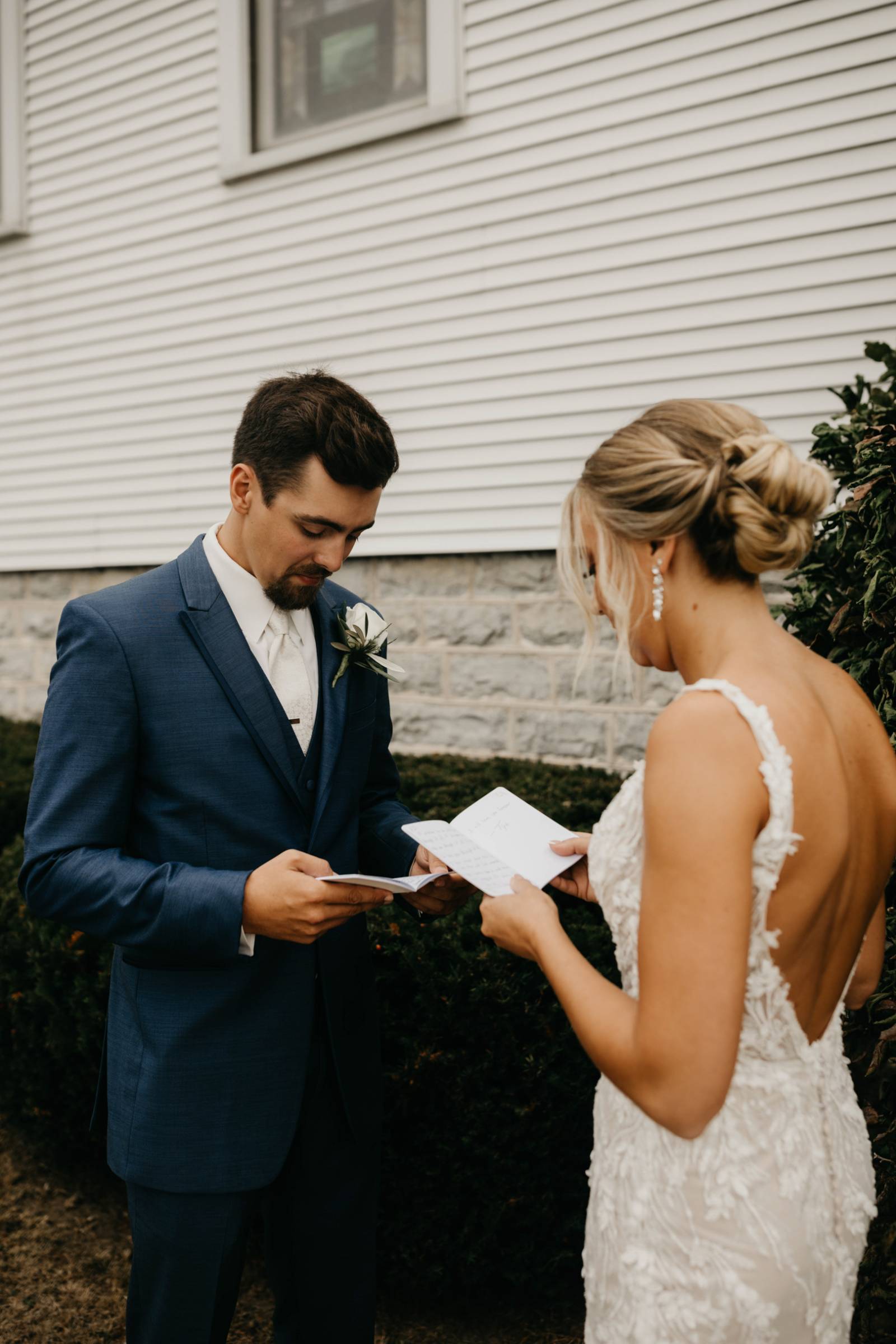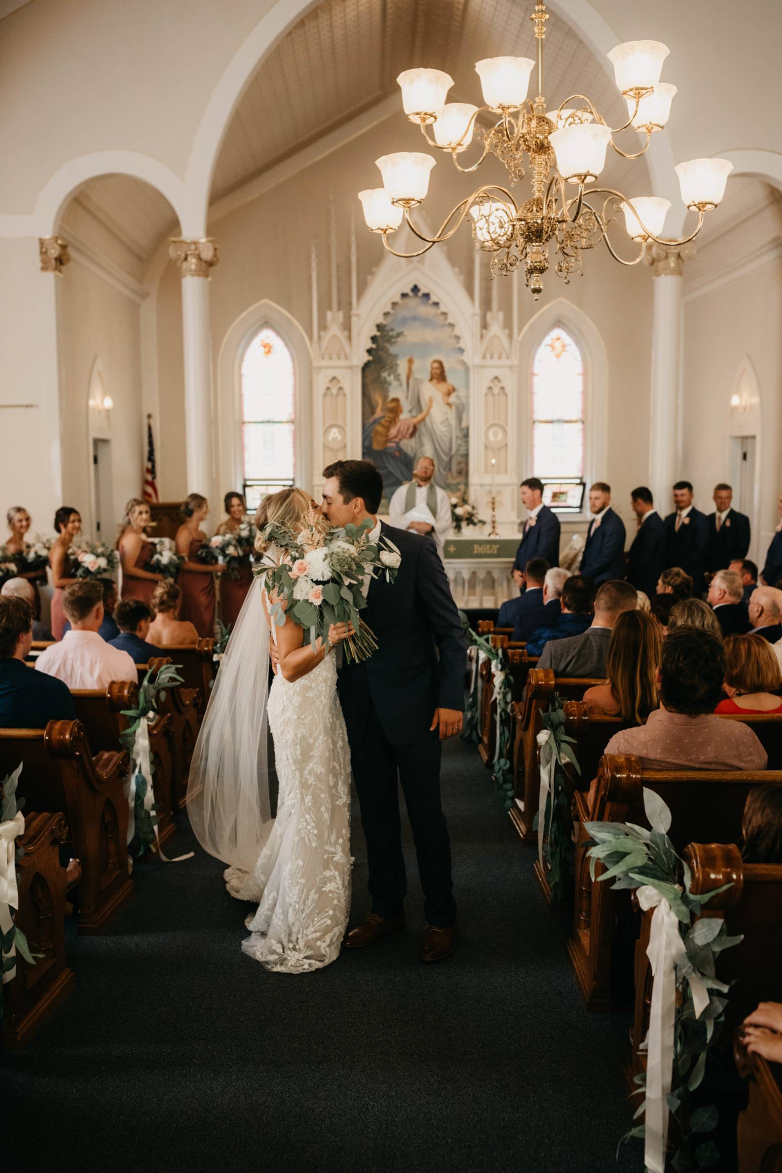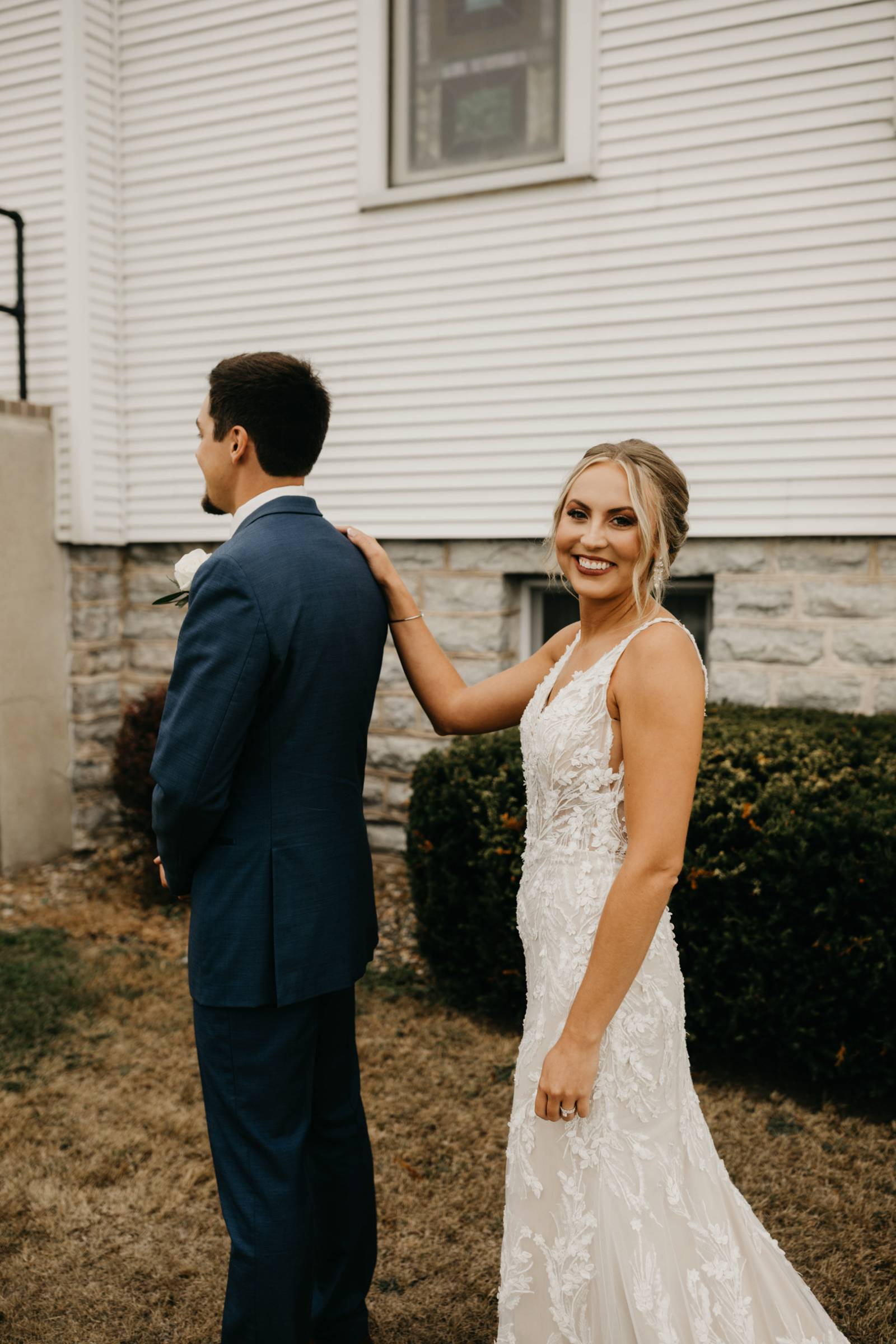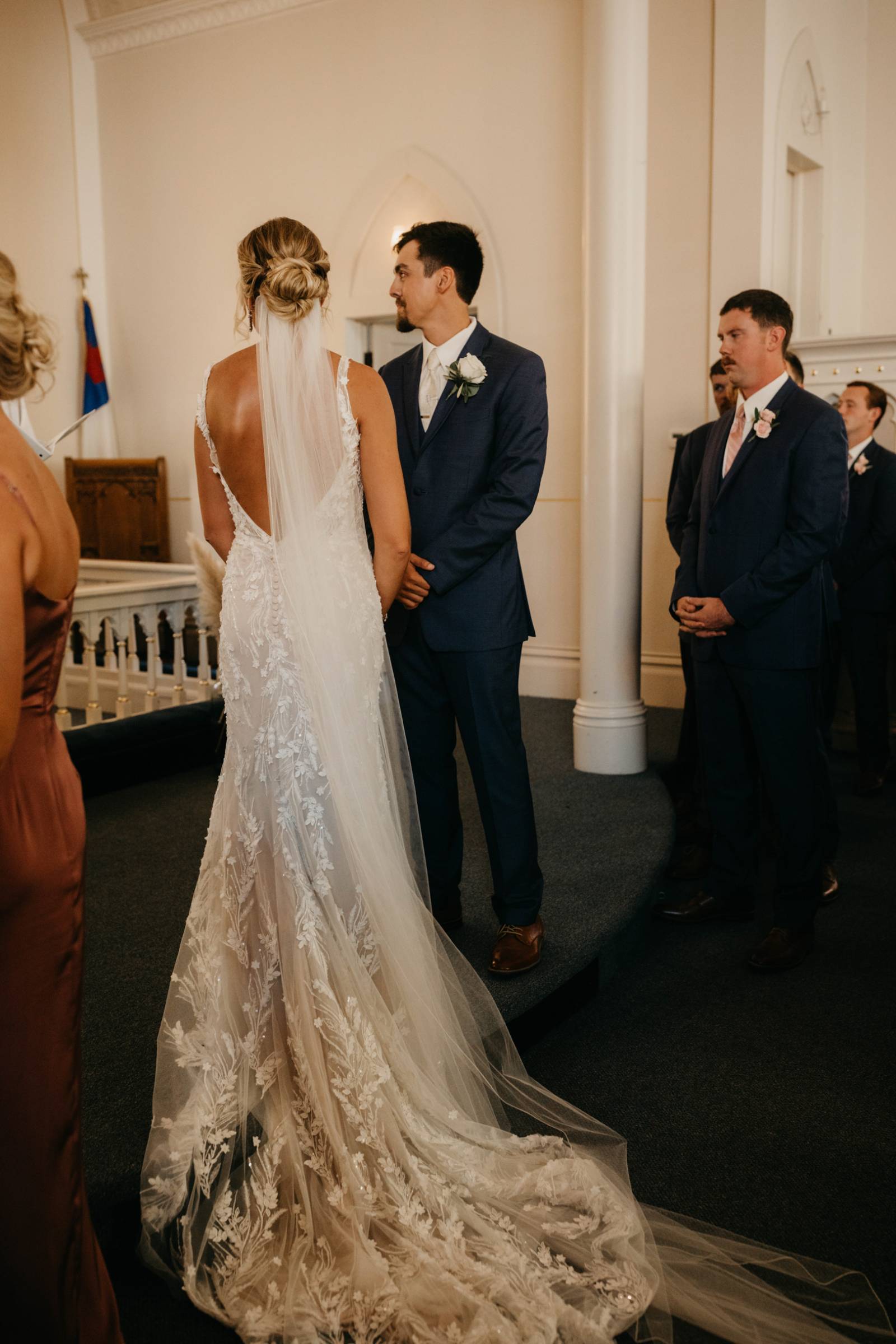 For himself and his groomsmen, Tye selected navy suits from Leuthold Clothing Store. The whole look also included navy vests, white undershirts, brown shoes, and ties. Tye wore a white tie and boutonniere, while his groomsmen accessorized with matching blush ties and smaller blush boutonnieres.