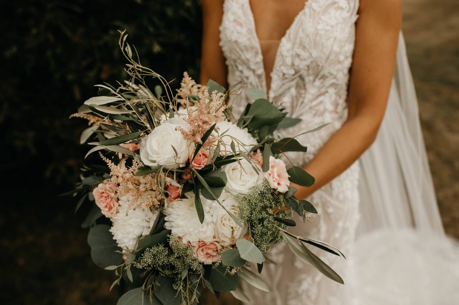 The bridesmaids wore matching mauve, satin, cowl-neck gowns, and each carried a bouquet similar to the bride's, composed of white roses, blush spray roses, chrysanthemums, astilbe, and eucalyptus greenery.