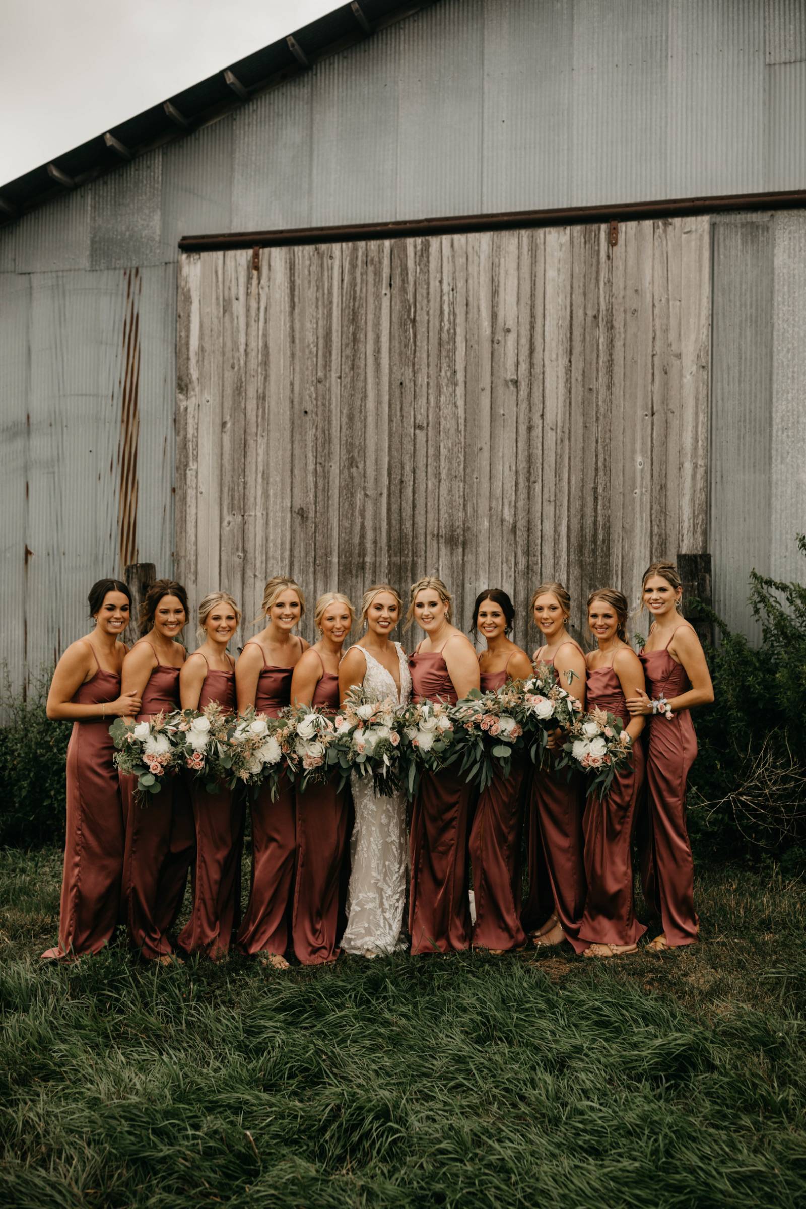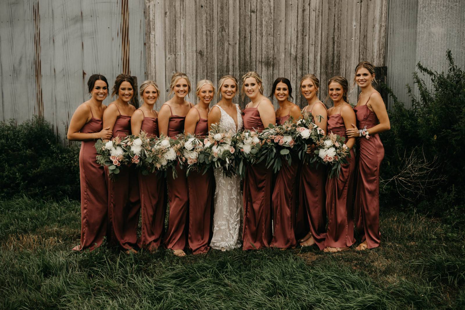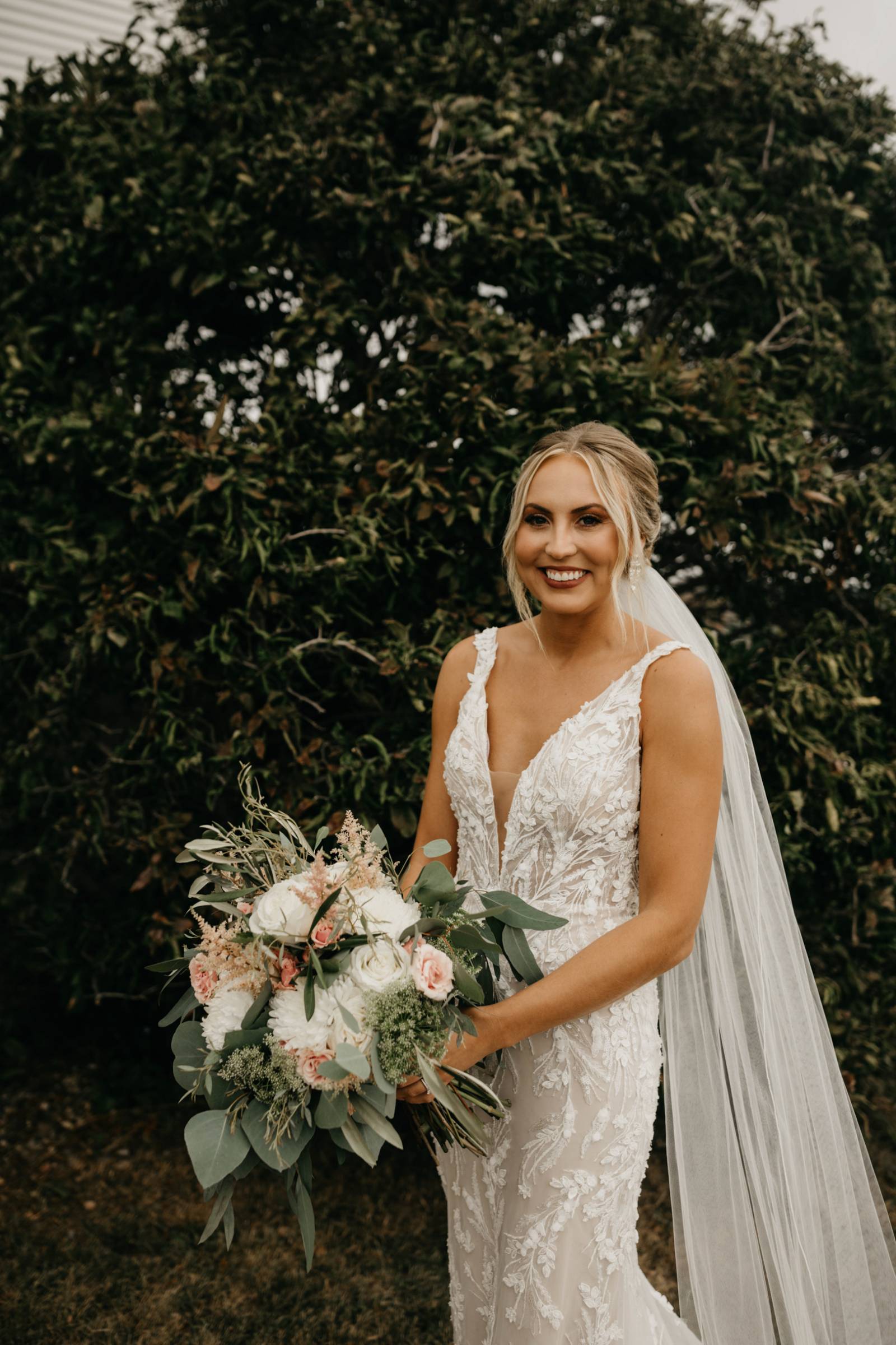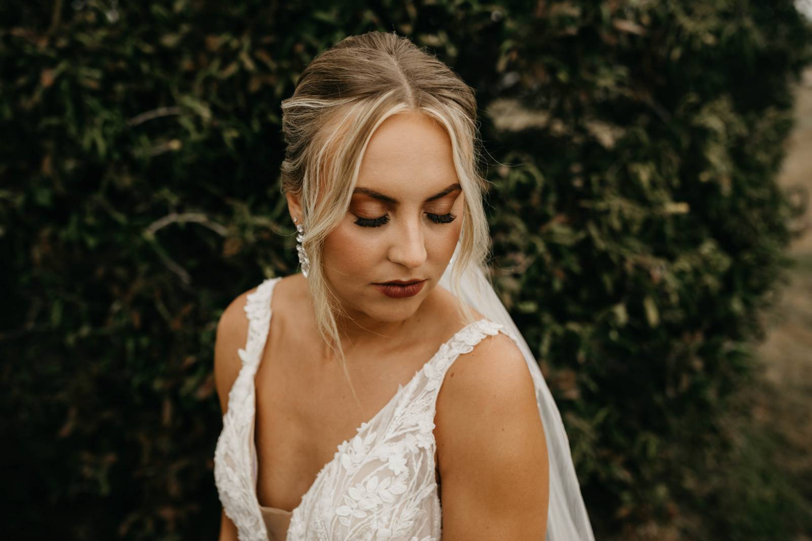 Amber Gramlich Esthetics crafted a warm, neutral glam makeup look for the bride. Her eyeshadow was composed of soft, smoky shades, and the look was completed with sculpted brows, rouged cheeks, and a dark mauve lip.