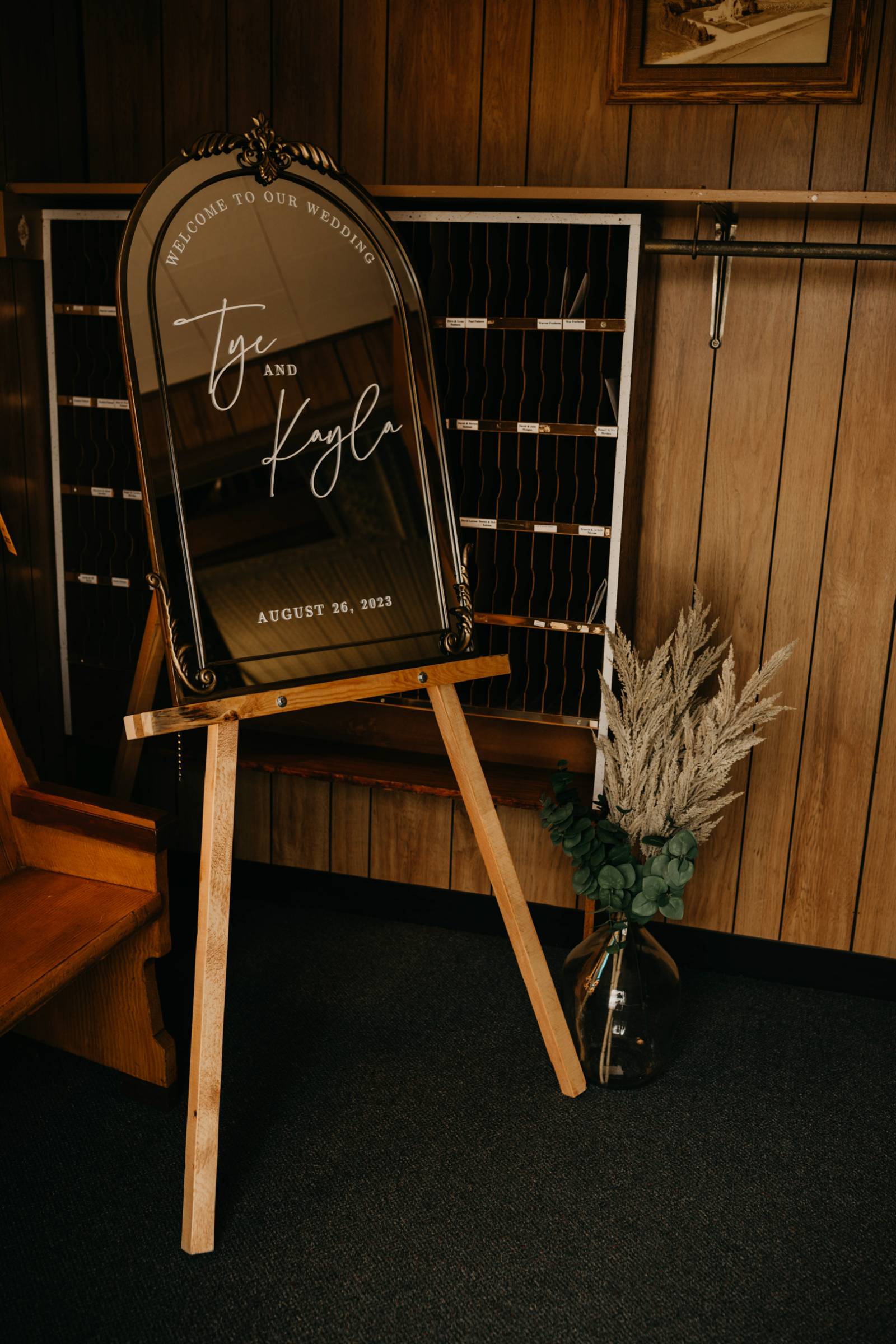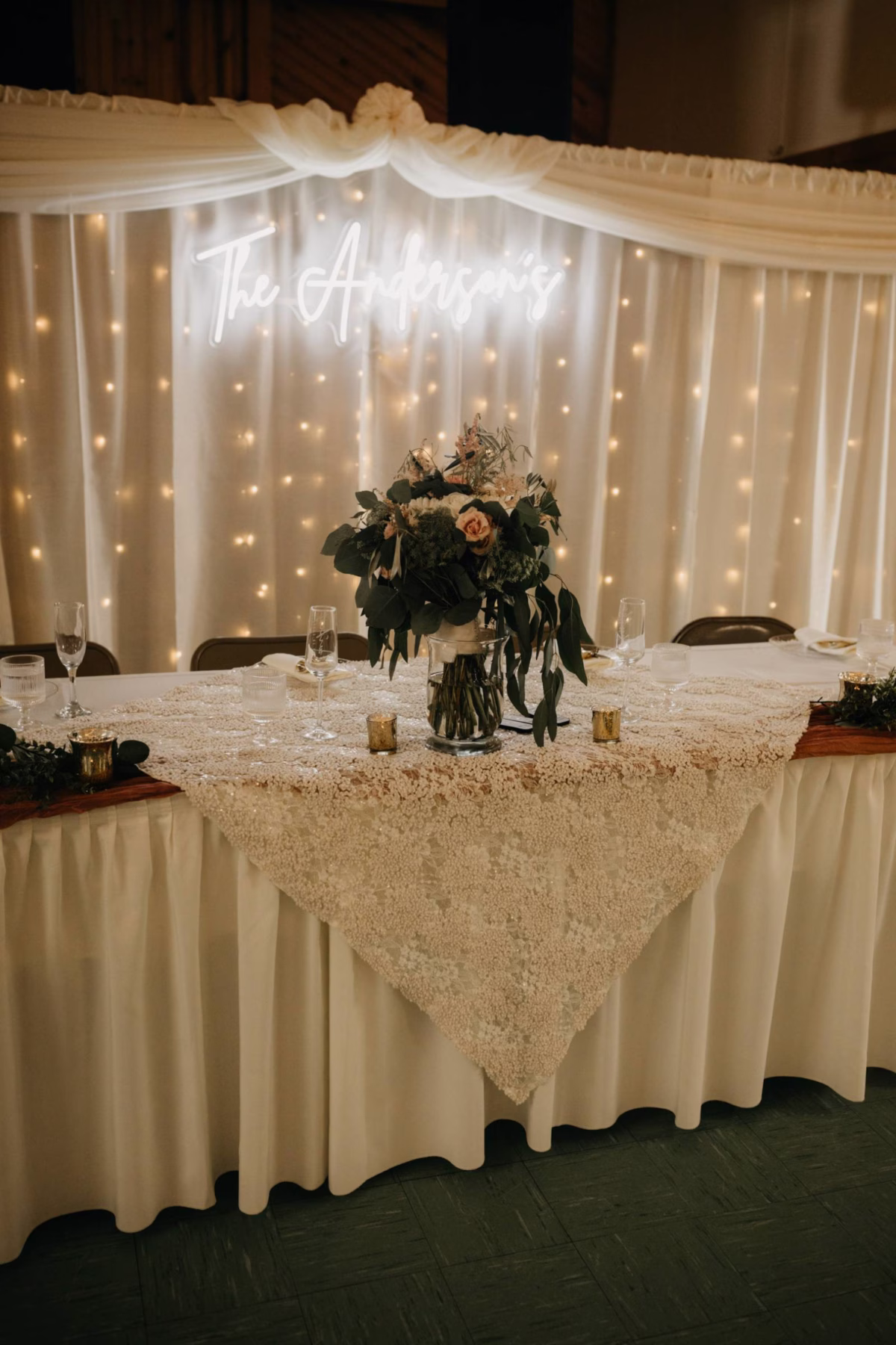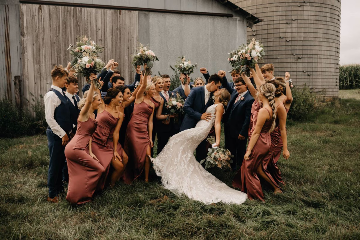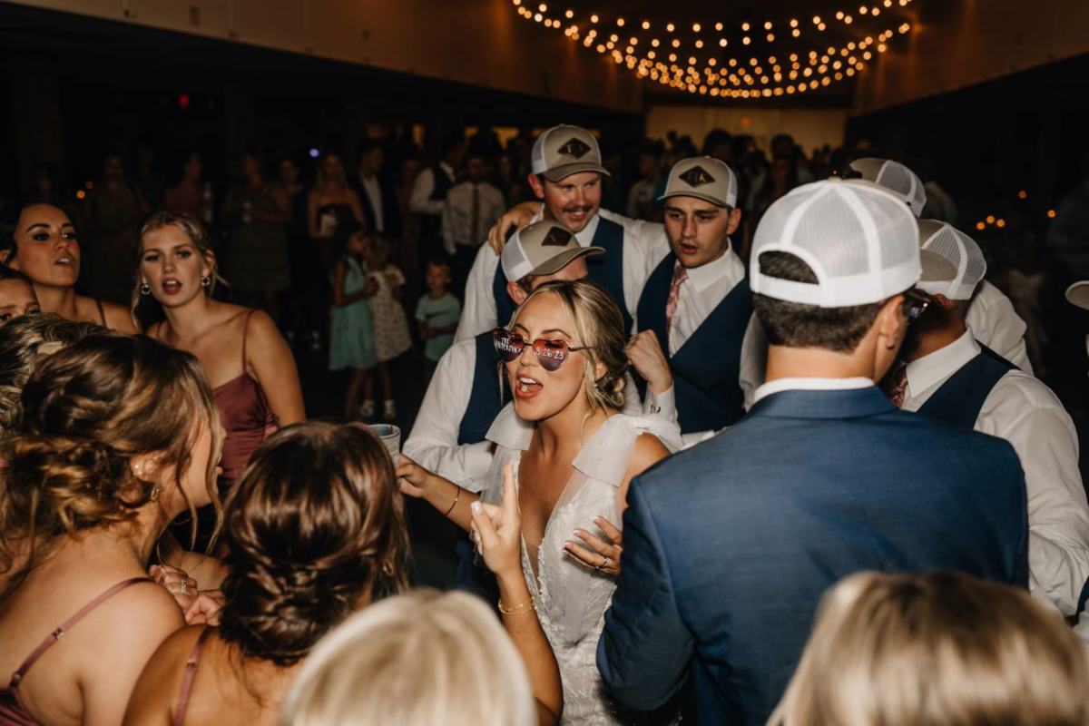 After tying the knot in a traditional church ceremony, the couple, their wedding party, and guests made their way back over to the Cresco Expo Center. Party Island Wedding and Party Rentals provided décor for the celebration, including linens and tablewares. Kayla & Tye also had custom elements like a cake topper, neon sign, sunglasses, and koozie favors for guests.