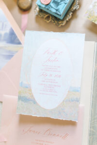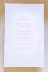 Pale pinks, feminine florals, and romance novels took center stage in every beautiful stationery and signage element from LK Bridal Studio. A vellum-wrapped invitation tied with pink ribbon secured by a shimmery pink rose wax seal set the tone. Inside, the invitation featured deckled edges on the top and bottom, with a calligraphic script font and serif font enclosed within an oval frame and surrounded by floral details reminiscent of oil paintings from the Impressionist art movement.