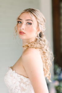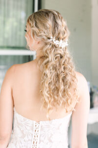 The bride's hair, styled by A Curl's Best Friend, beautifully captured the whimsical essence of this literary cottagecore wedding. Inspired by fairytale illustrations and Renaissance fairy art, the stylist created a dreamy half-up/half-down style with soft, bouncy curls, bringing an ethereal touch to her look.