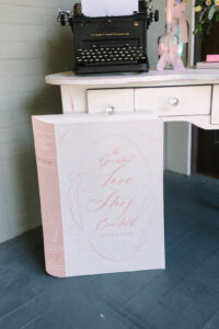 The signage included a creative welcome sign shaped like a book and an escort wall of keepsake bookmarks that guests could take home–along with a book–at the end of the night.