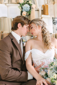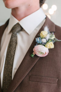 The groom looked dashing in a heathered chocolate brown suit, a creamy white shirt, a textured brown tweed tie, and brown shoes–completing his sophisticated ensemble that perfectly fit the cottagecore style.