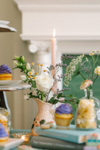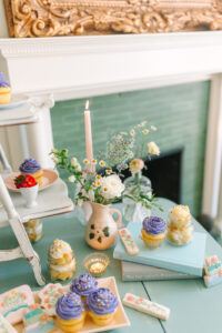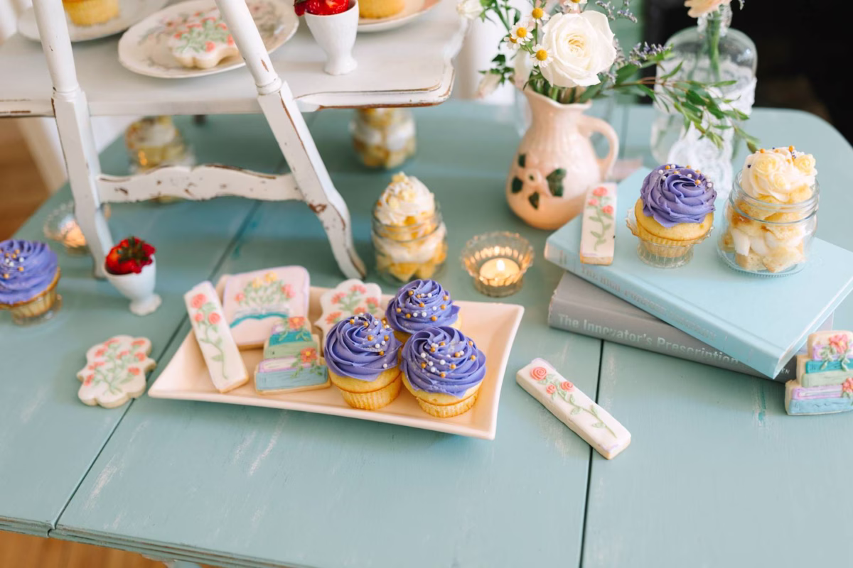 A charming dessert table ended the celebration on a sweet note, featuring an array of delectable treats from LC Custom Treats, LLC. Guests enjoyed grab-and-go delights, including cupcakes, layered jar desserts, and beautifully decorated cookies adorned with floral and book-inspired designs.