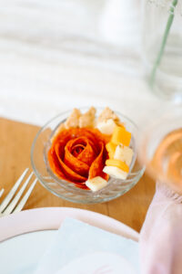 Esthetician Devinne crafted a makeup look that perfectly enhanced the bride’s enchanting vibe. A dewy, rosy glow was achieved with a flawless, natural finish, while a bright pink blush and romantic peachy pink lip provided a vibrant pop, complementing the florals and adding to the overall fresh and light appearance.
