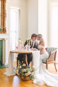 Built in 1876, the Cargill-Pettibone Mansion was the perfect venue for this soft and romantic wedding design. Located just blocks from downtown La Crosse, the venue’s historically charming indoor and outdoor spaces provided a regal, vintage ambiance to the day. In addition to the wraparound porch and front lawn, the elegant indoor architecture, vaulted ceilings, and abundant natural light enhanced the wedding’s lighthearted, intimate feel.