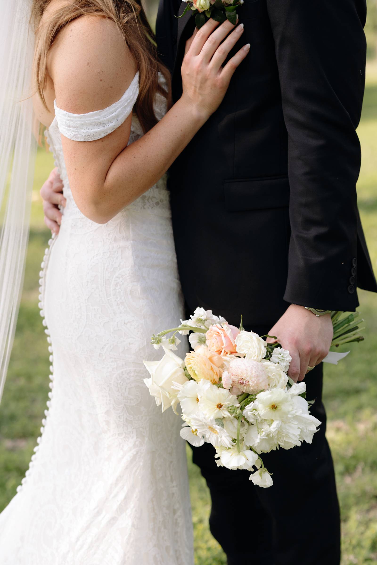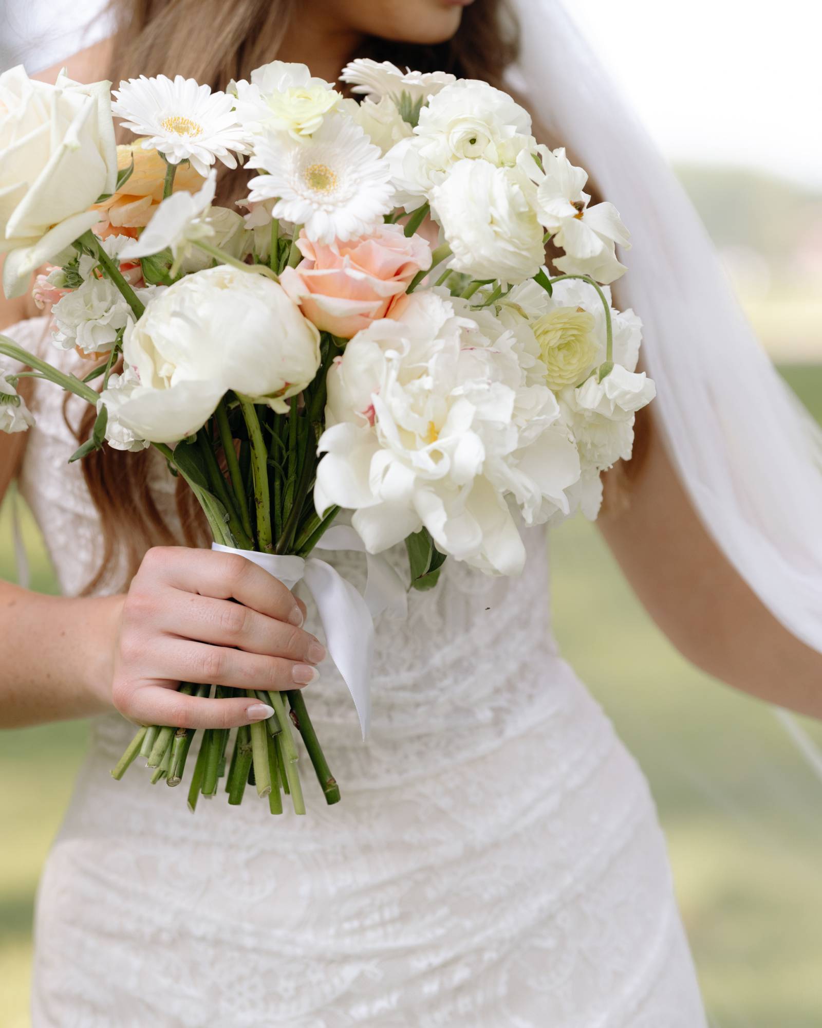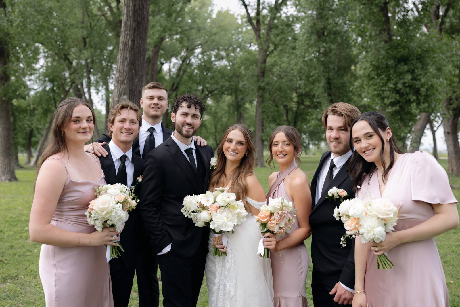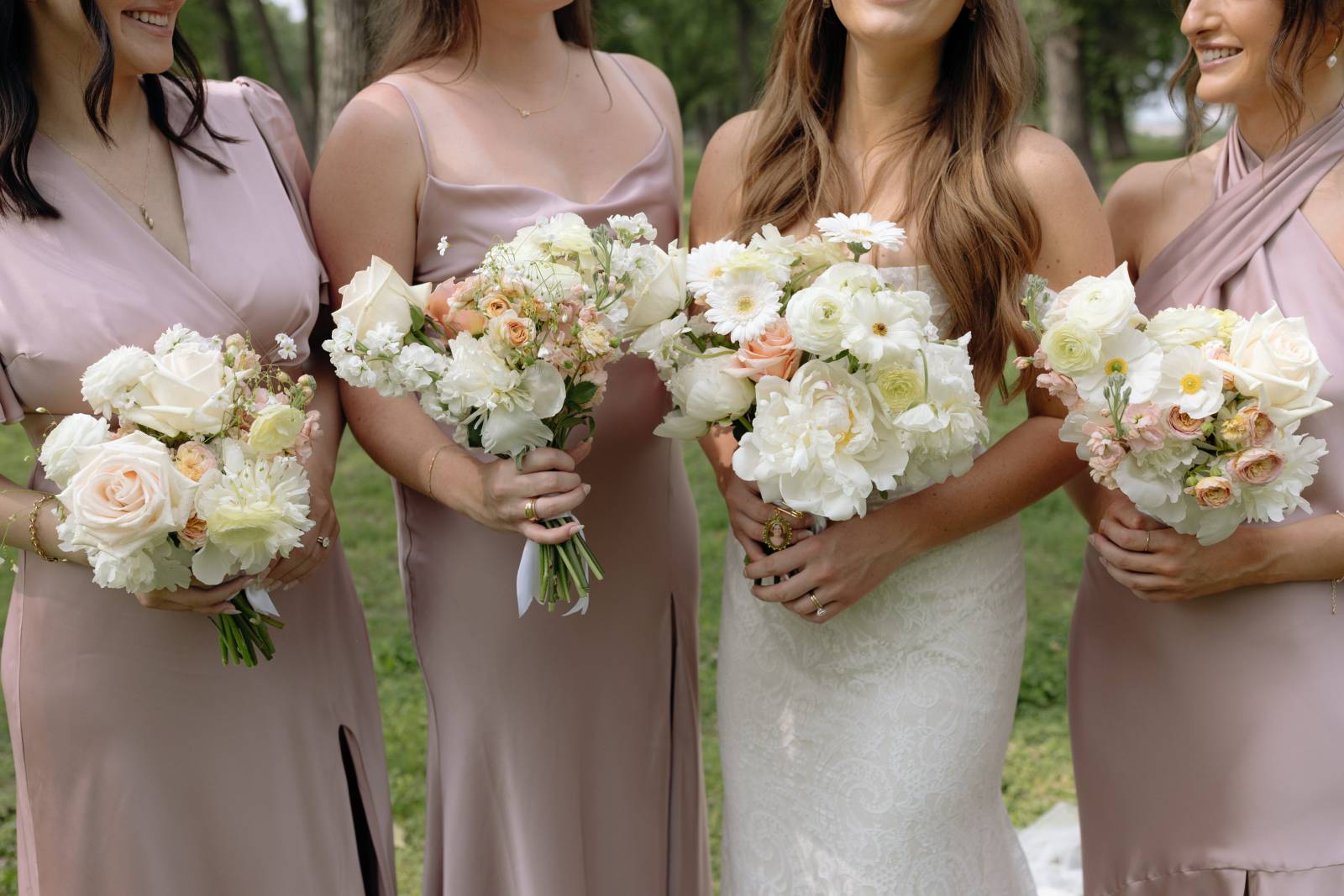 The day’s color palette was kept simple, featuring black, white, cream, and blush. Elizabeth’s bridesmaids wore various styles of blush gowns, and each carried a bouquet that matched the bride’s. Blooms from Wildflower and Wren included peonies, white and blush roses, peach ranunculus, daisies, and smaller accent flowers and greenery.