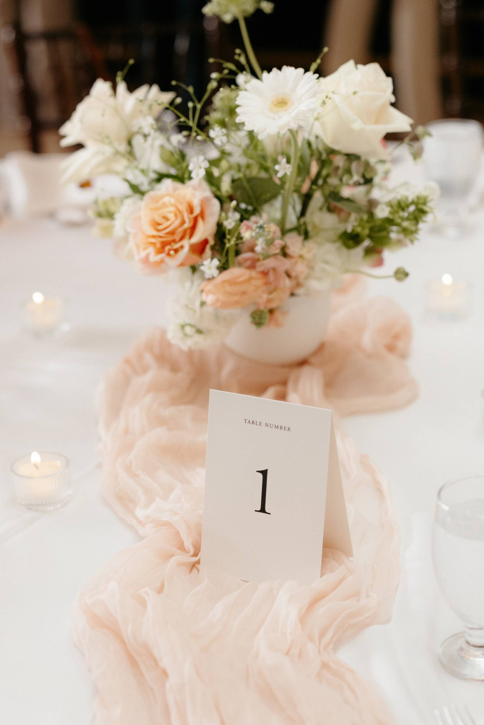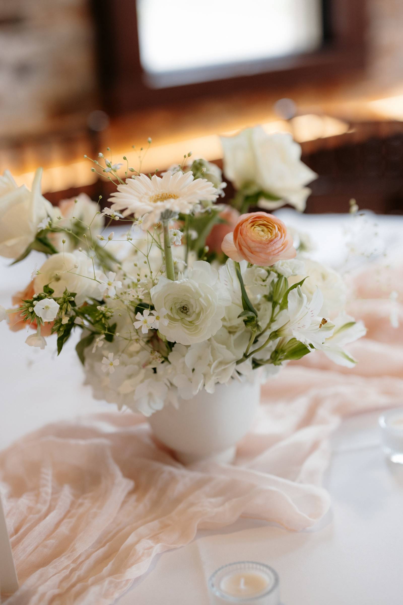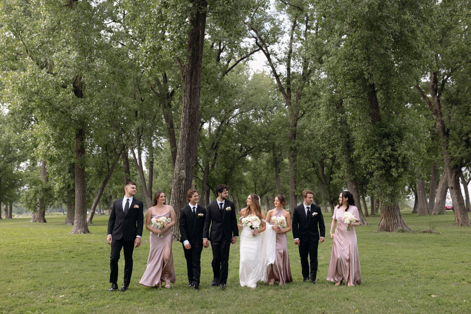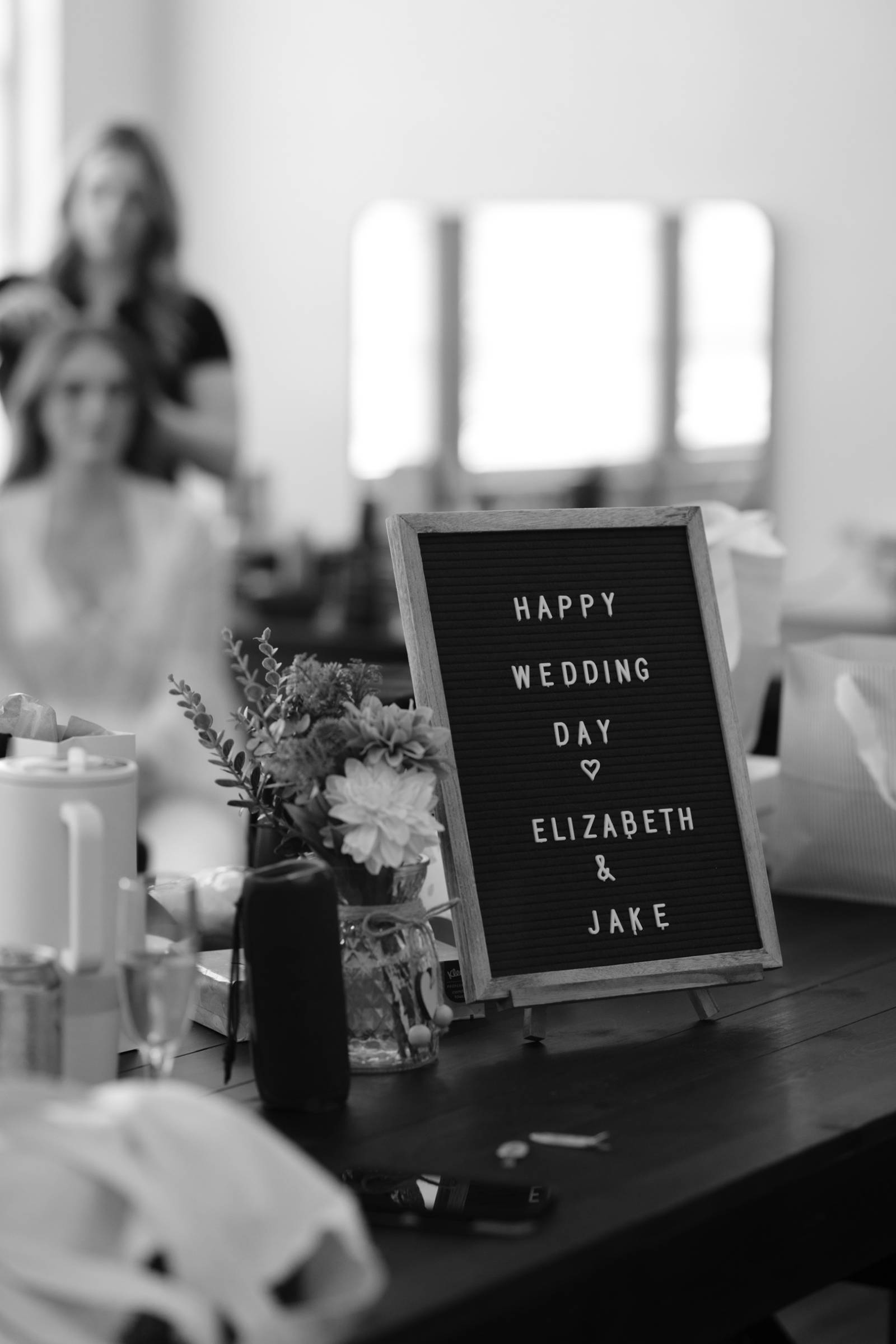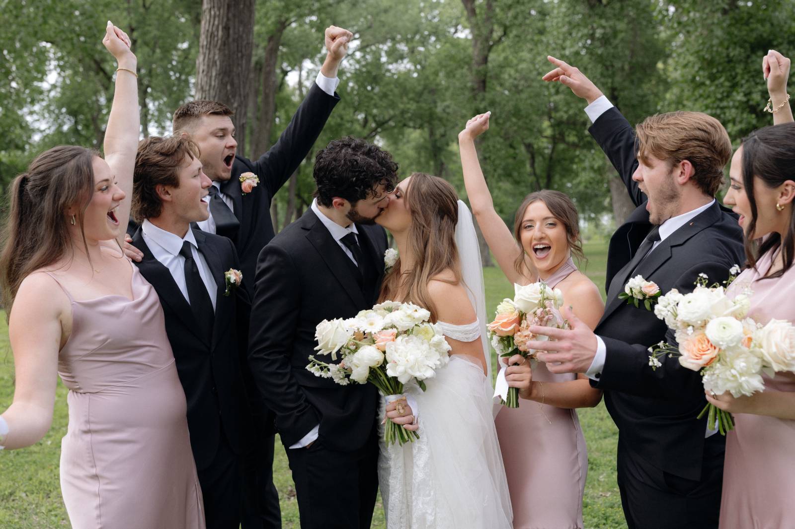 The day’s color palette was kept simple, featuring black, white, cream, and blush. Elizabeth’s bridesmaids wore various styles of blush gowns, and each carried a bouquet that matched the bride’s. Blooms from Wildflower and Wren included peonies, white and blush roses, peach ranunculus, daisies, and smaller accent flowers and greenery.