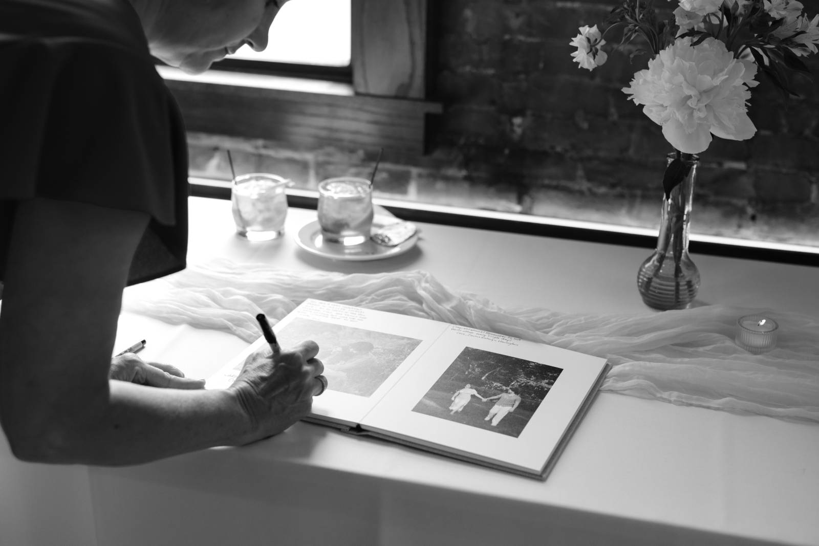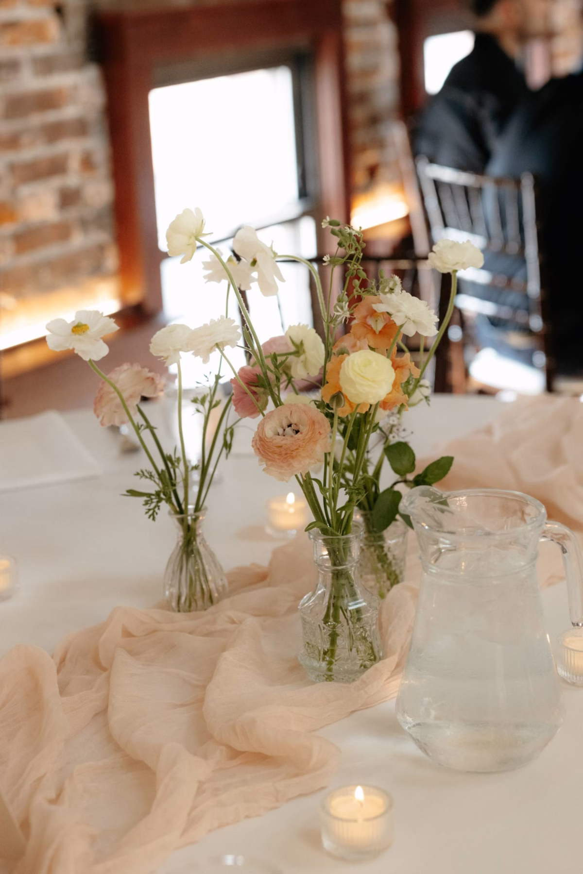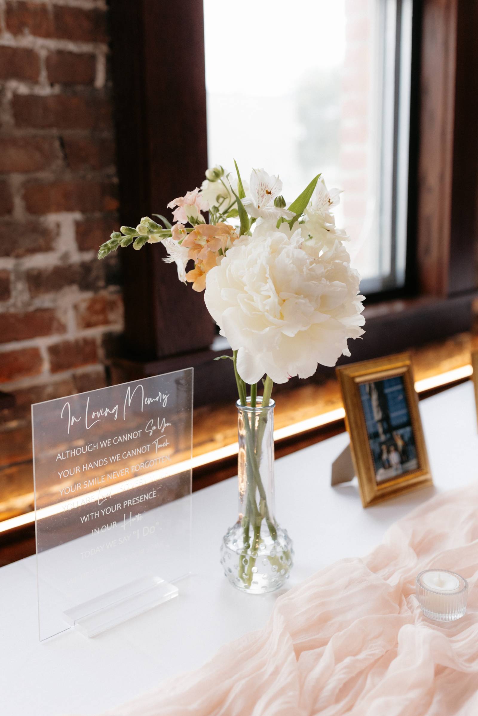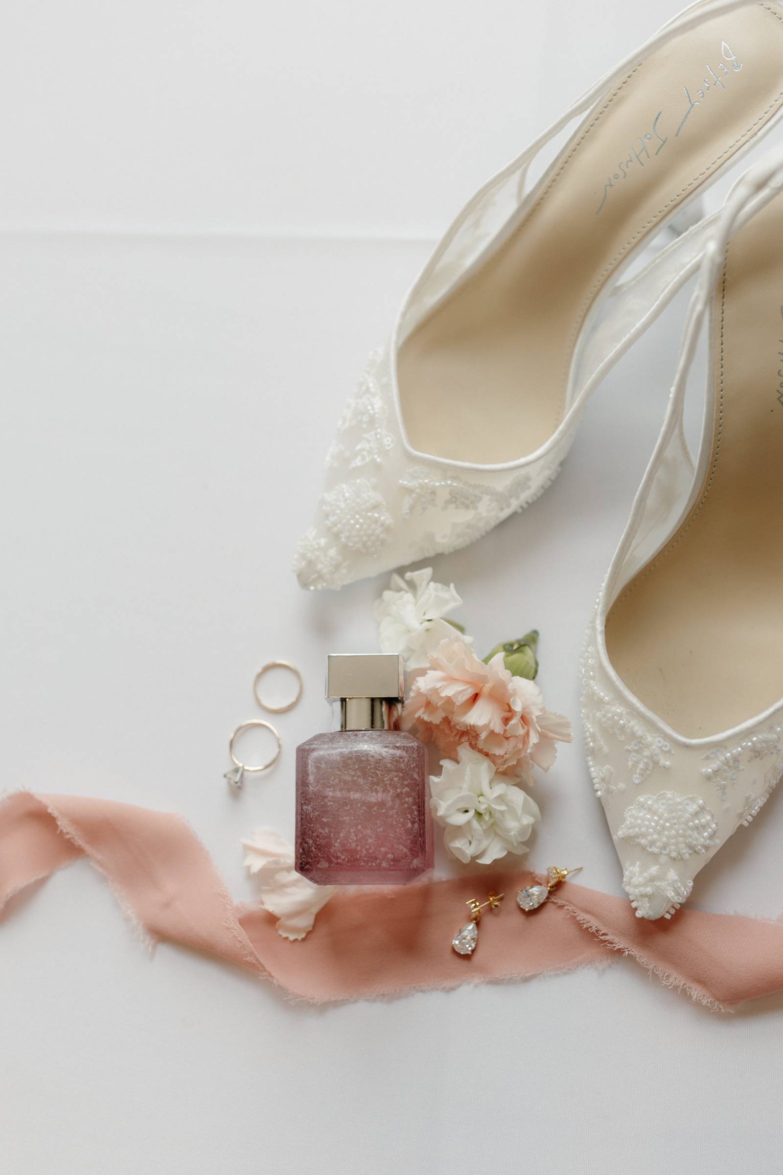 The day’s color palette was kept simple, featuring black, white, cream, and blush. Elizabeth’s bridesmaids wore various styles of blush gowns, and each carried a bouquet that matched the bride’s. Blooms from Wildflower and Wren included peonies, white and blush roses, peach ranunculus, daisies, and smaller accent flowers and greenery.