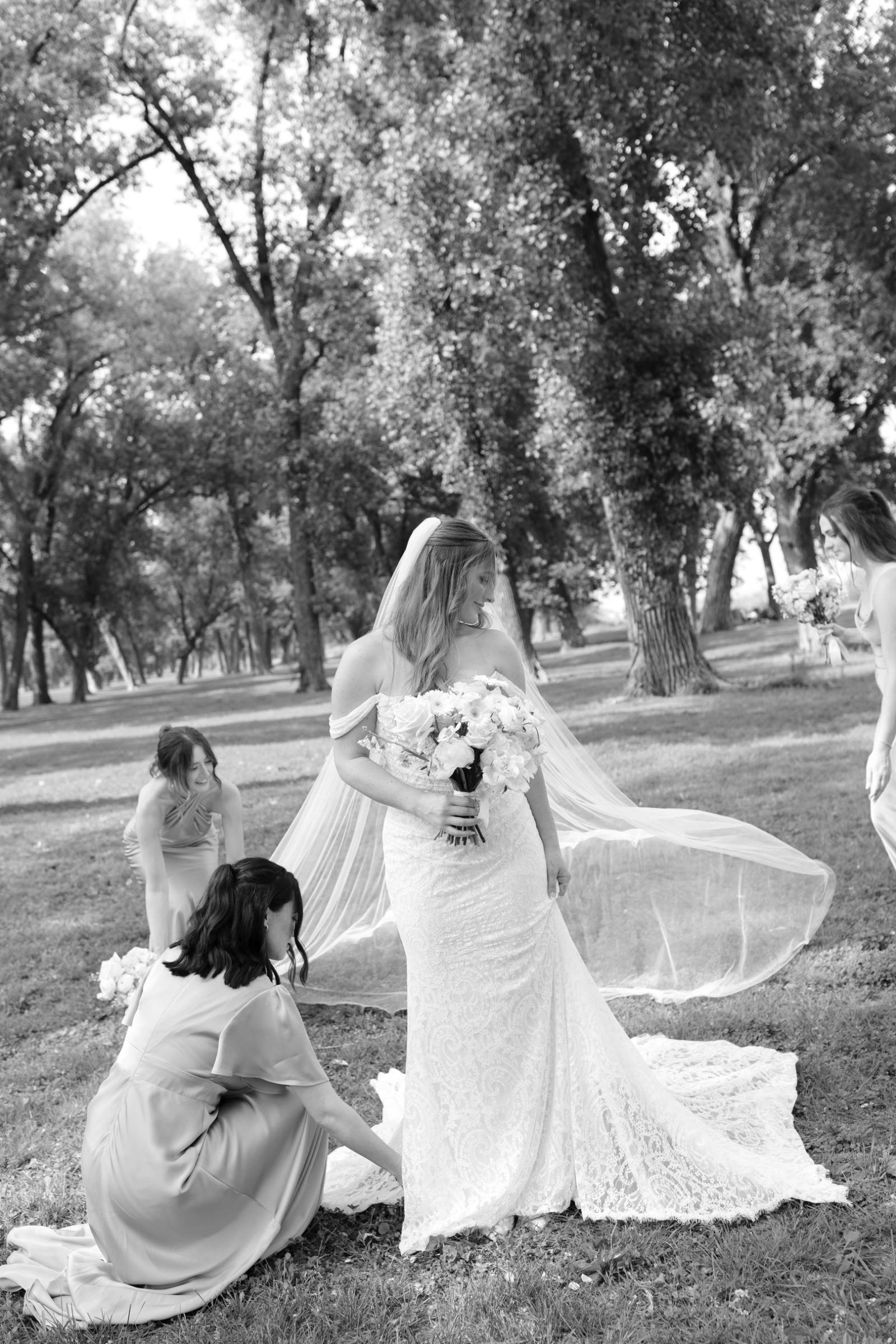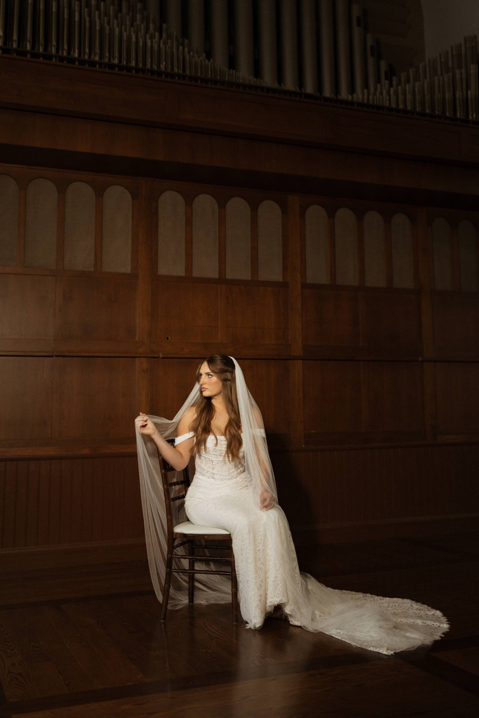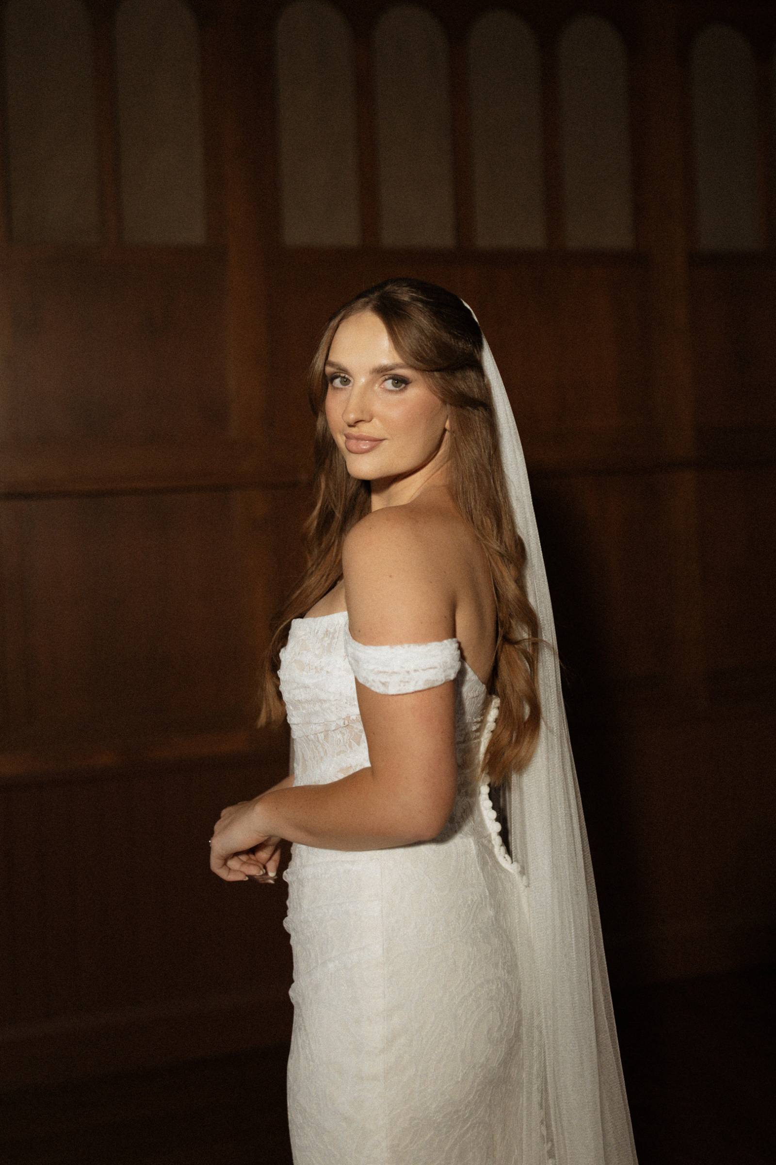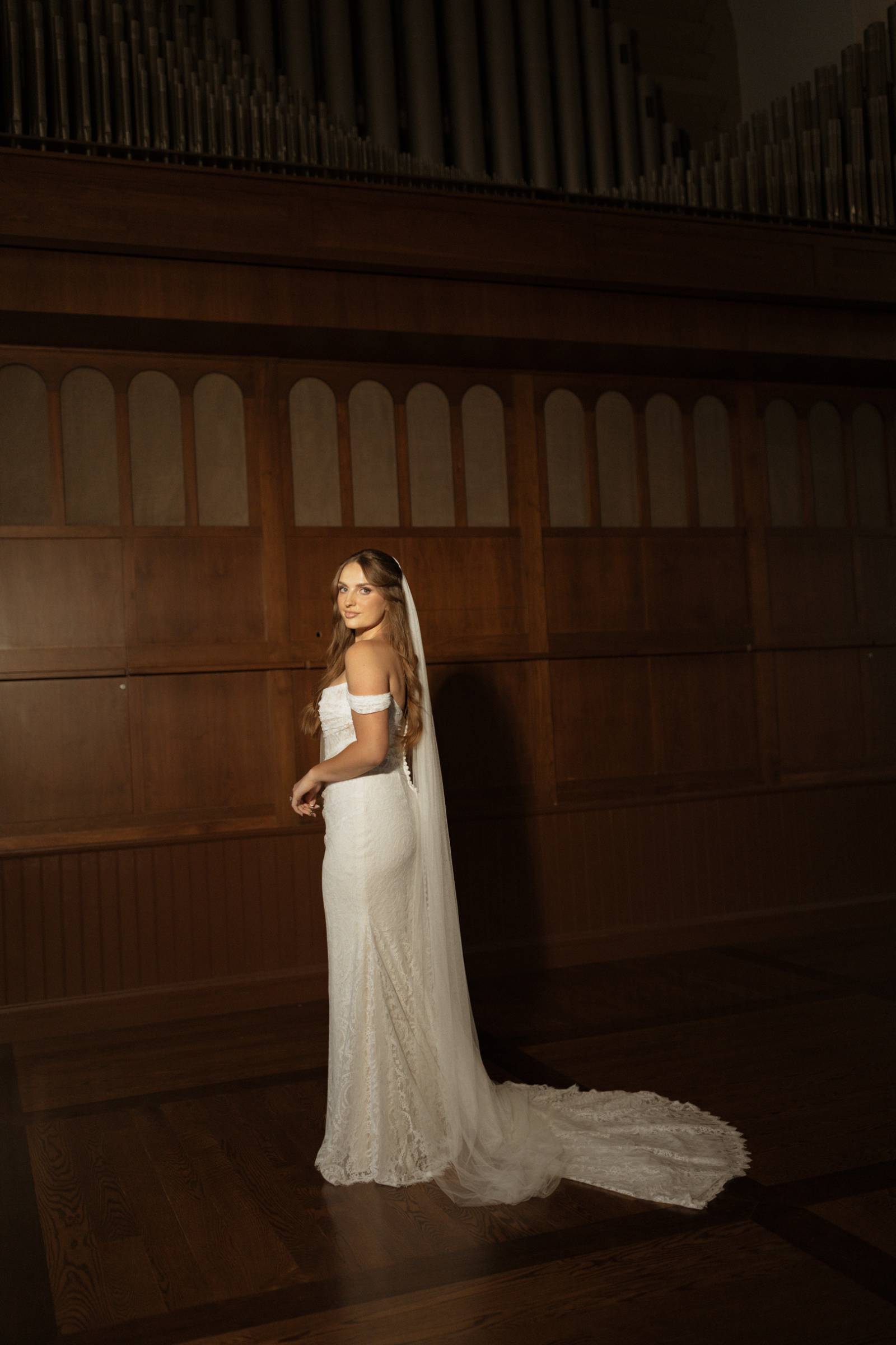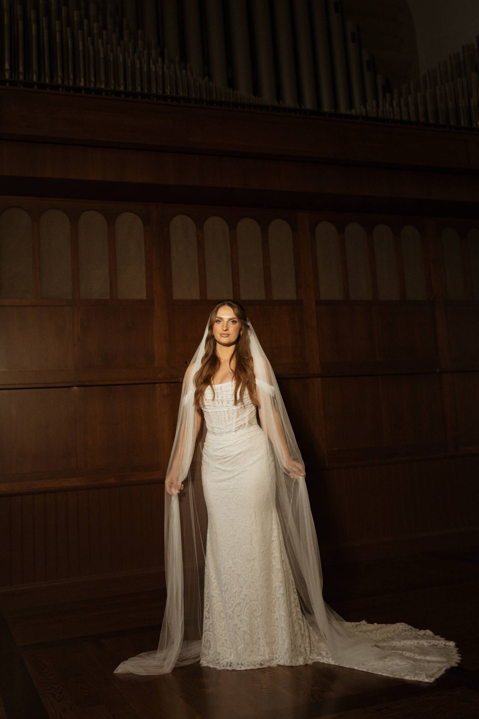 Elizabeth found her dream dress, the “Glenetta” from designer Justin Alexander, at Vera’s House of Bridals. The stunning fit-and-flare gown featured a straight neckline, a basque waist, off-the-shoulder straps, exposed corset boning, and vintage lace that cascaded into a chapel-length train. She accessorized with a floor-length tulle veil that added texture and movement to her romantic poses and portraits.