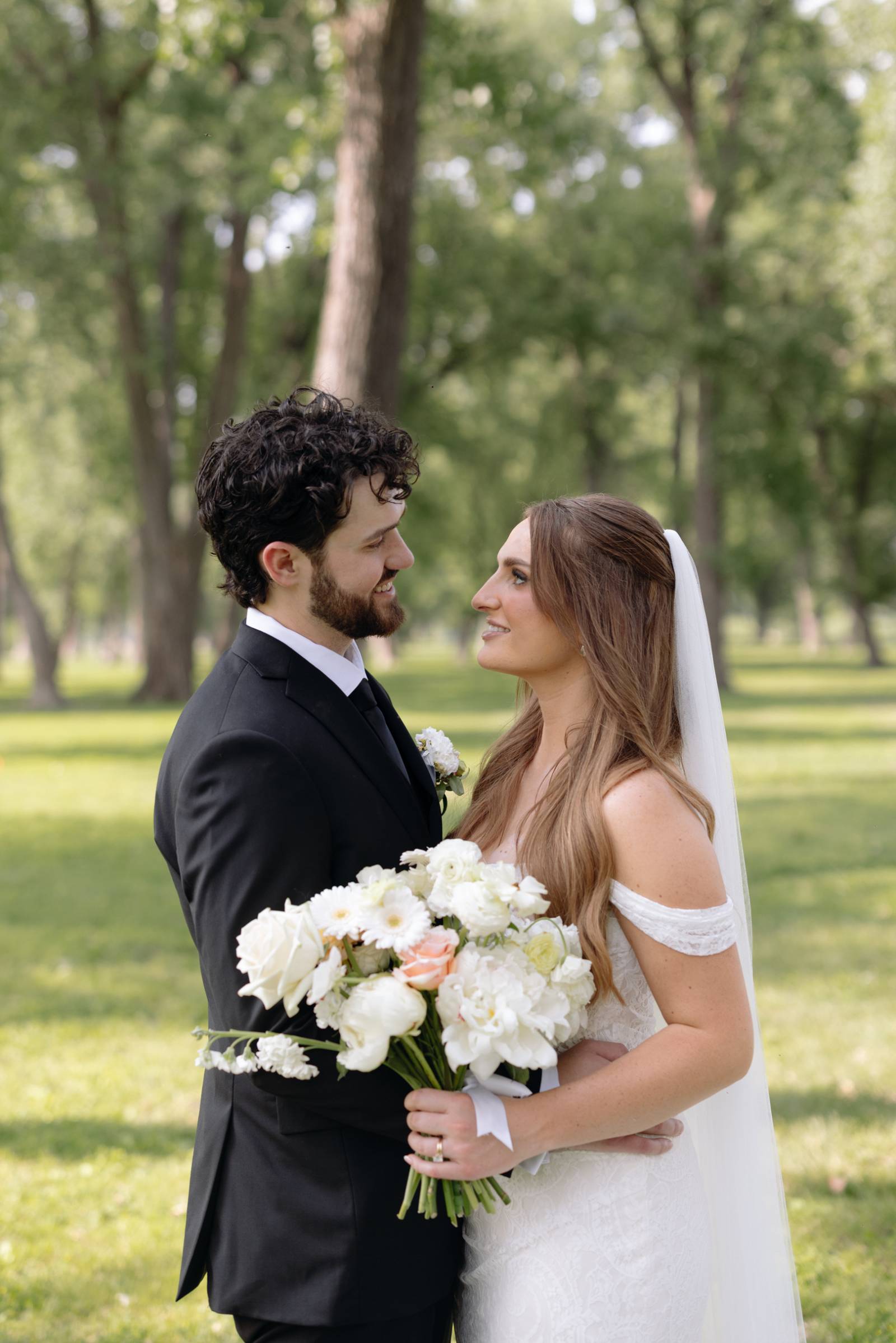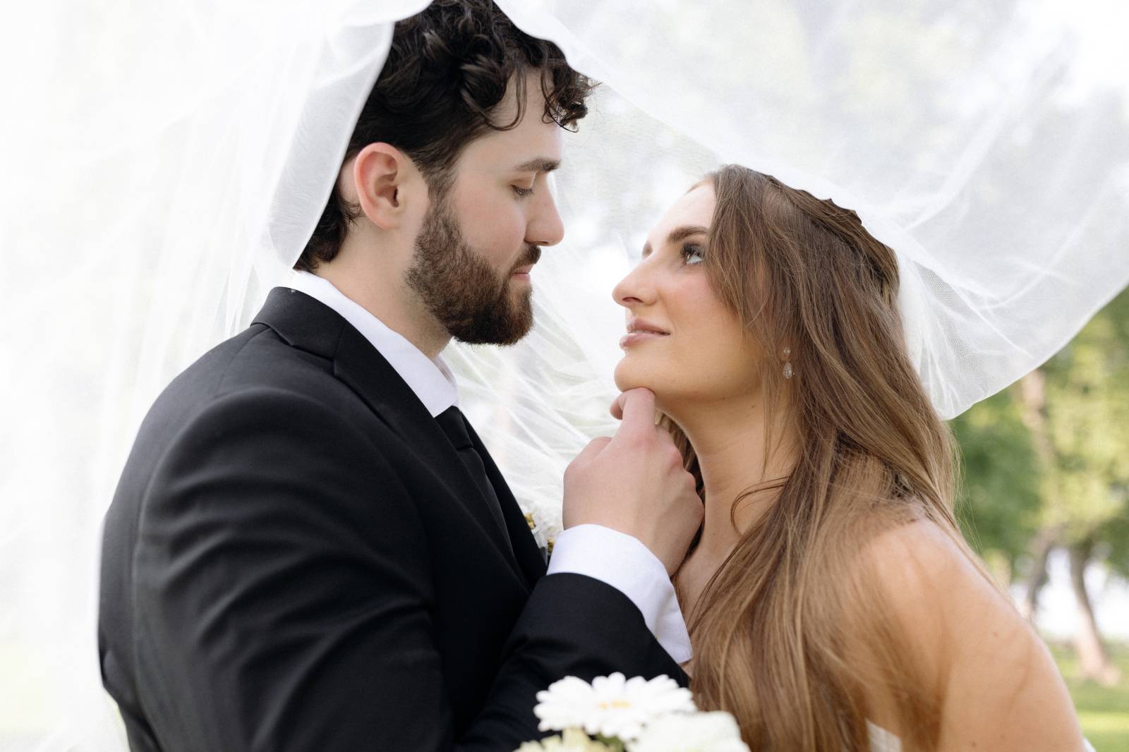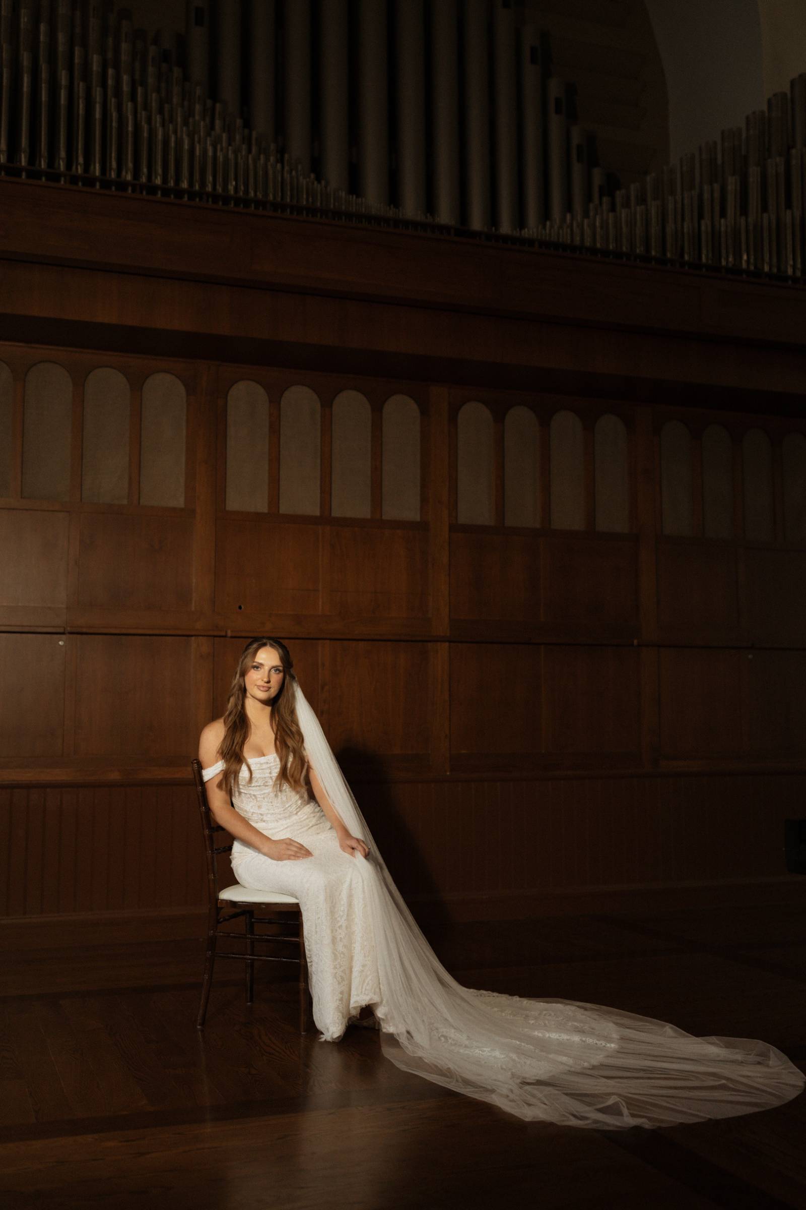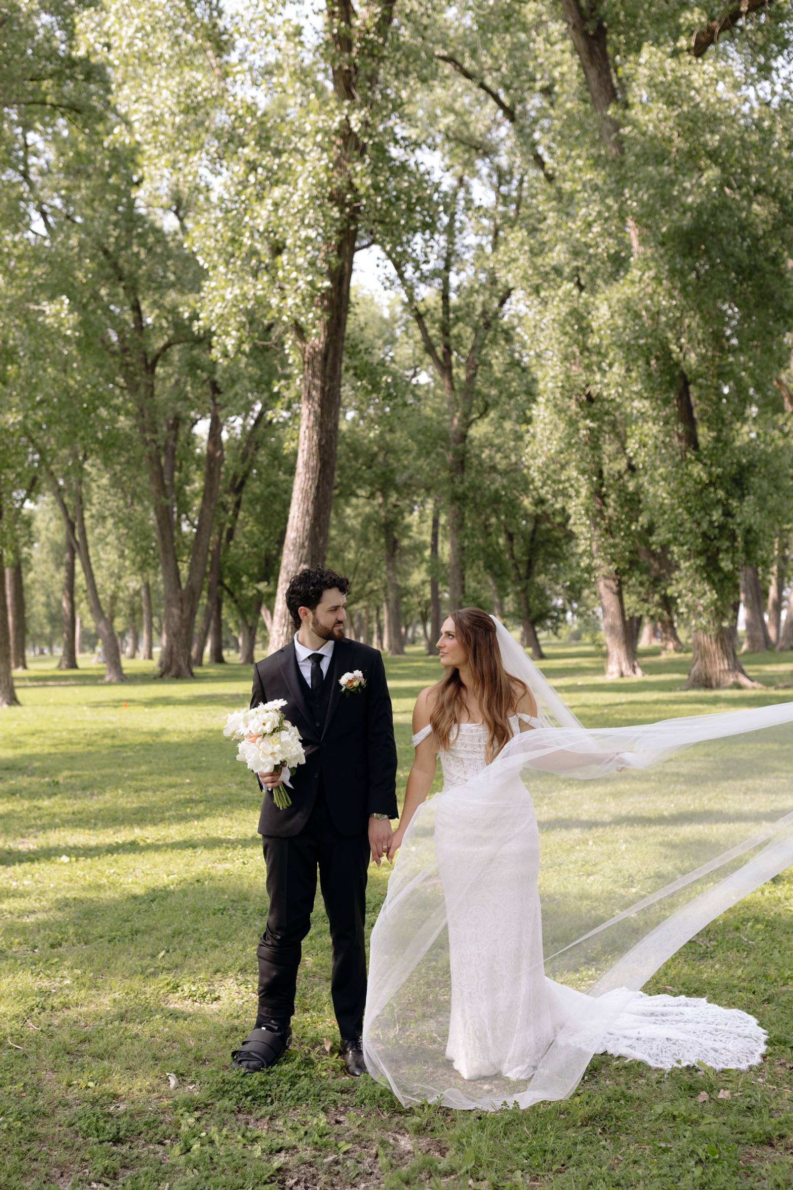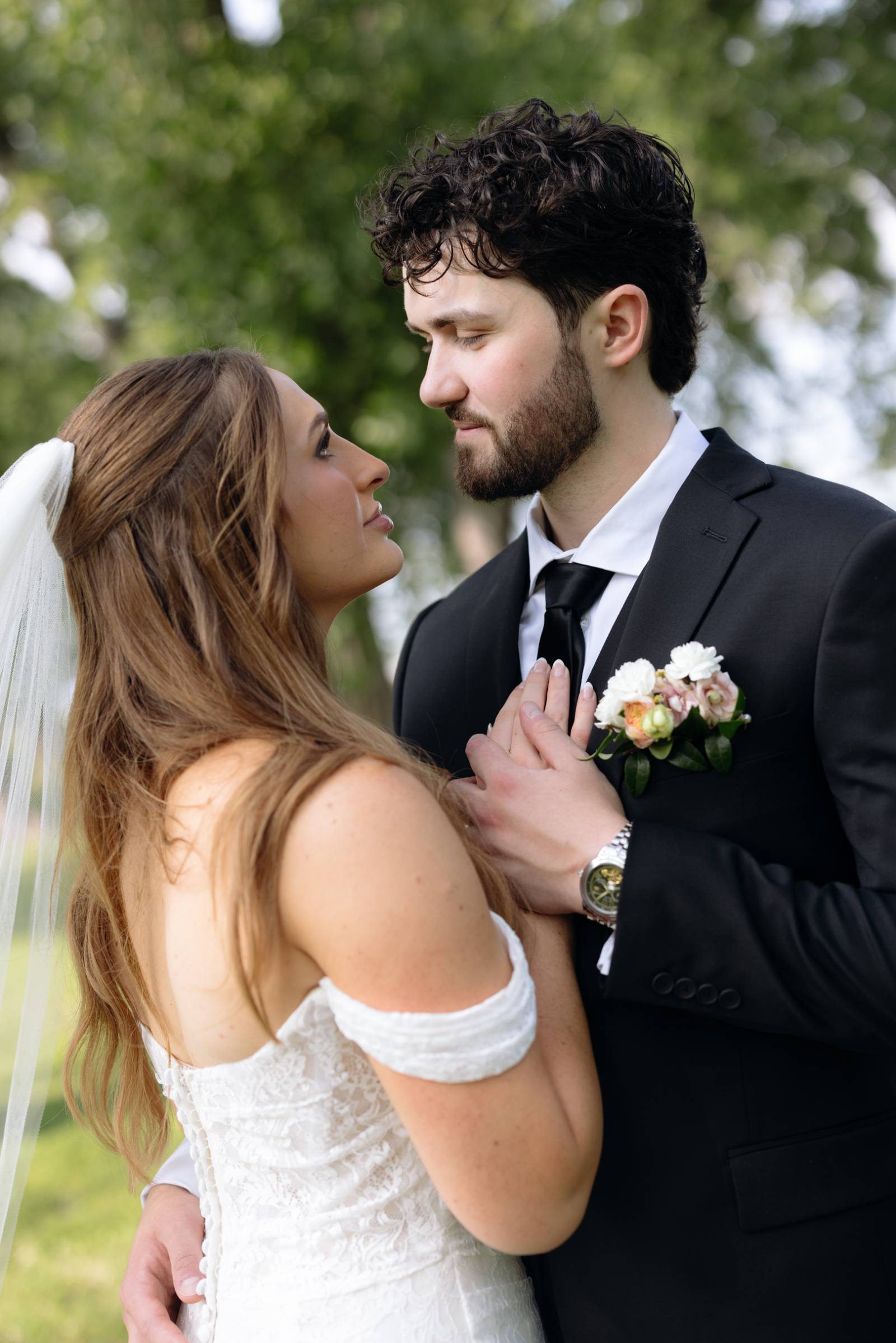 Elizabeth found her dream dress, the “Glenetta” from designer Justin Alexander, at Vera’s House of Bridals. The stunning fit-and-flare gown featured a straight neckline, a basque waist, off-the-shoulder straps, exposed corset boning, and vintage lace that cascaded into a chapel-length train. She accessorized with a floor-length tulle veil that added texture and movement to her romantic poses and portraits.