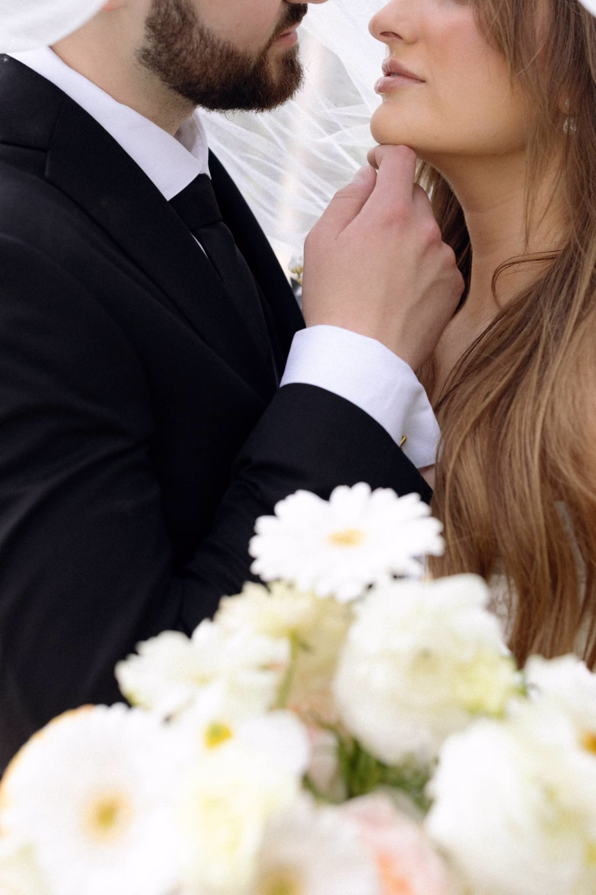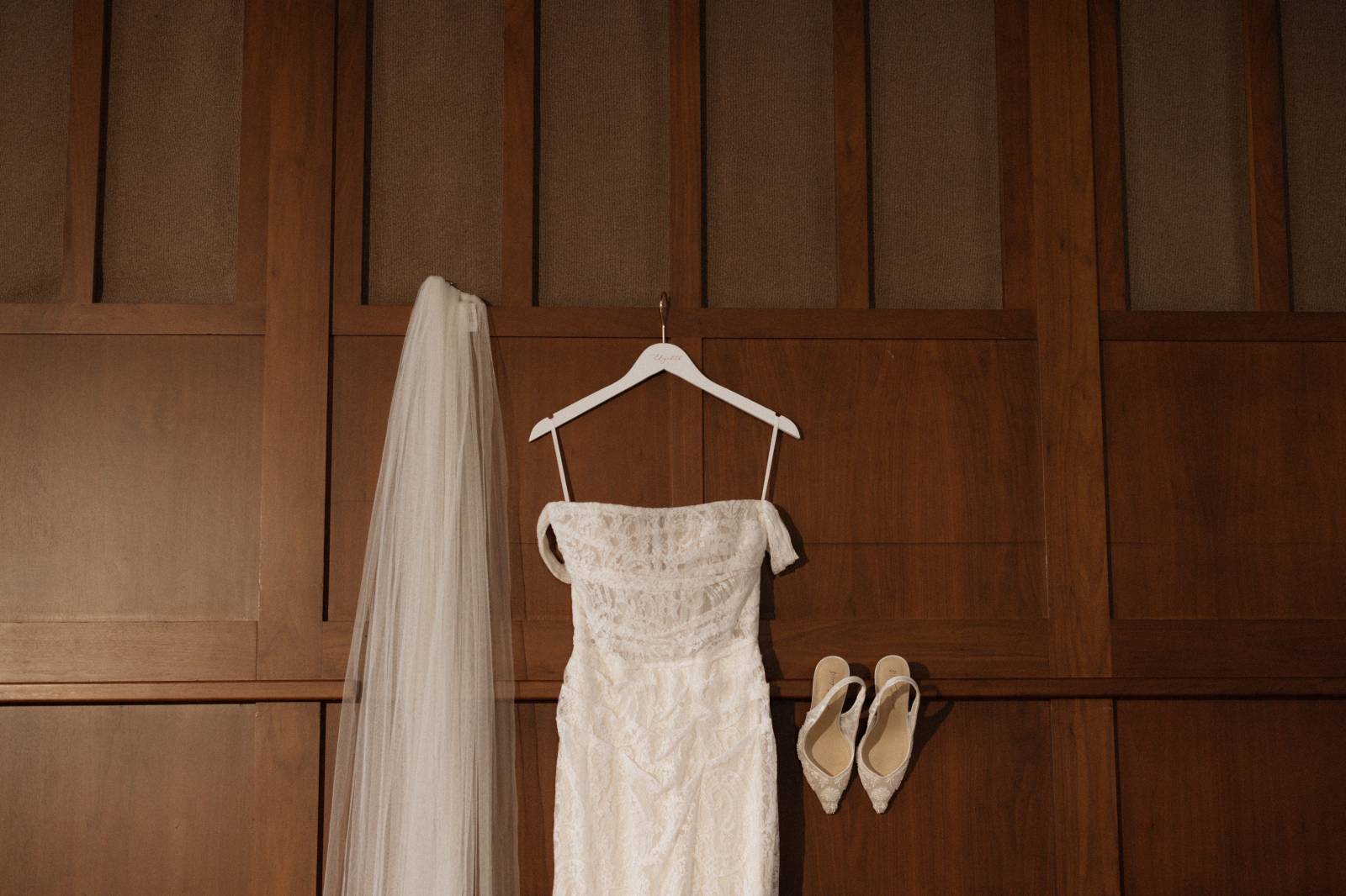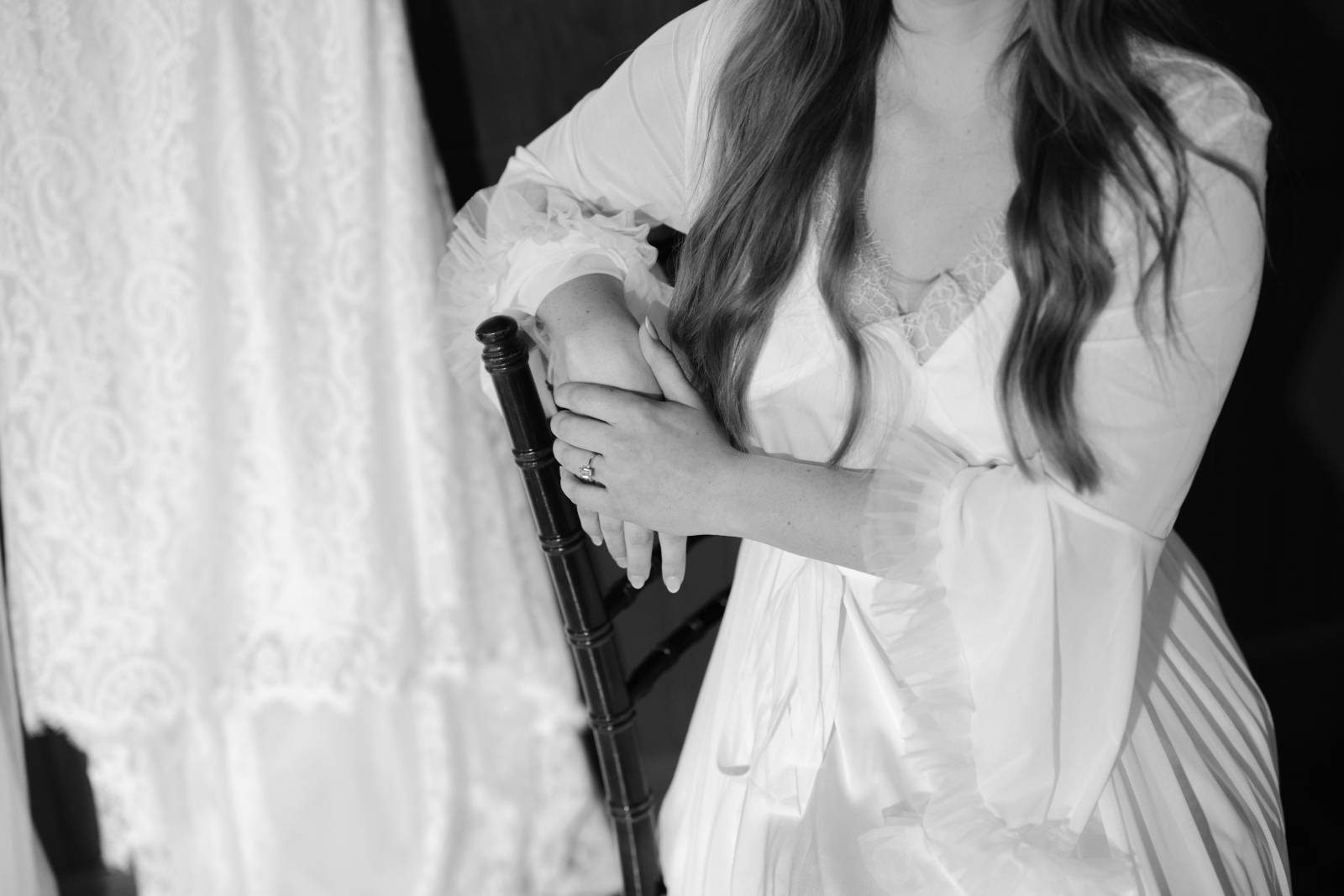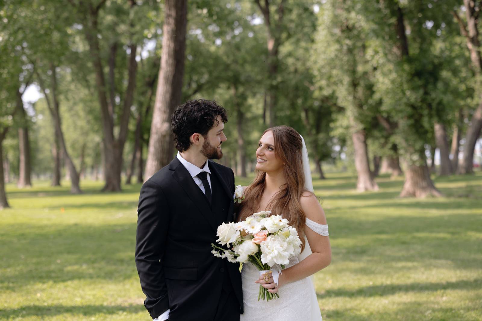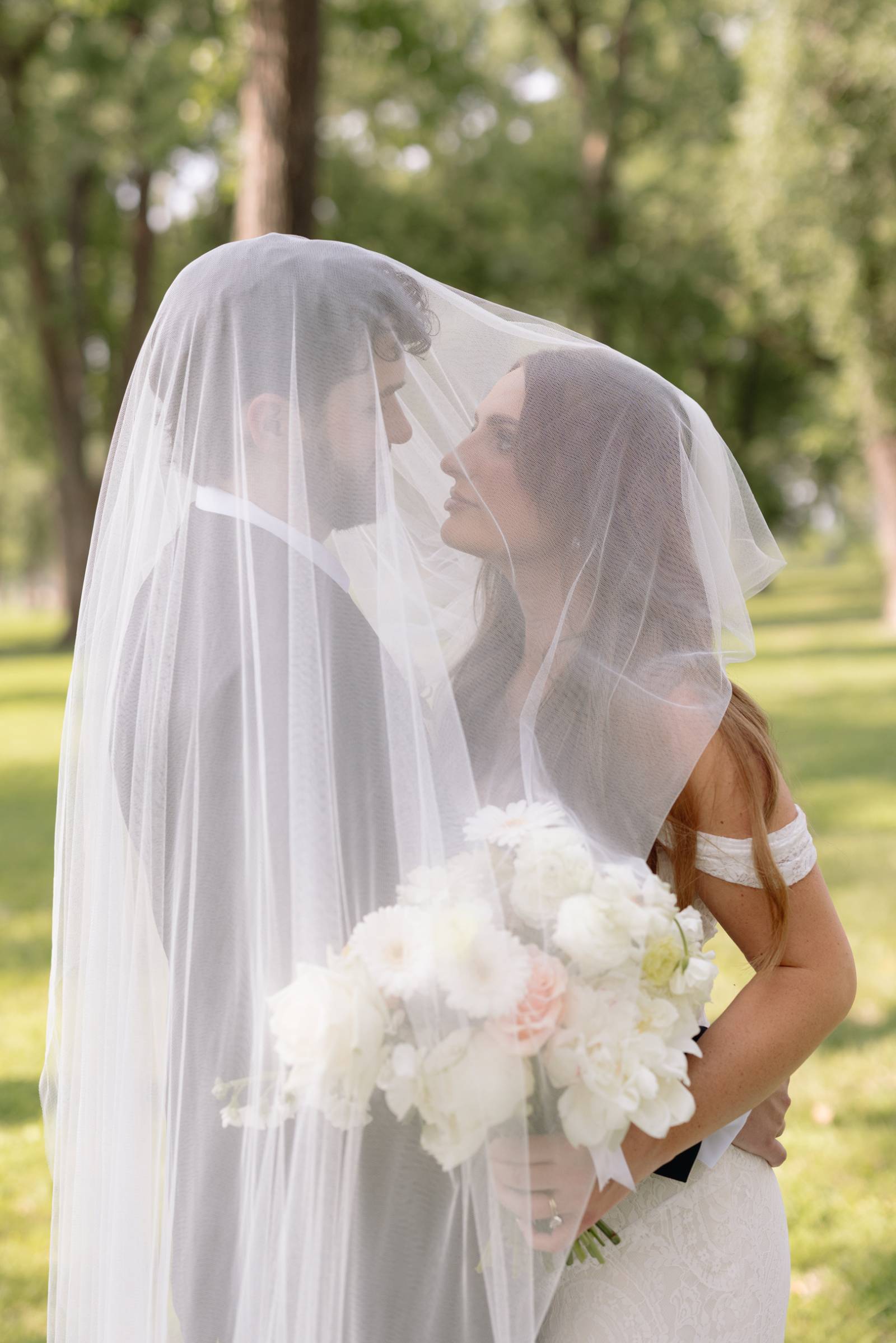 Elizabeth found her dream dress, the “Glenetta” from designer Justin Alexander, at Vera’s House of Bridals. The stunning fit-and-flare gown featured a straight neckline, a basque waist, off-the-shoulder straps, exposed corset boning, and vintage lace that cascaded into a chapel-length train. She accessorized with a floor-length tulle veil that added texture and movement to her romantic poses and portraits.