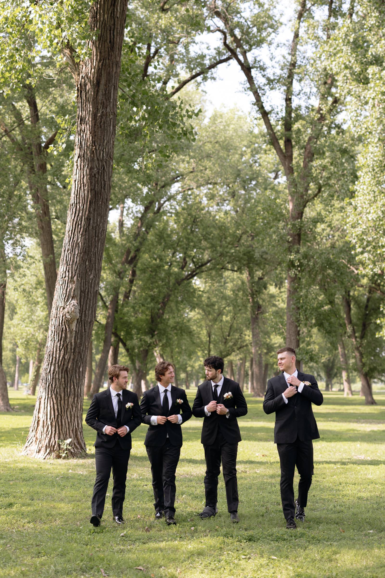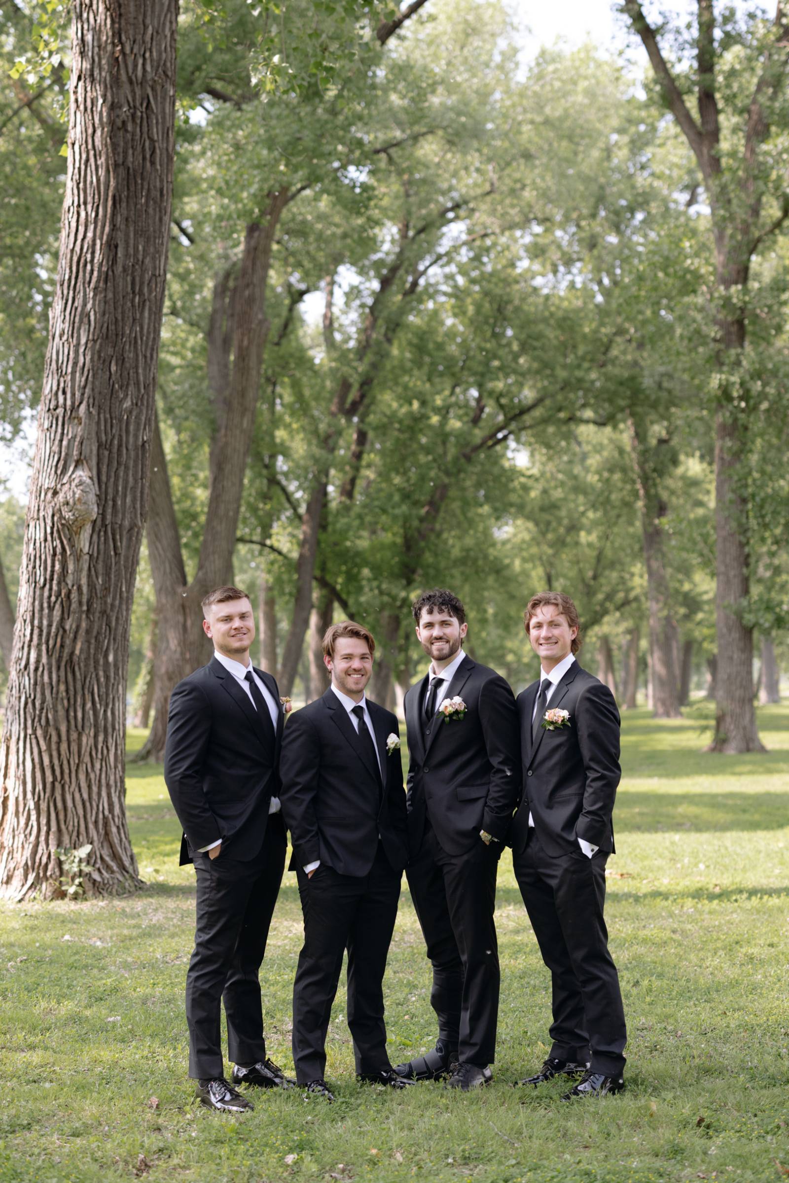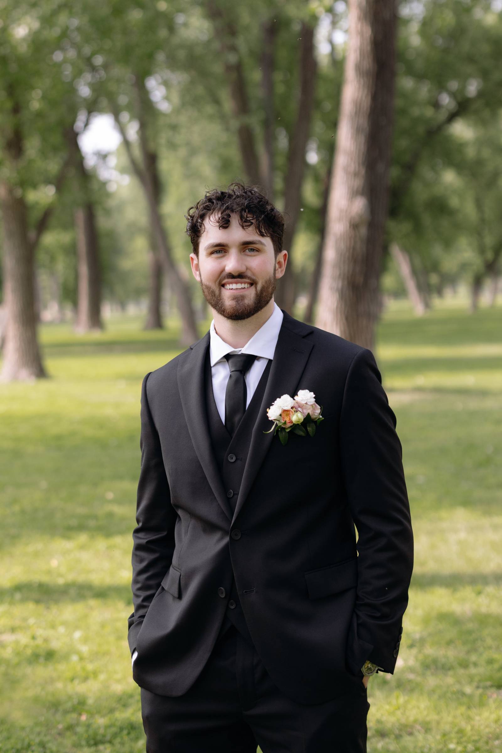 Jake and his groomsmen wore black suits from Men’s Wearhouse, with white undershirts, black ties, and pocket florals. For a slight differentiation, Jake also wore a black vest, visible beneath his suit coat.