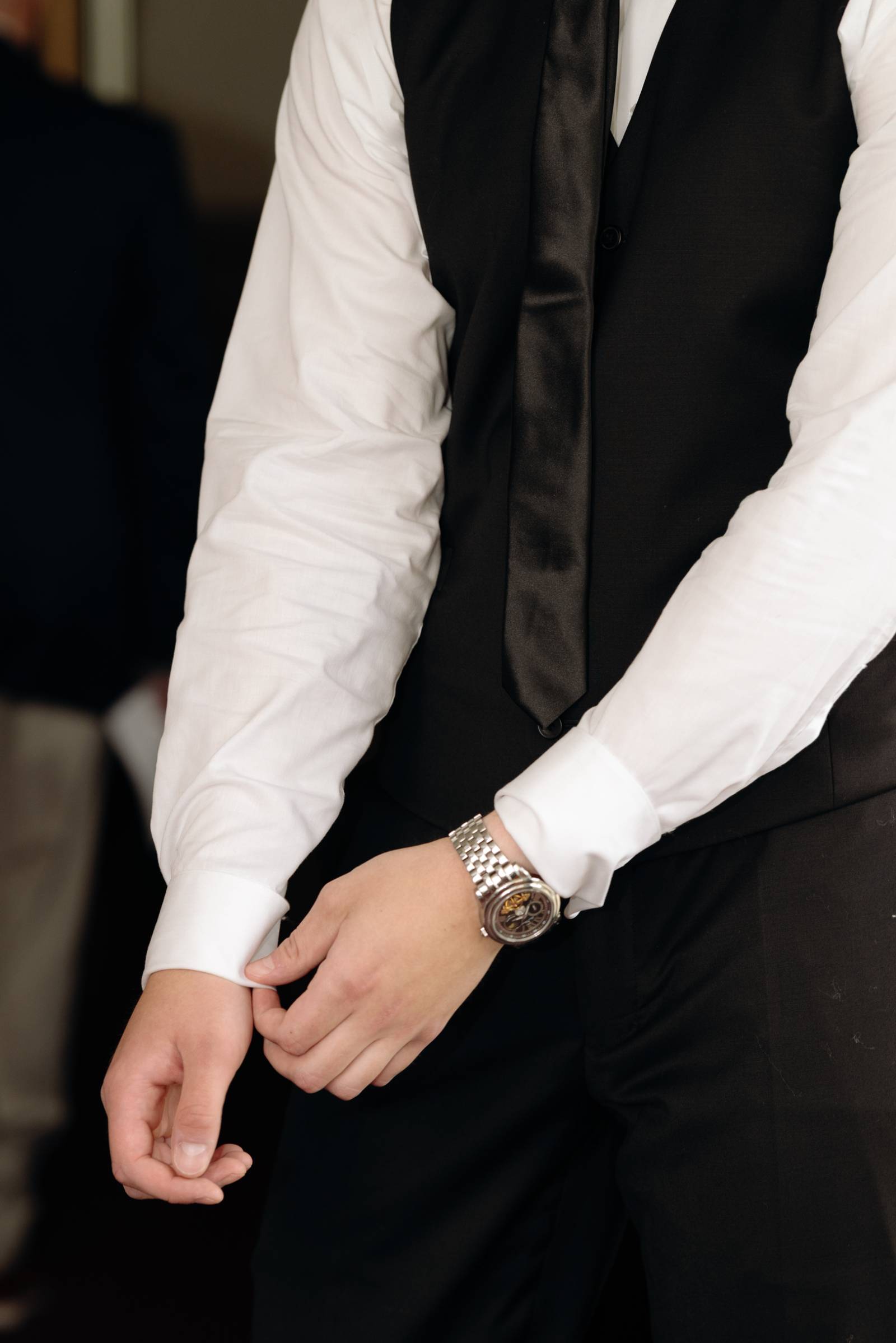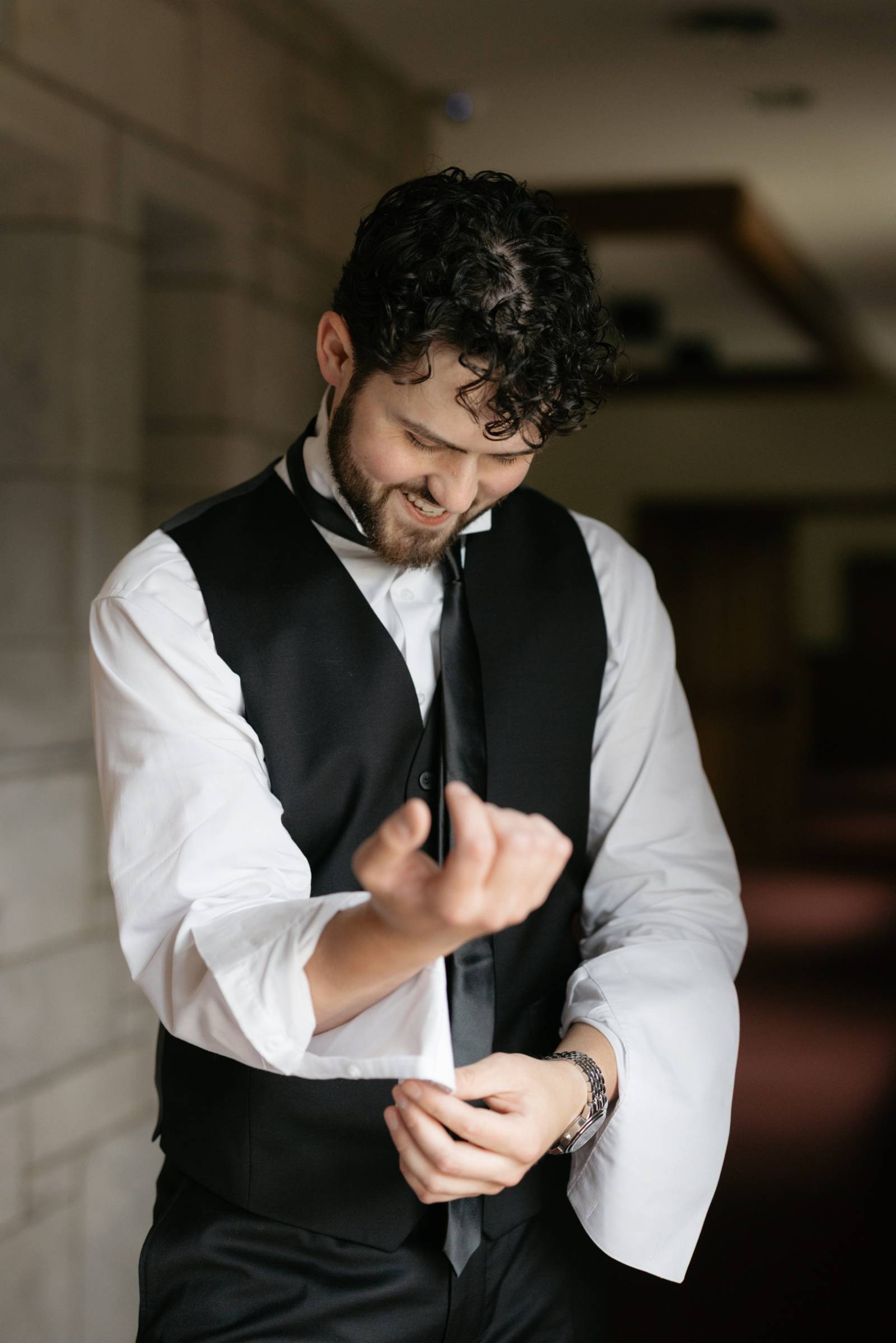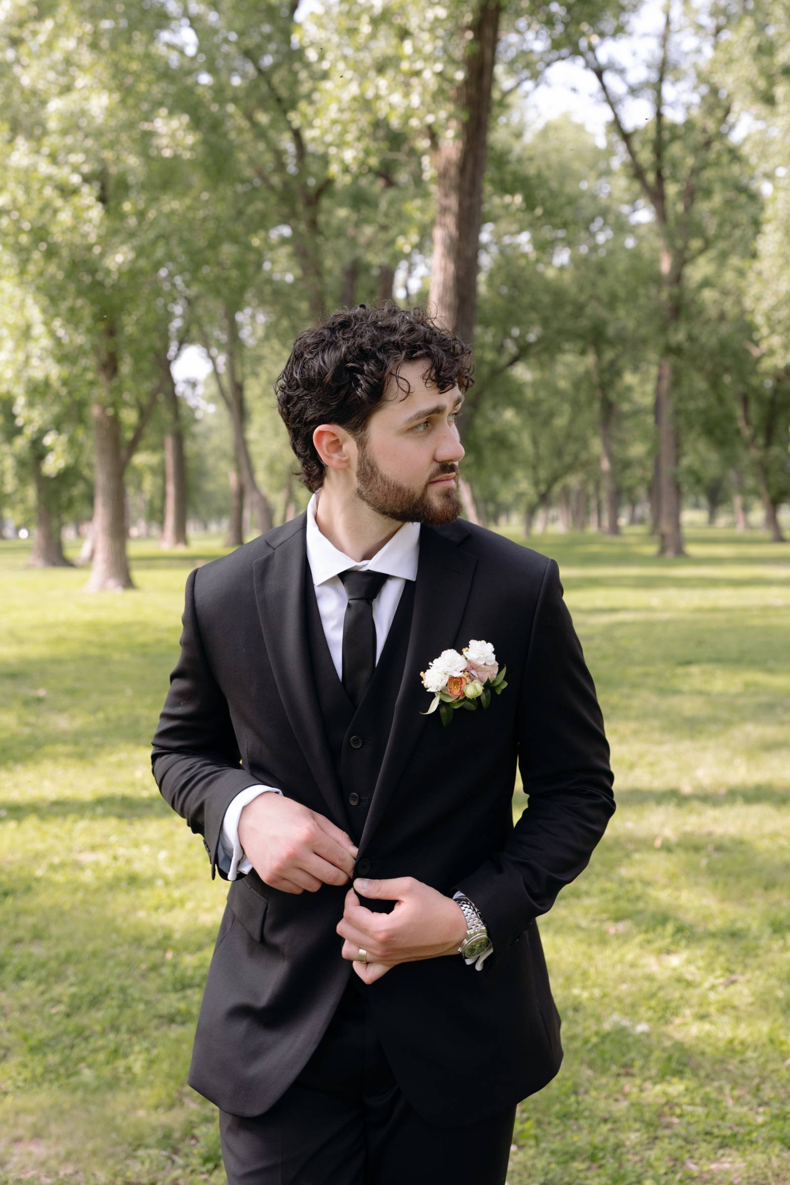 Jake and his groomsmen wore black suits from Men’s Wearhouse, with white undershirts, black ties, and pocket florals. For a slight differentiation, Jake also wore a black vest, visible beneath his suit coat.