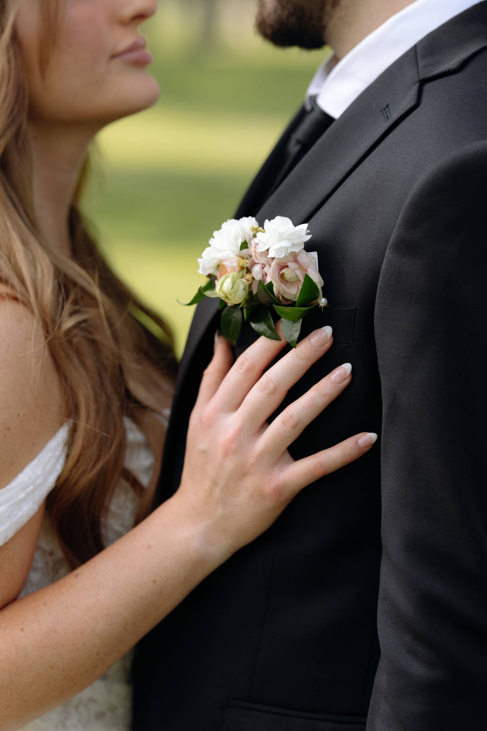 Hair and makeup teams collaborated to create a bridal look that was both radiant and natural. Esthetician Devinne brought out Elizabeth’s natural beauty, with rosy cheeks, soft eyeshadow, lengthy lashes, and glossy lip. Sue Kolves Salon & Day Spa styled Elizabeth’s hair into a half-updo, with loose waves, and stylish, framing curtain bangs.