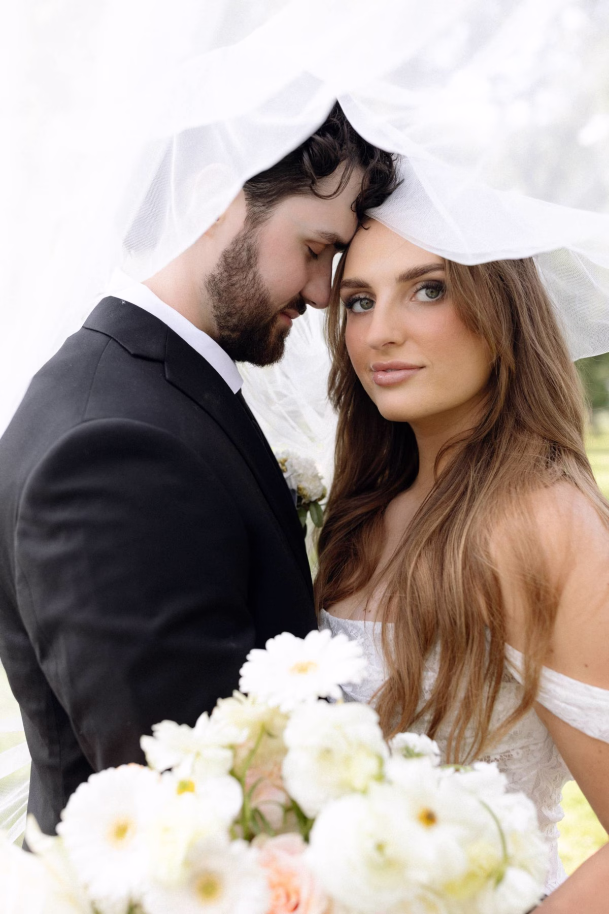 Elizabeth found her dream dress, the "Glenetta" from designer Justin Alexander, at Vera's House of Bridals. The stunning fit-and-flare gown featured a straight neckline, a basque waist, off-the-shoulder straps, exposed corset boning, and vintage lace that cascaded into a chapel-length train. She accessorized with a floor-length tulle veil that added texture and movement to her romantic poses and portraits.