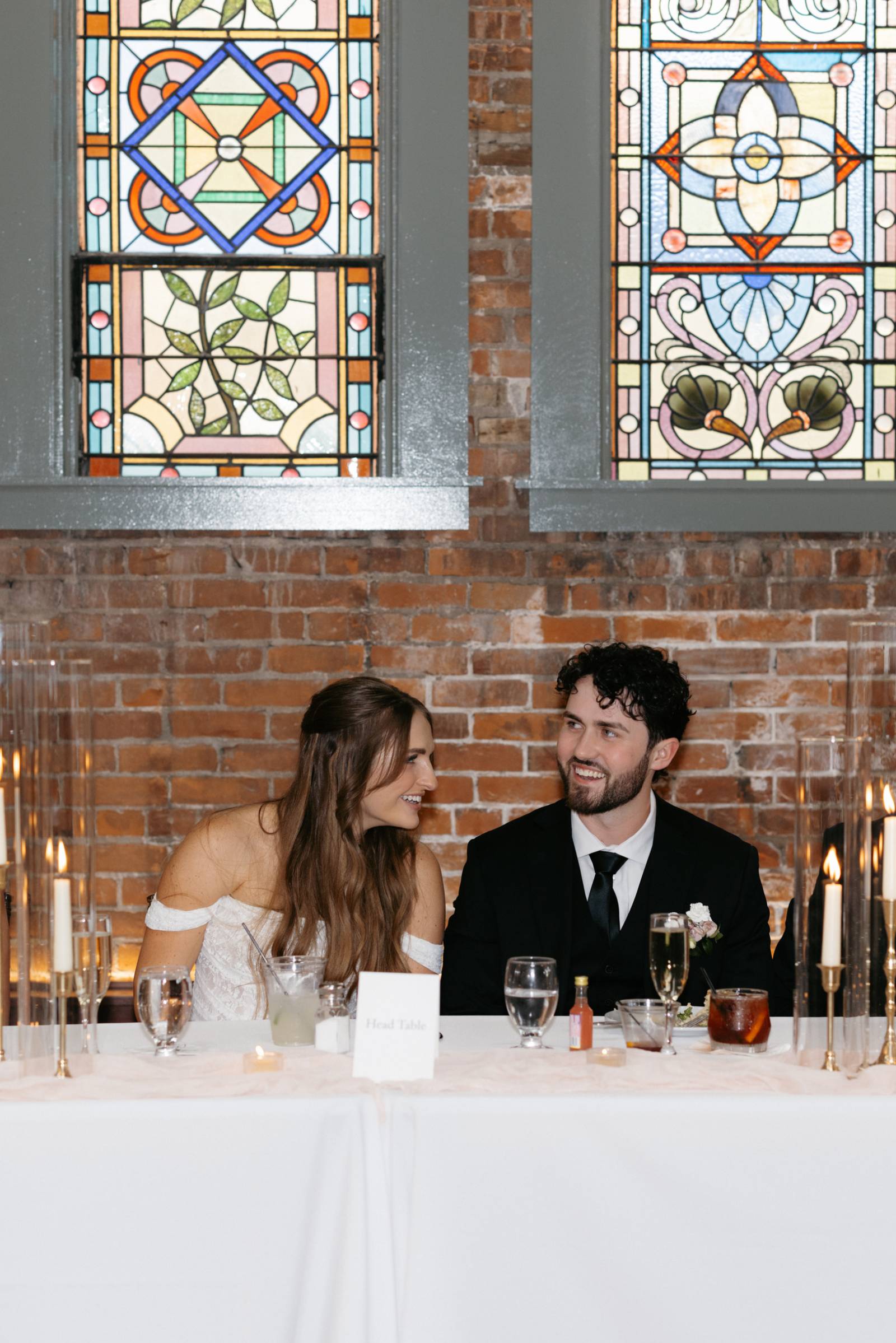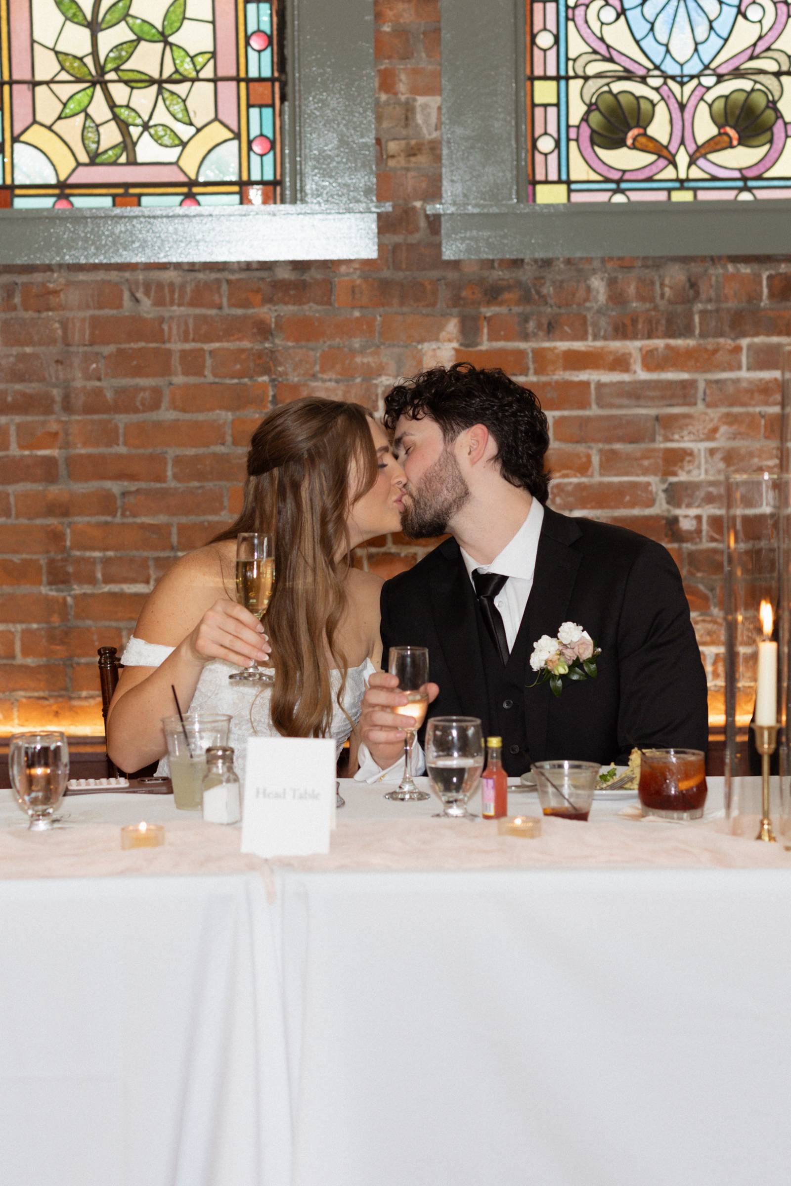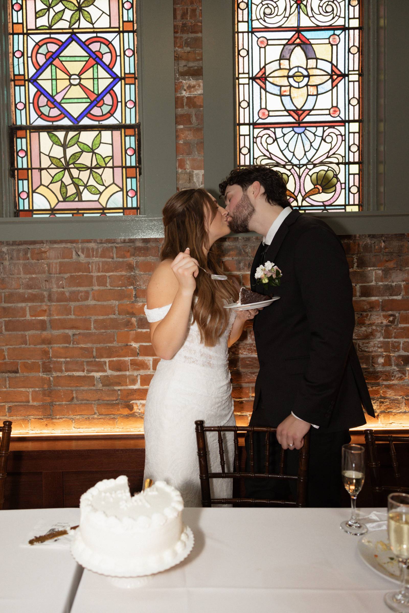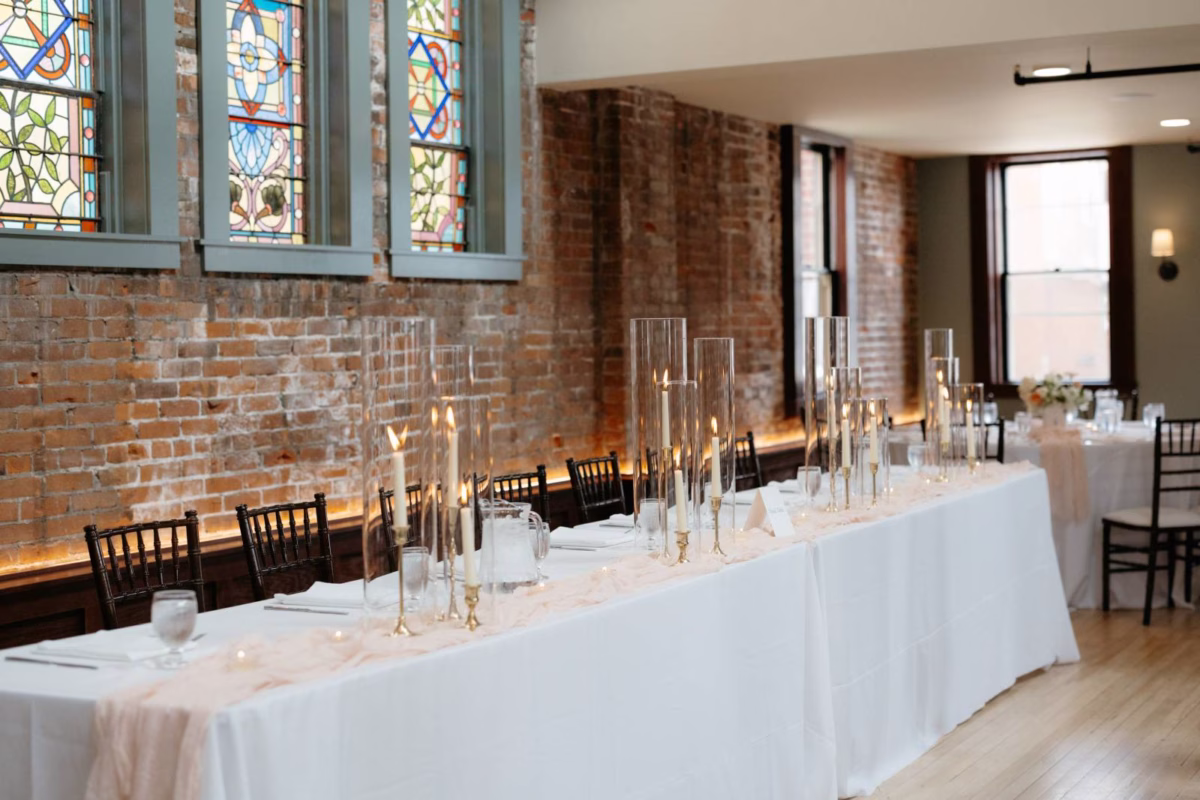 They were lucky enough to find an in-house coordinator at Cappella Weddings & Events, their dream reception venue located in the heart of downtown historic La Crosse. The Capella Ballroom boasts 40-foot cathedral ceilings, exposed brick backdrops, warm lighting, and original 1886 stained glass windows.
