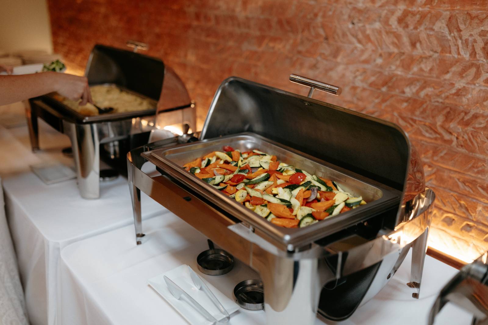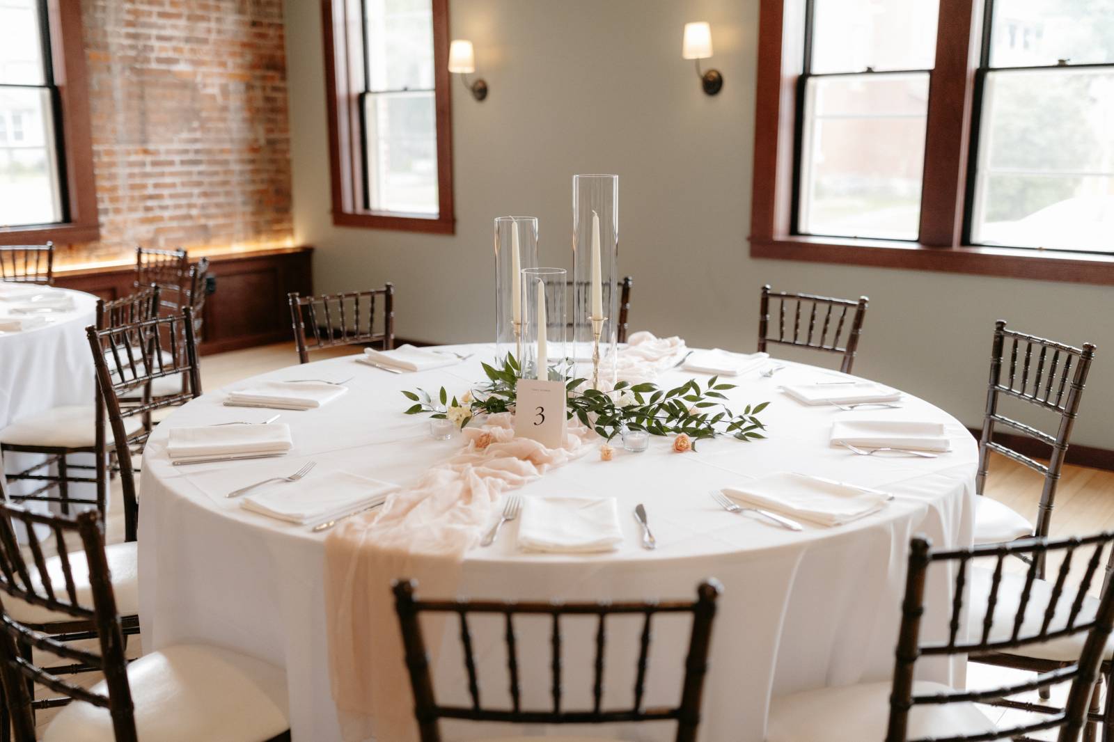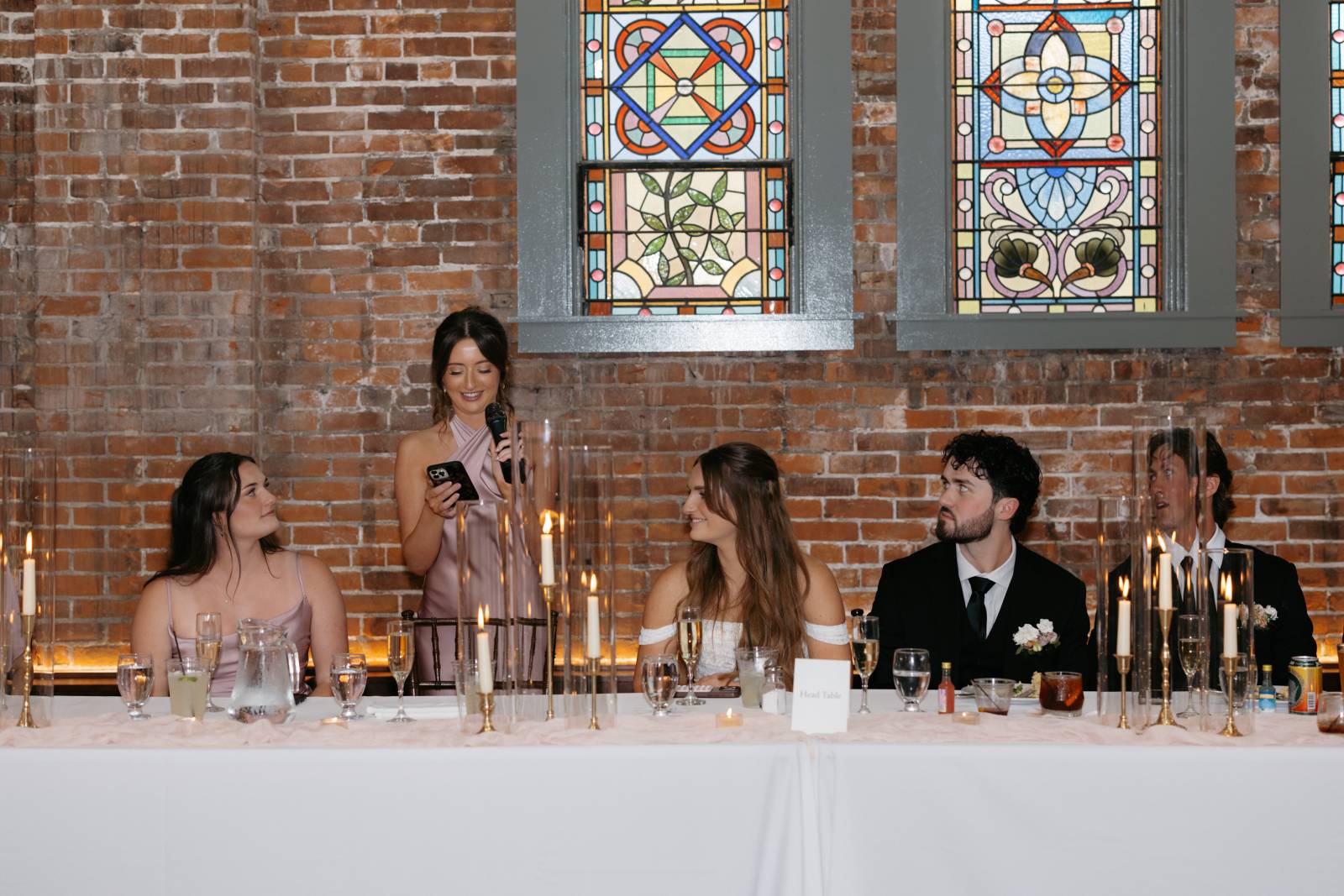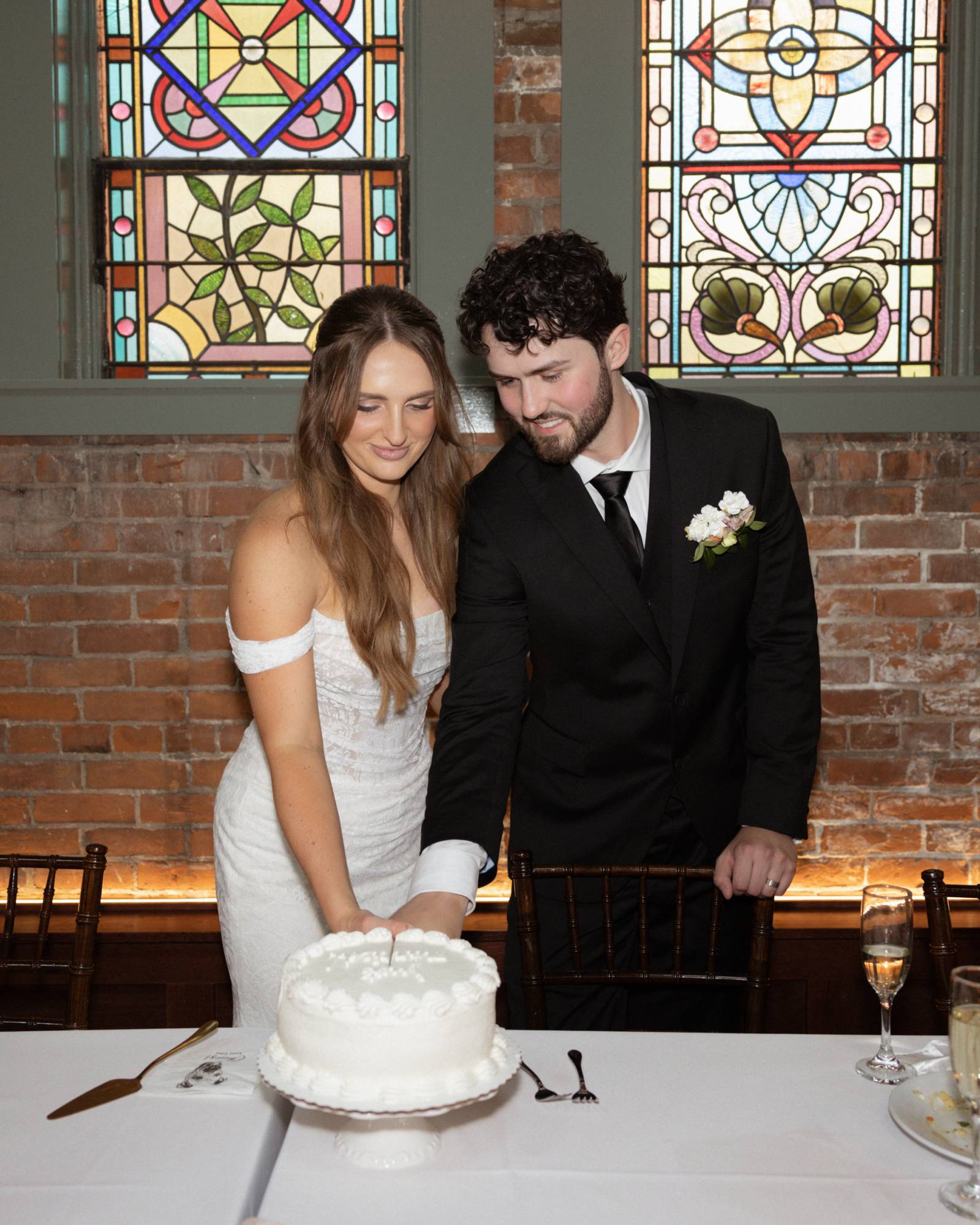 They were lucky enough to find an in-house coordinator at Cappella Weddings & Events, their dream reception venue located in the heart of downtown historic La Crosse. The Capella Ballroom boasts 40-foot cathedral ceilings, exposed brick backdrops, warm lighting, and original 1886 stained glass windows.