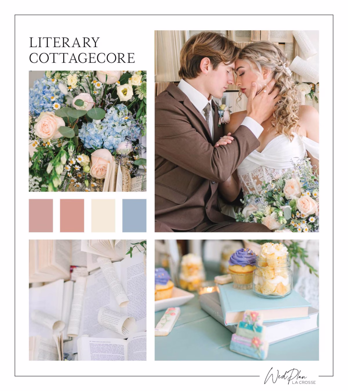 The dreamy Literary Cottagecore color palette is perfect for weddings that aim to step into the pages of a romance novel! Featuring soft pastel pinks, cream, blue, and peach, this palette captures the sweetness of love stories inspired by the works of Jane Austen. It’s ideal for spring or summer celebrations and pairs beautifully with the charm of wildflowers, warm brown accents, and whimsical, fluffy textures.