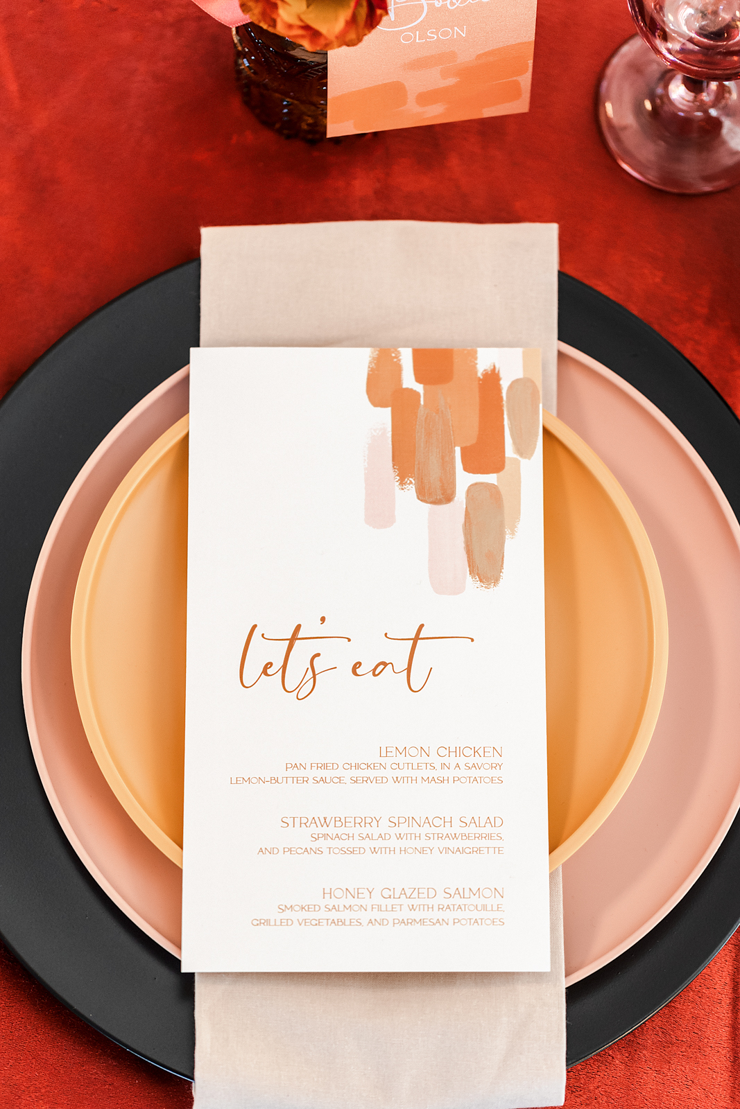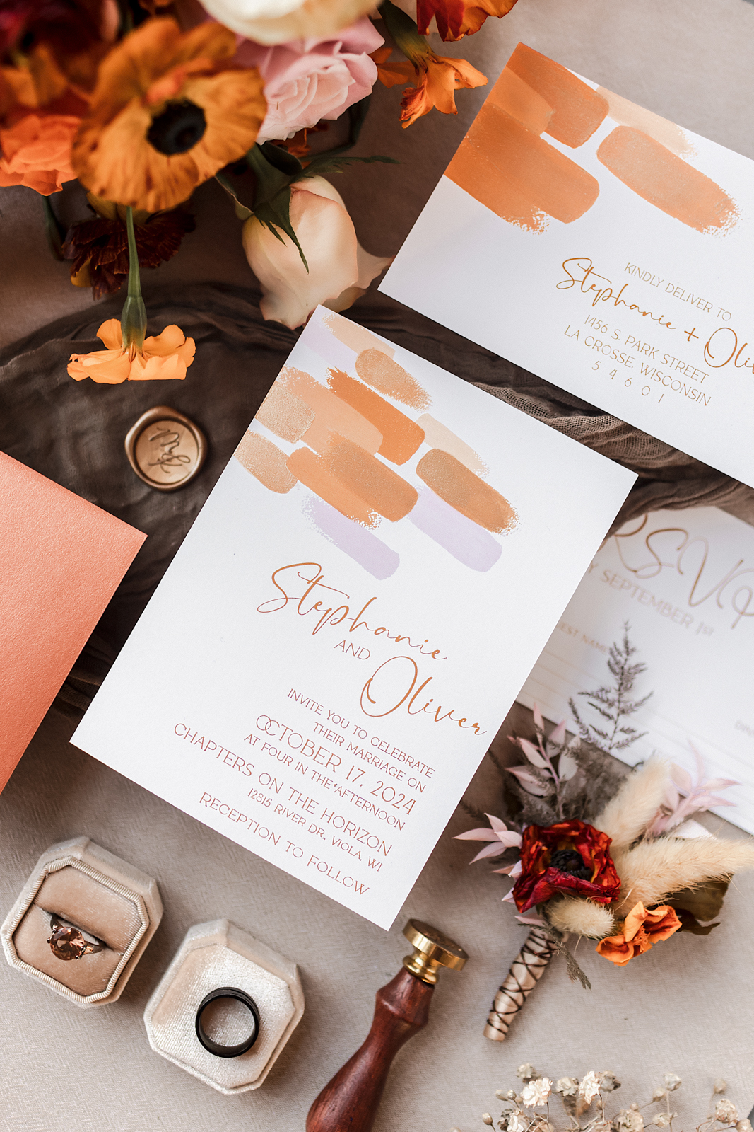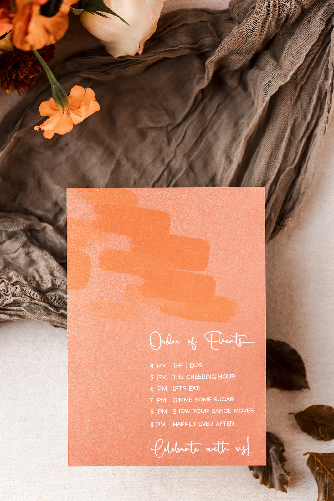 A simple modern invitation suite from LK Bridal Studio is artfully designed with colorful brushstroke detailing, inviting in the warm, orange-hued color palette to come.