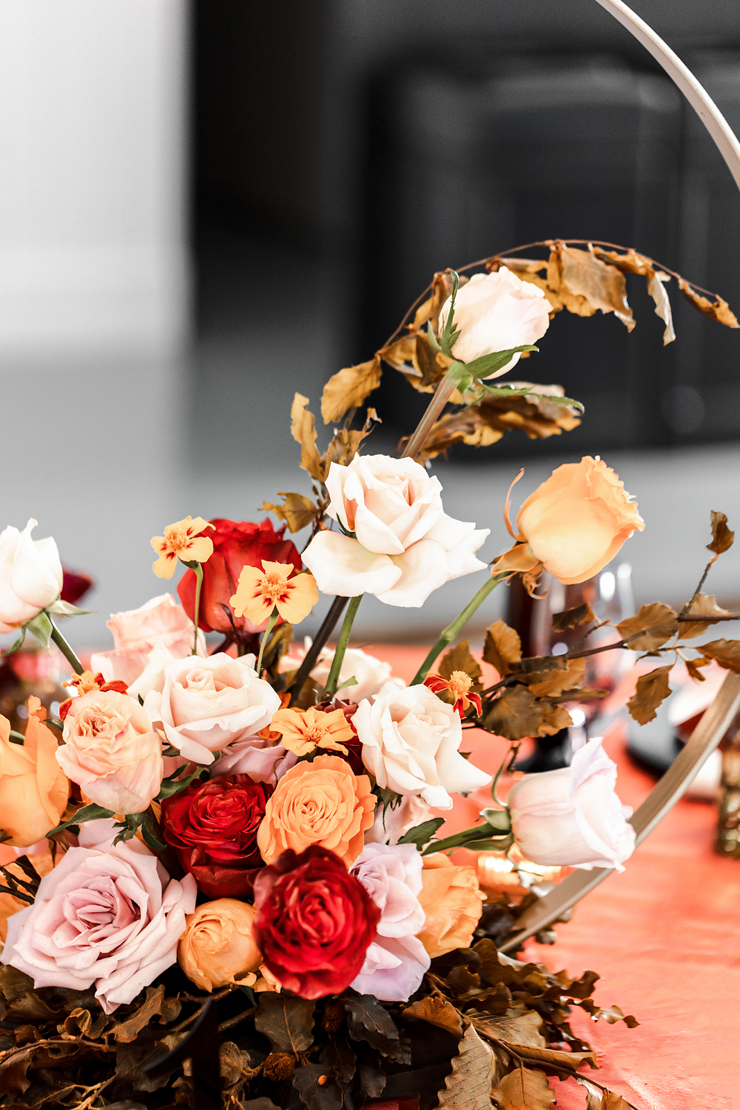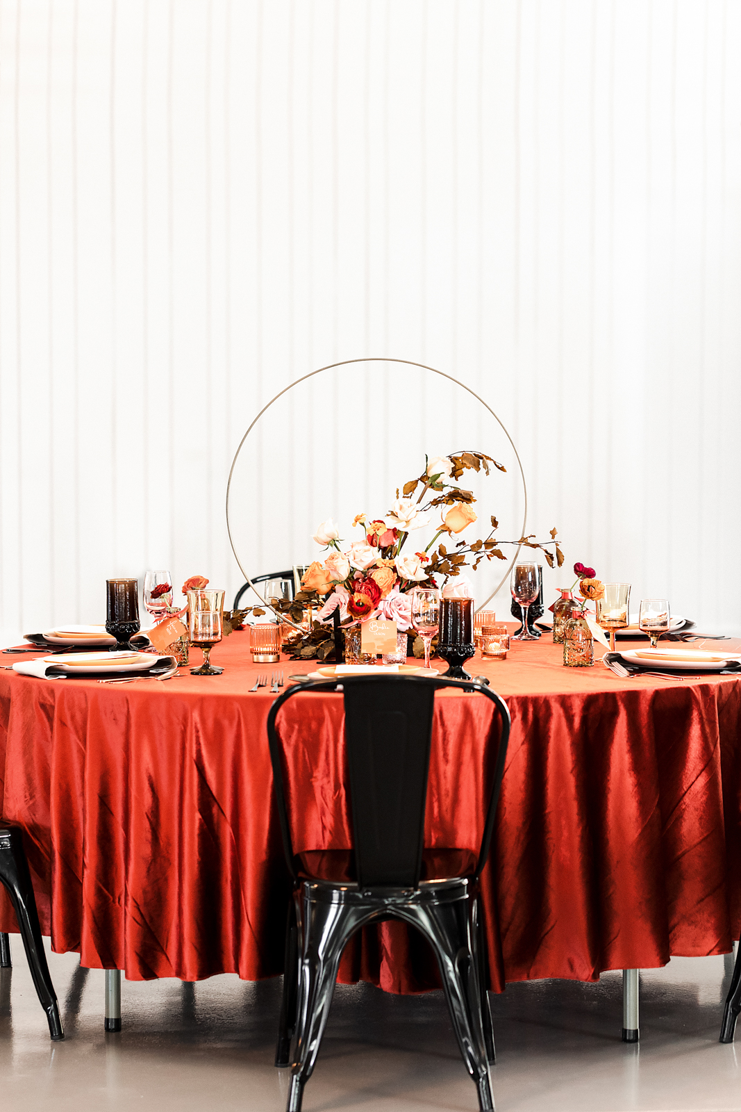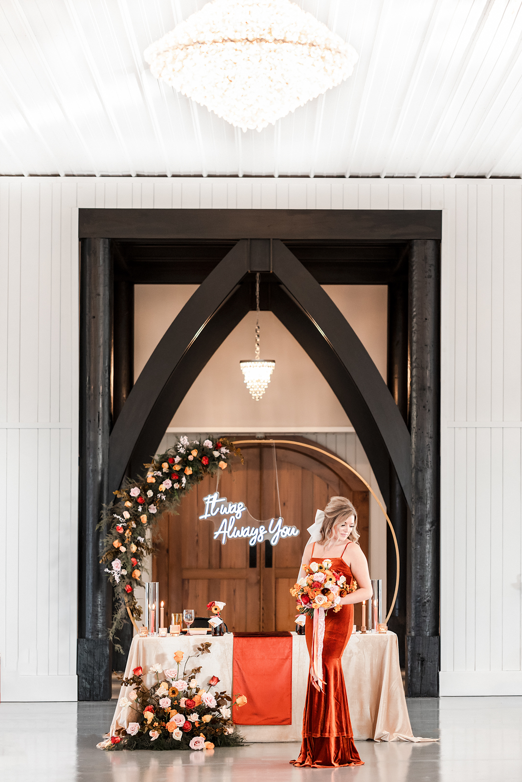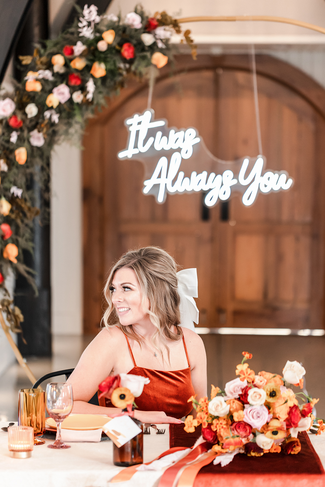 Inspired by the changing colors of Wisconsin’s fall trees, this wedding design features a beautiful autumnal color palette filled with rich oranges, mustards, and the perfect pops of blush, black, and white for a contemporary celebration fit for any season. Captured by Pink Spruce Photography, this shoot is filled with an abundance of stunning floral arrangements from Melody Rose Designs gracing every area of Chapters On the Horizon’s breathtaking southern Wisconsin venue! With LK Bridal Studio and Cowboy David’s Bakery, we can’t wait for you to explore each detail with trendy, non-traditional twists around every corner below.