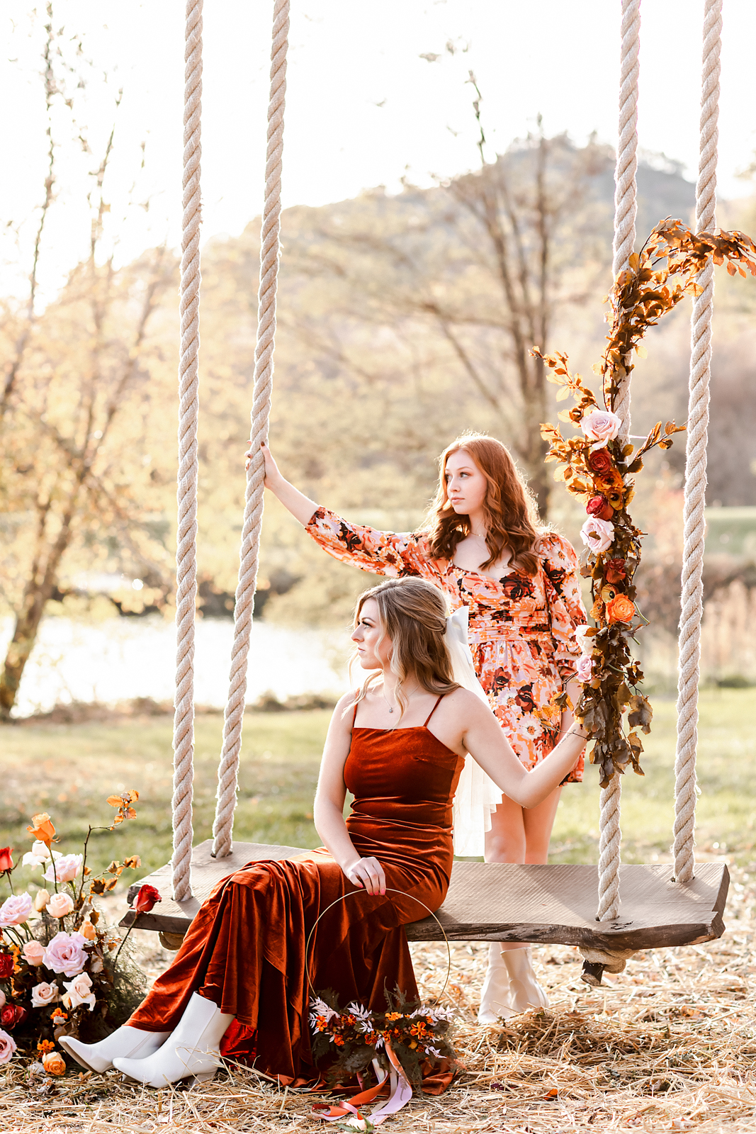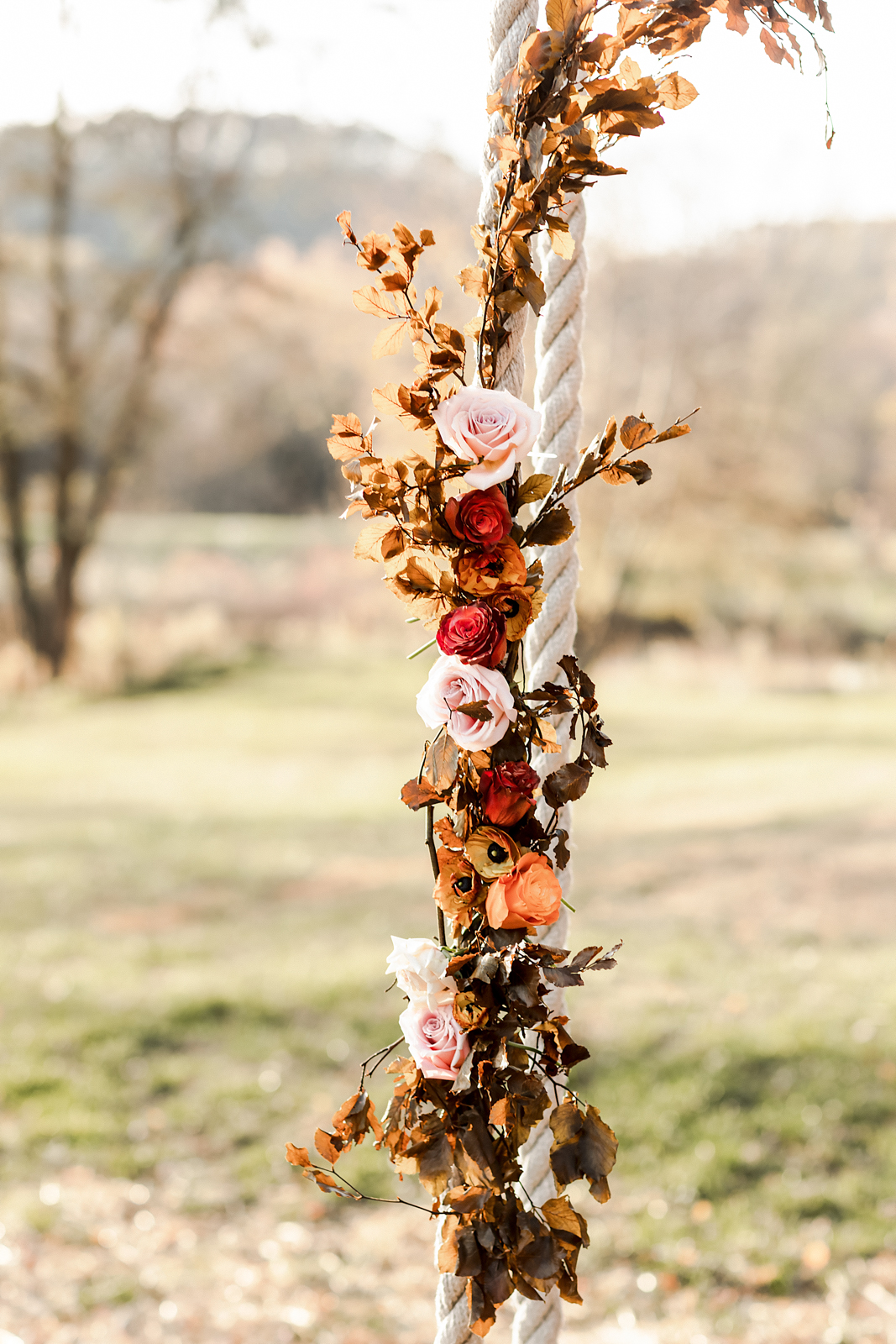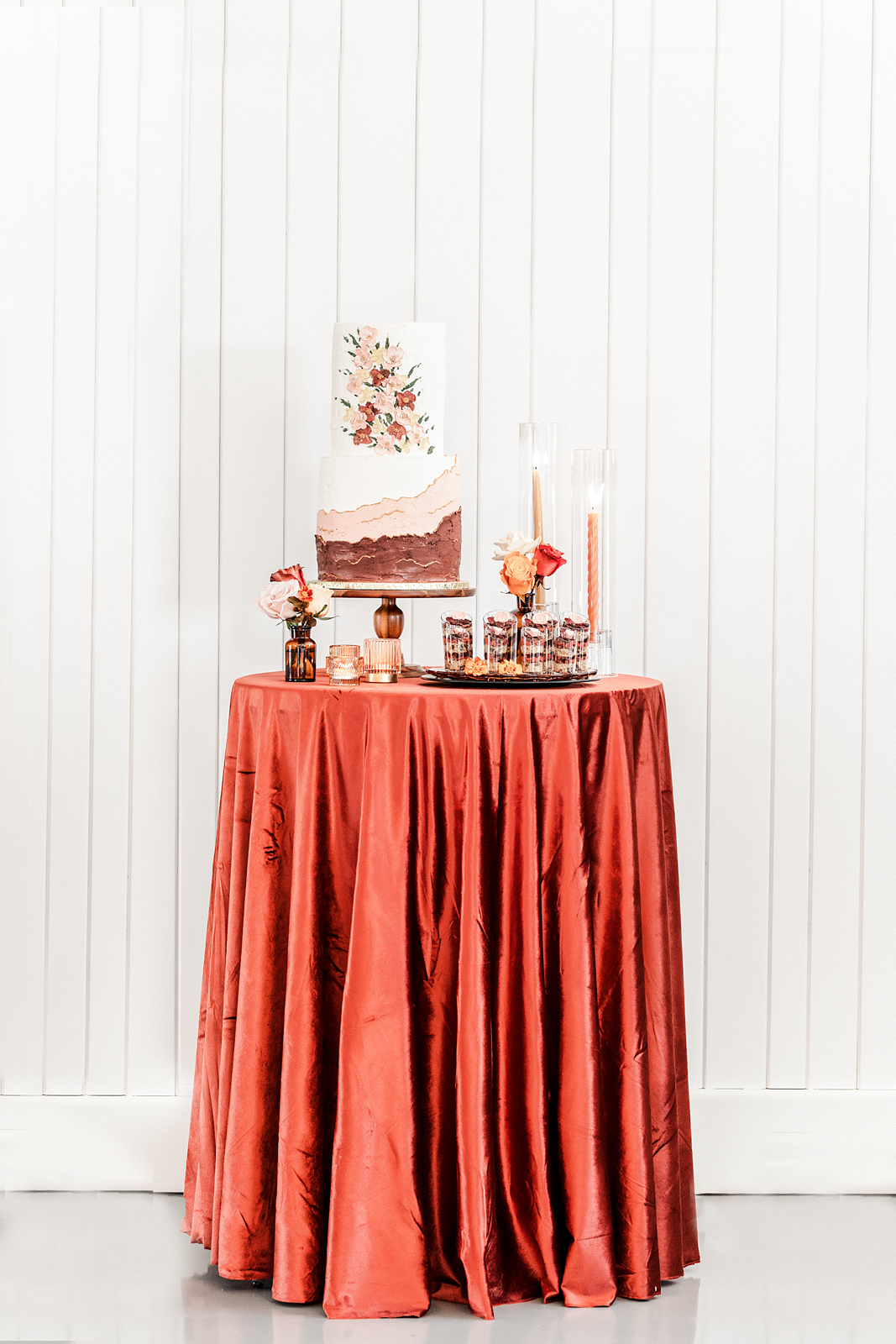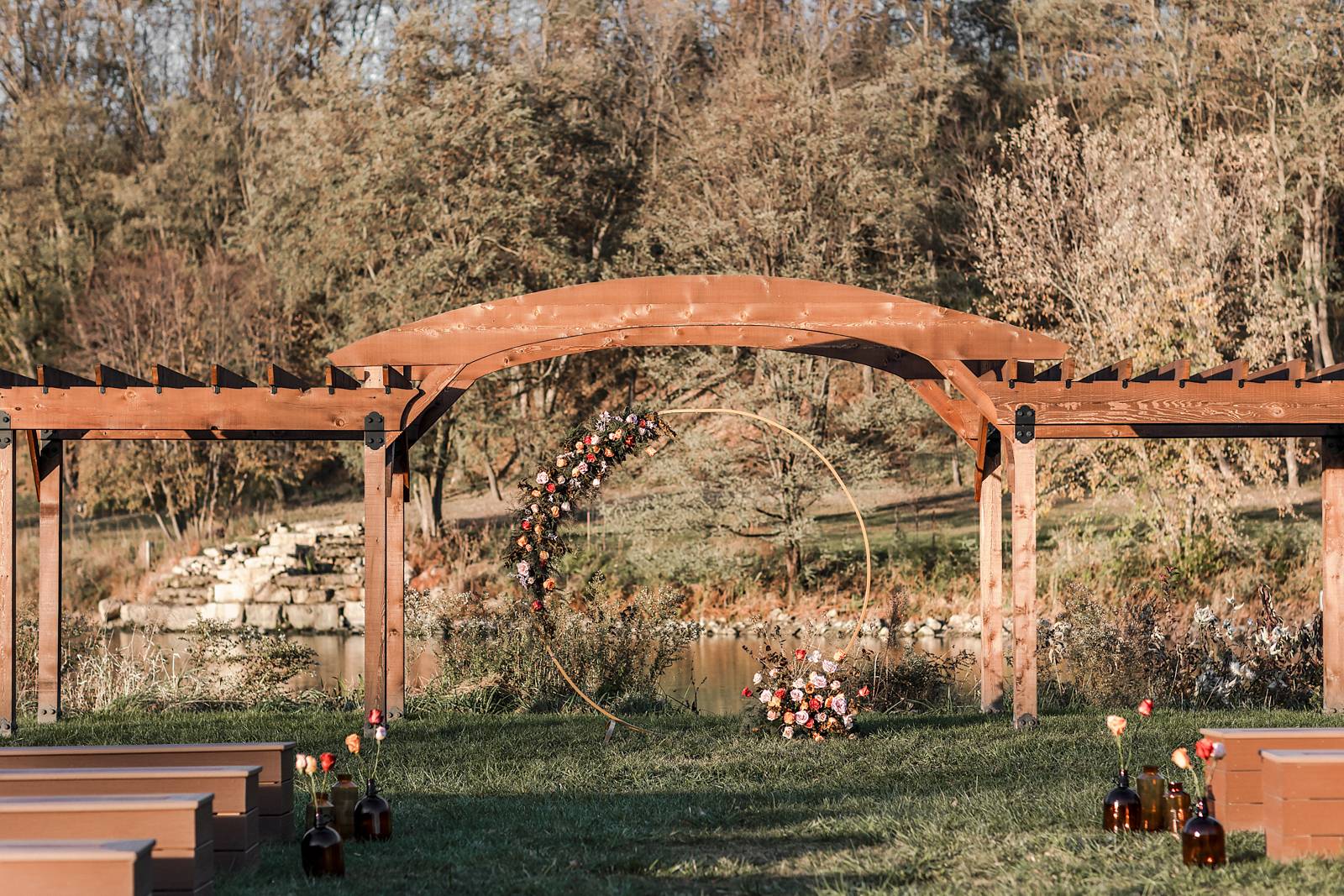 Inspired by the changing colors of Wisconsin’s fall trees, this wedding design features a beautiful autumnal color palette filled with rich oranges, mustards, and the perfect pops of blush, black, and white for a contemporary celebration fit for any season. Captured by Pink Spruce Photography, this shoot is filled with an abundance of stunning floral arrangements from Melody Rose Designs gracing every area of Chapters On the Horizon’s breathtaking southern Wisconsin venue! With LK Bridal Studio and Cowboy David’s Bakery, we can’t wait for you to explore each detail with trendy, non-traditional twists around every corner below.