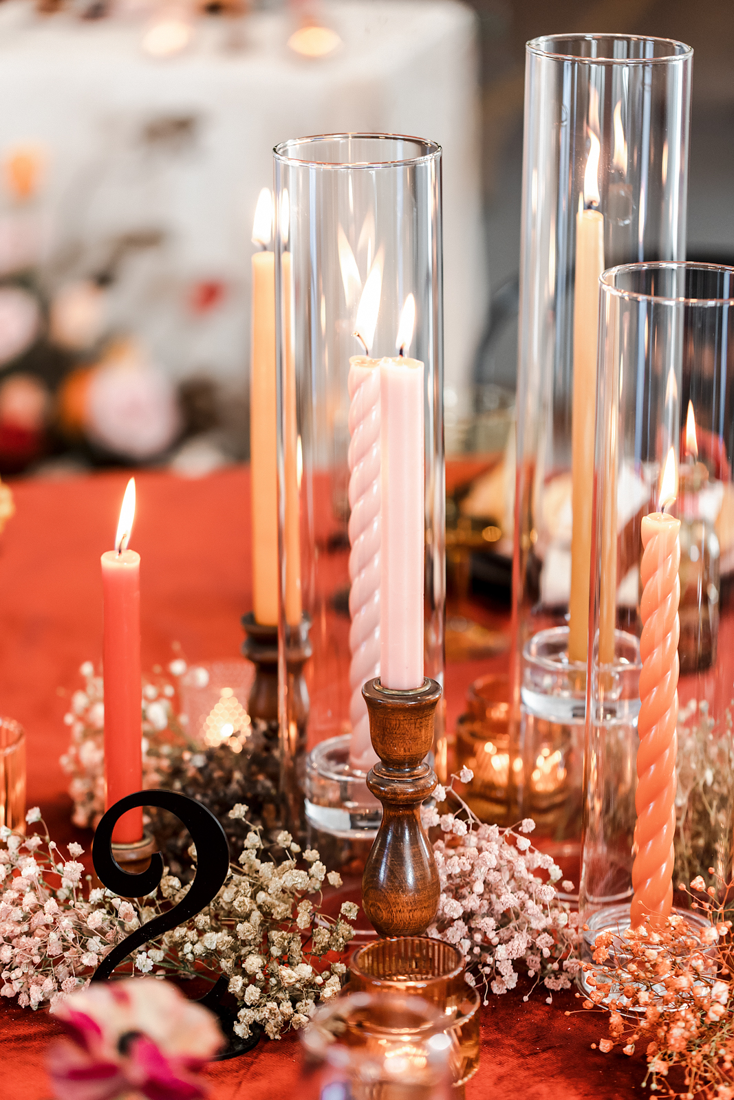 Mixes of modern and vintage decor set the scene for this rich, colorful, and impressive reception look. Black and white details ground this design and play off of Chapters On The Horizon’s stunning main hall, while colored baby’s breath and enchanting blooms from Melody Rose Designs layer in touches of whimsy.