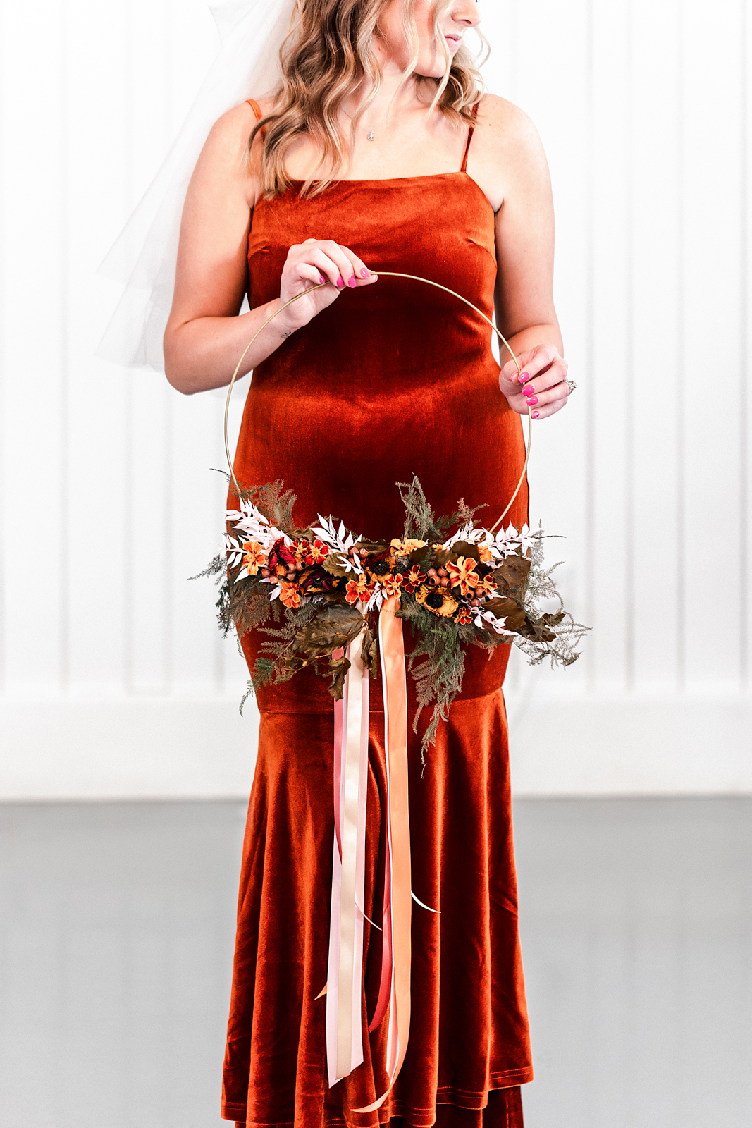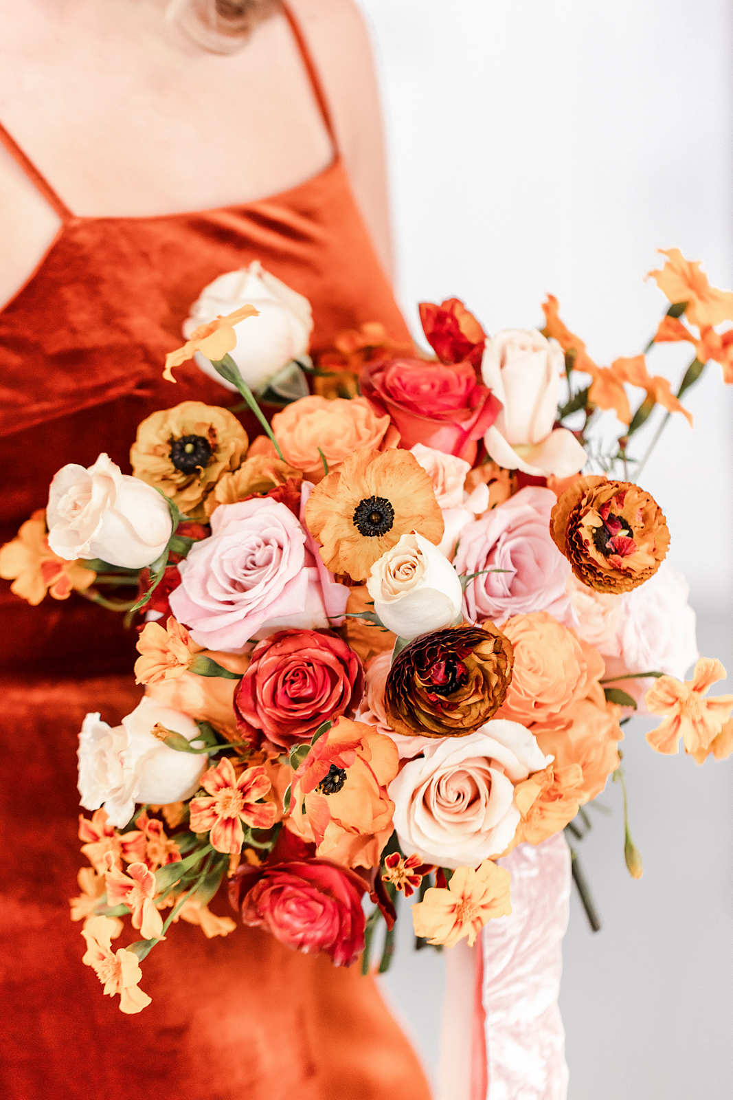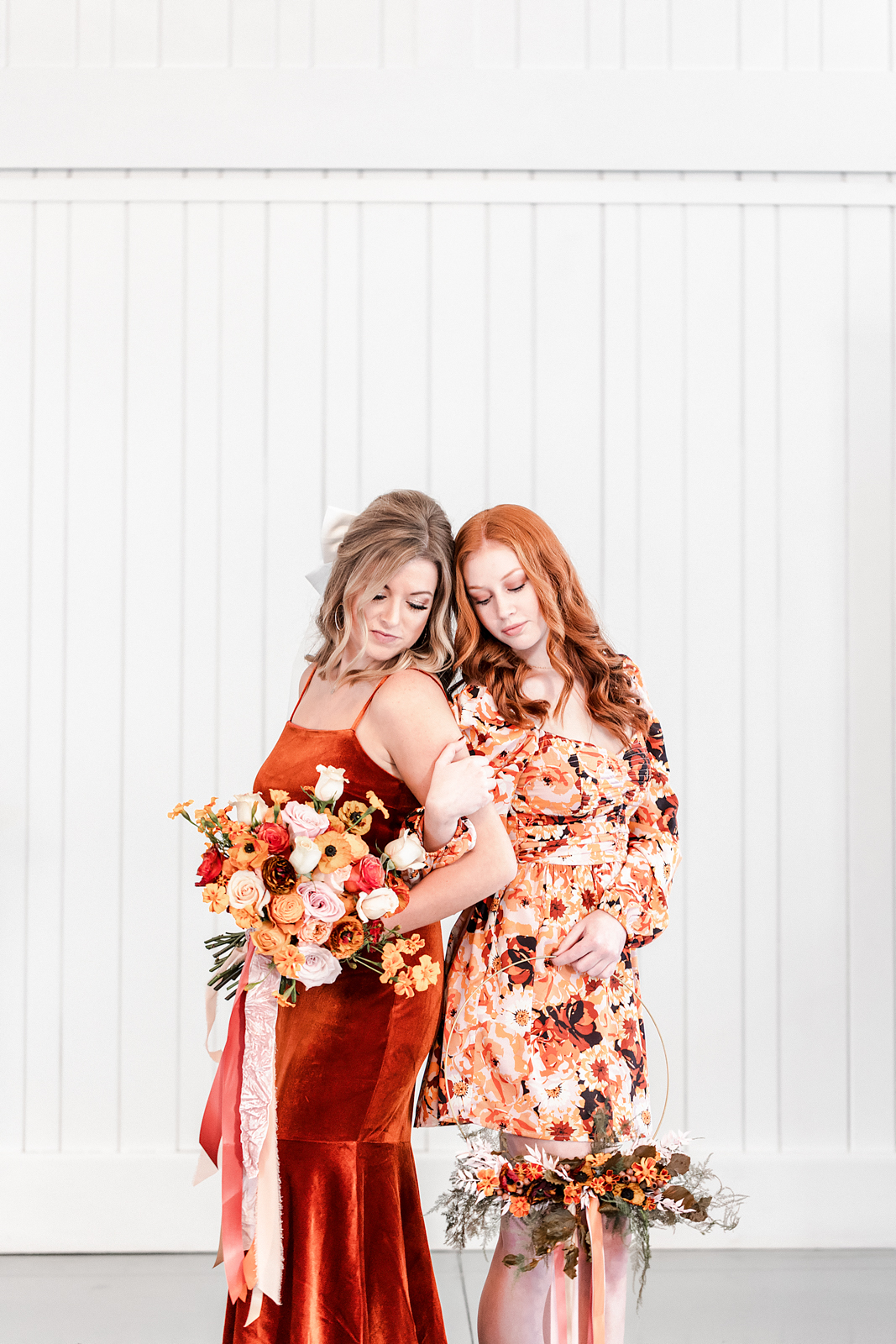 There are no rules when it comes to your wedding day, and we can’t get enough of this non-traditional bride and bridesmaid look! A velvet rust gown accessorized with a modern elbow-length bow veil is perfectly paired with a trendy short floral dress that mimics the colors and flowers used throughout the day’s overall design.