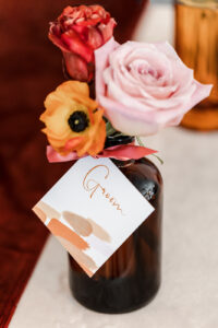There are no rules when it comes to your wedding day, and we can’t get enough of this non-traditional bride and bridesmaid look! A velvet rust gown accessorized with a modern elbow-length bow veil is perfectly paired with a trendy short floral dress that mimics the colors and flowers used throughout the day’s overall design.