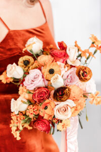 Inspired by the changing colors of Wisconsin’s fall trees, this wedding design features a beautiful autumnal color palette filled with rich oranges, mustards, and the perfect pops of blush, black, and white for a contemporary celebration fit for any season. Captured by Pink Spruce Photography, this shoot is filled with an abundance of stunning floral arrangements from Melody Rose Designs gracing every area of Chapters On the Horizon’s breathtaking southern Wisconsin venue! With LK Bridal Studio and Cowboy David’s Bakery, we can’t wait for you to explore each detail with trendy, non-traditional twists around every corner below.