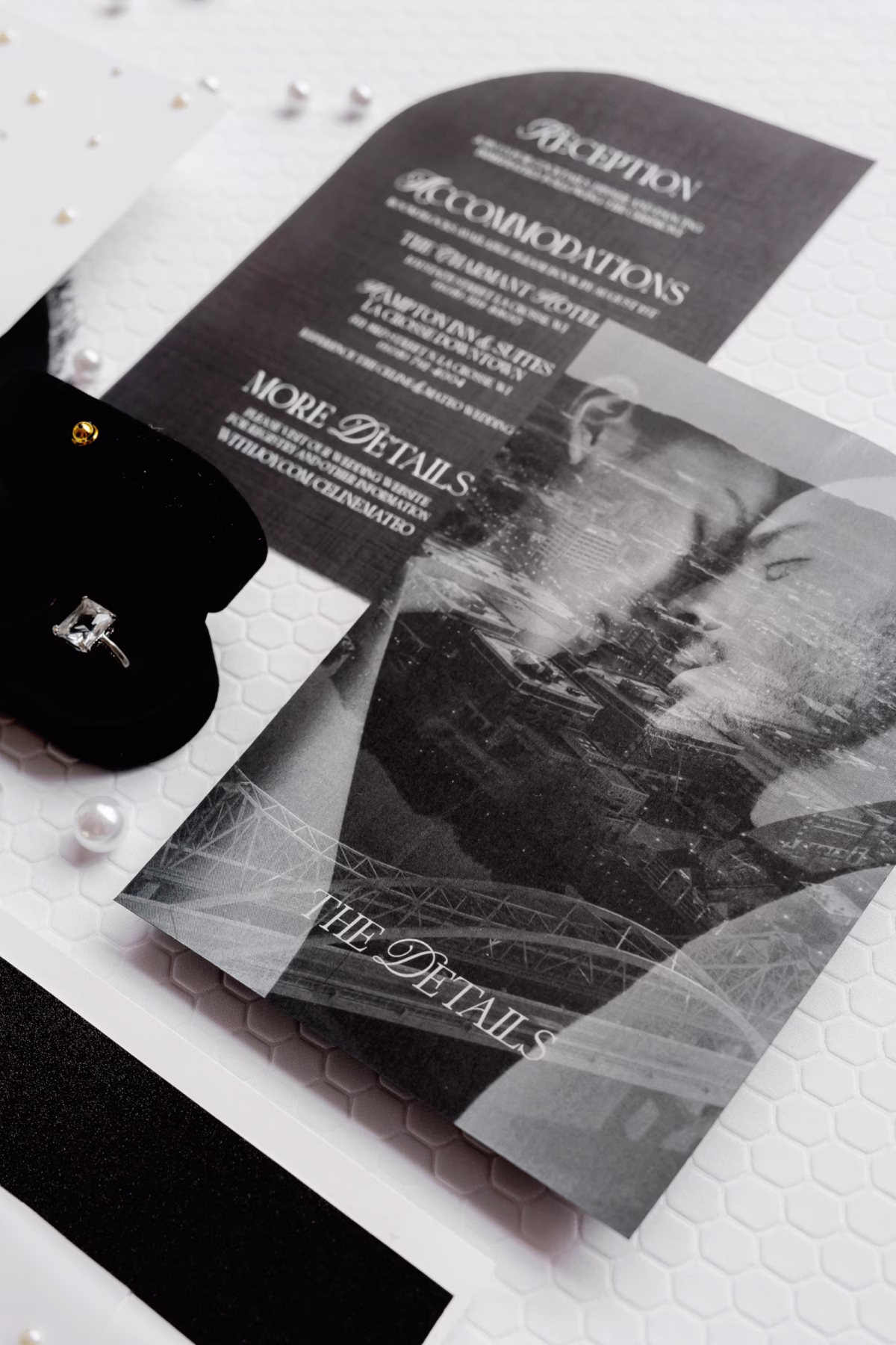 LK Bridal Studio’s stunning, luxurious invitation is wrapped with vellum and closed with an embossed wax seal. The vellum, adorned with carefully placed pearls, opens to reveal several accompanying pieces, including a breathtaking details card featuring a black and white photo of the couple imposed over the Mississippi River Bridge. Pearls also embellish the dinner menu, and unique circular guard cards fit neatly on glasses of champagne. An elegant vellum program playfully named “The Newlywed Post,” resembling a newspaper, adds an entertaining and sophisticated touch.