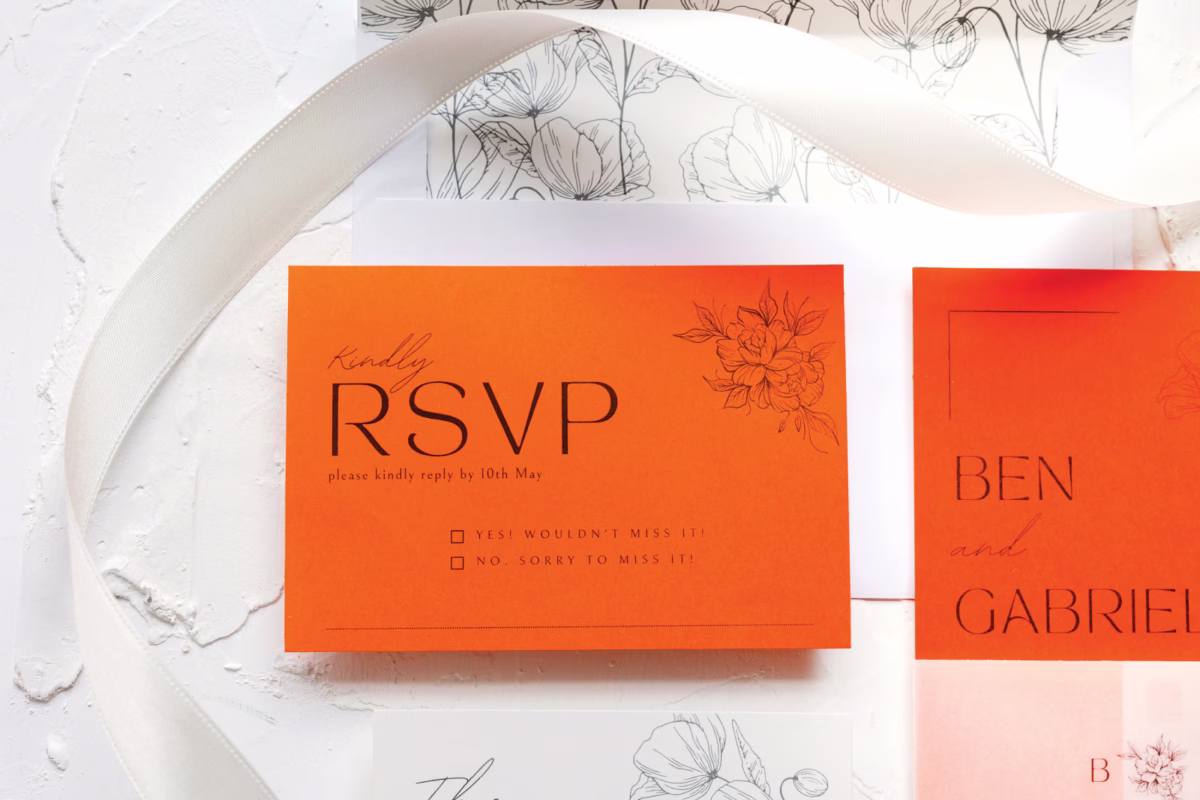 Whimsical Design & Decor’s invitation suite features a delightful blend of white and apricot crush colors, accented with black for a modern twist. A monogrammed vellum band with a dainty wax seal encloses this vibrant invitation suite. Delicate floral illustrations and thin contemporary lines adorn the individual pieces, from the monogram and invitation to the reply card and the striking envelope liner.