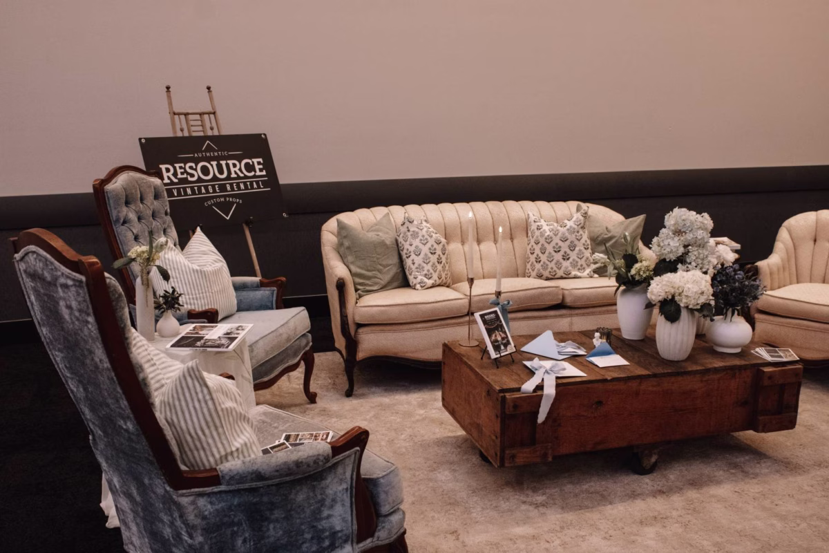 The bar and lounge area provided a stylish and inviting space for guests to relax and take in the excitement of Wedding World La Crosse. Overlooking the riverfront, the space featured chic high cocktail tables and stools from Resource Vintage Rental and lounge furniture from the La Crosse Center. DJ Brettly set the mood with expertly curated music, making it the perfect spot to unwind, sip a drink, and soak in the wedding inspiration all around.