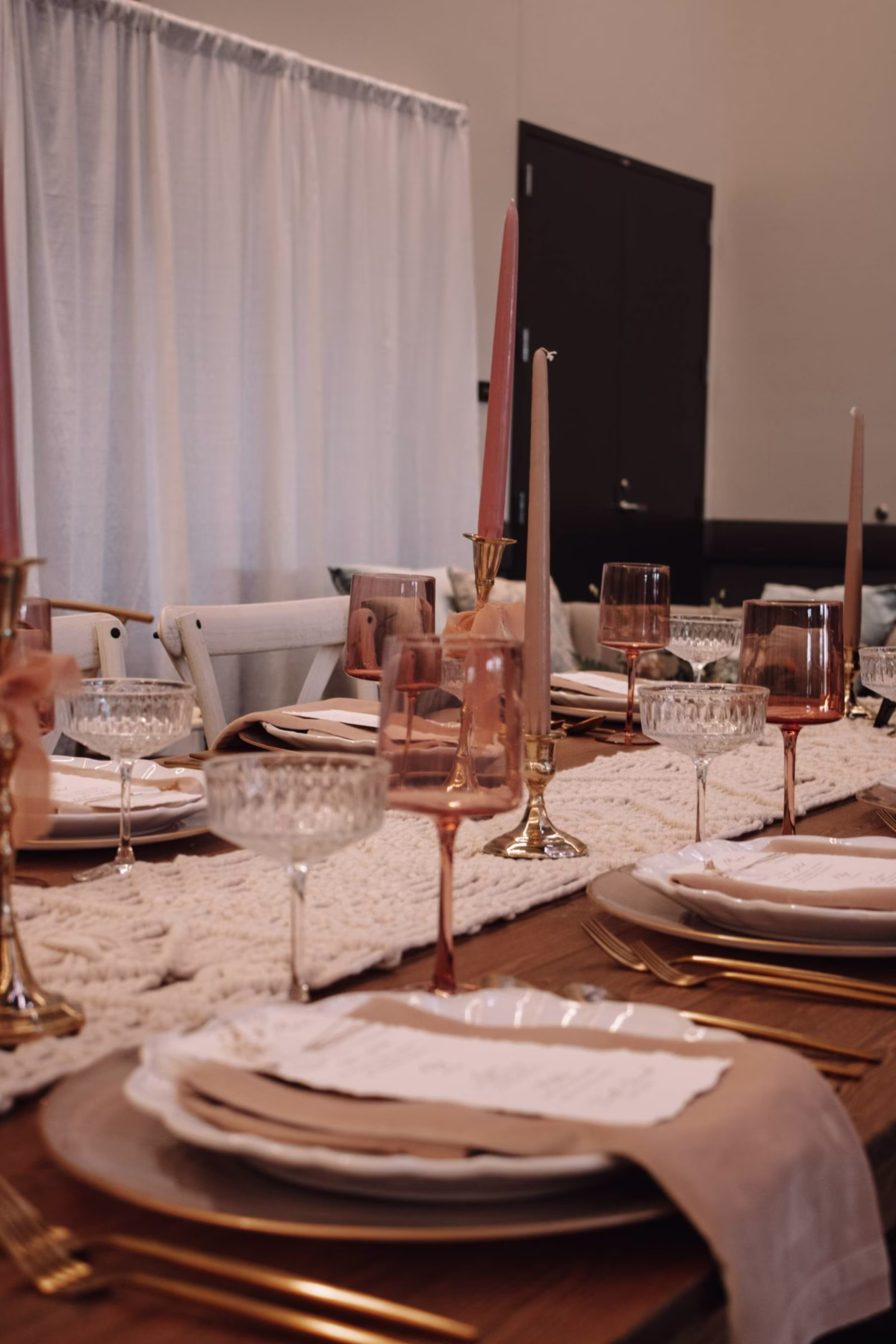 The ceremony space featured a macrame backdrop, with the bride in a delicate strapless lace dress, and the groom in a textured brown suit from Charlotte's Bridal & Formal Wear. The wooden reception table also incorporated woven textures, and a velvet lounge seating area completed the space.