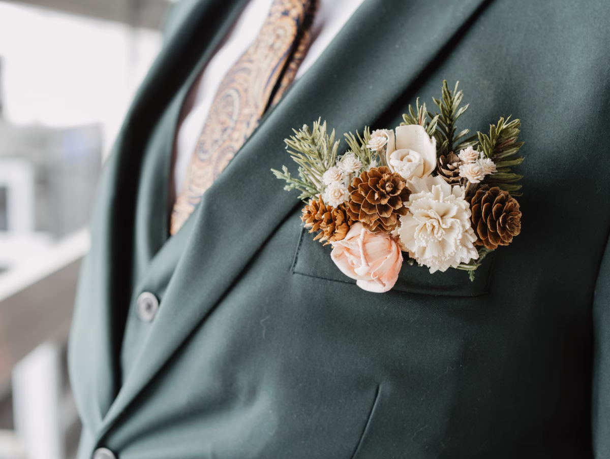 Nikki’s mom also assisted with florals for the day. Instead of traditional blooms, she hand-dyed wood florals for bouquets, boutonnieres, and décor. She even gathered pinecones to sprinkle throughout, as a nod to the season.