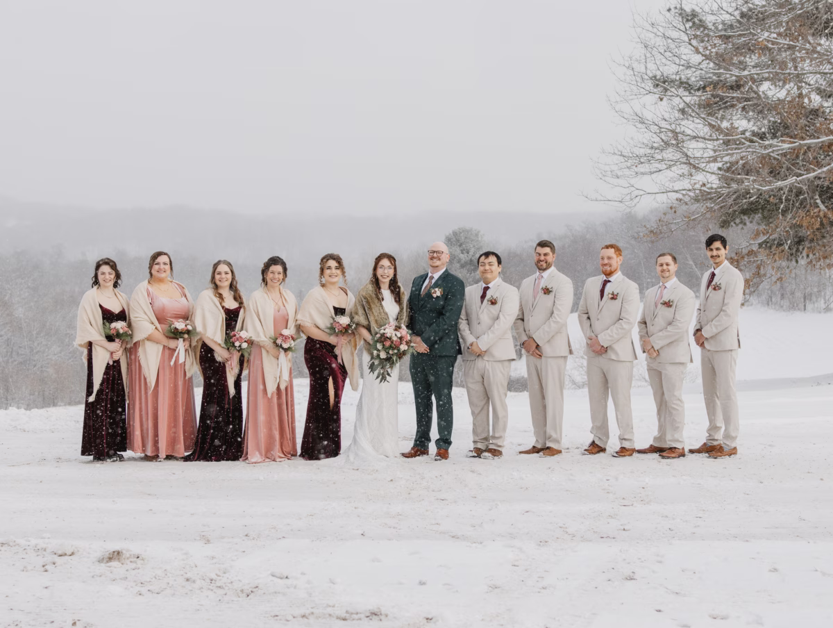 Despite her injury, Nikki still has a love for skiing and snow. There was no snow predicted for their winter wedding, so the couple was delighted when a beautiful blanket surprised them just in time for photos. Abigail Peters Photography fully embraced the unexpected weather, racing outside with the couple and their wedding party to capture the whimsy of the gently falling snow.