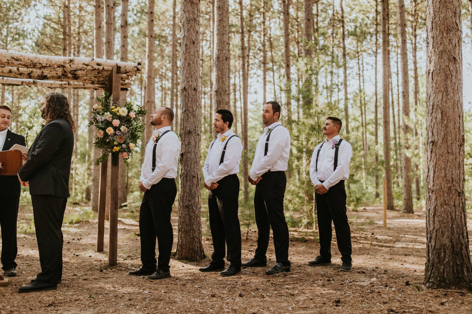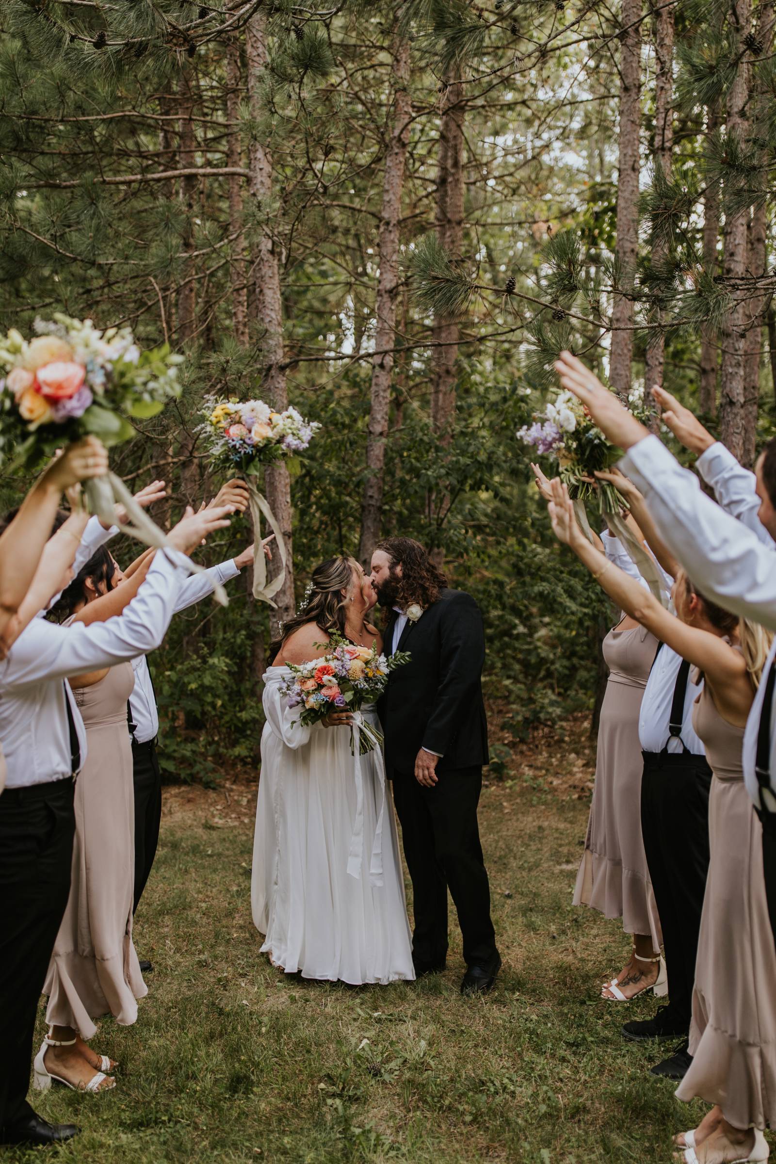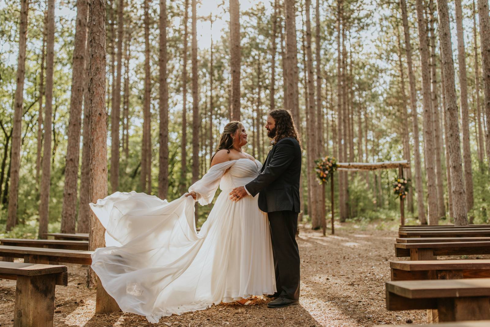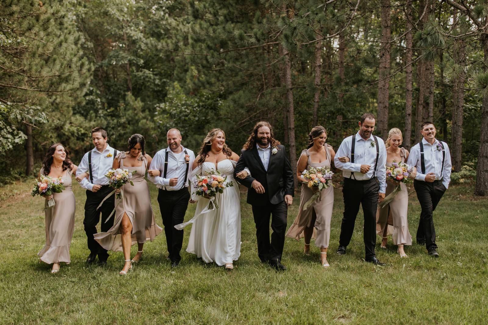 These two celebrated their love on a beautiful August day tucked in the Wisconsin woods at Burlap & Belles’ venue in Black River Falls, surrounded by the romance of the pines, the love of their friends and family, and the whimsy of wildflowers gracing every corner.